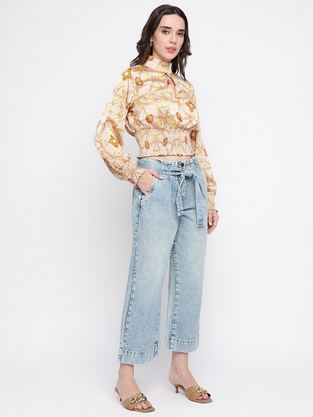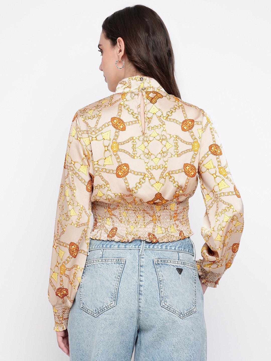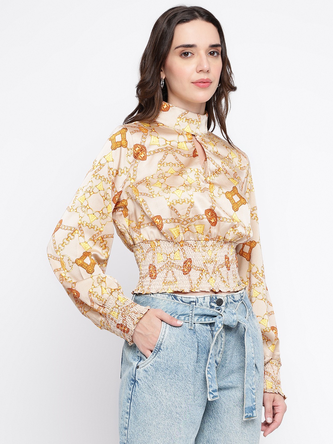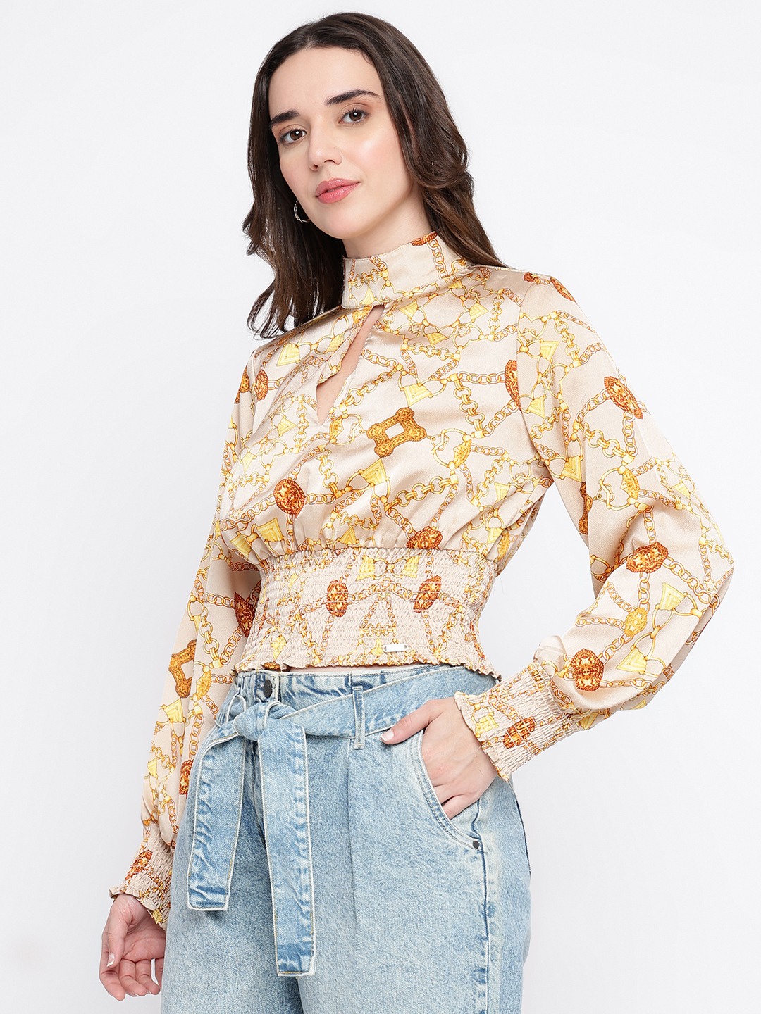 Elevate your wardrobe with our chic beige top, designed for the modern woman who values both style and comfort. Crafted from 100% premium cotton, this top offers a breathable and soft touch against your skin. The regular fit ensures a flattering silhouette, while the full sleeves and high neck add a touch of sophistication. Adorned with a subtle printed pattern, it exudes elegance. The button closure adds a classic finish, making it perfect for both casual outings and formal gatherings. Embrace timeless fashion with this versatile piece.