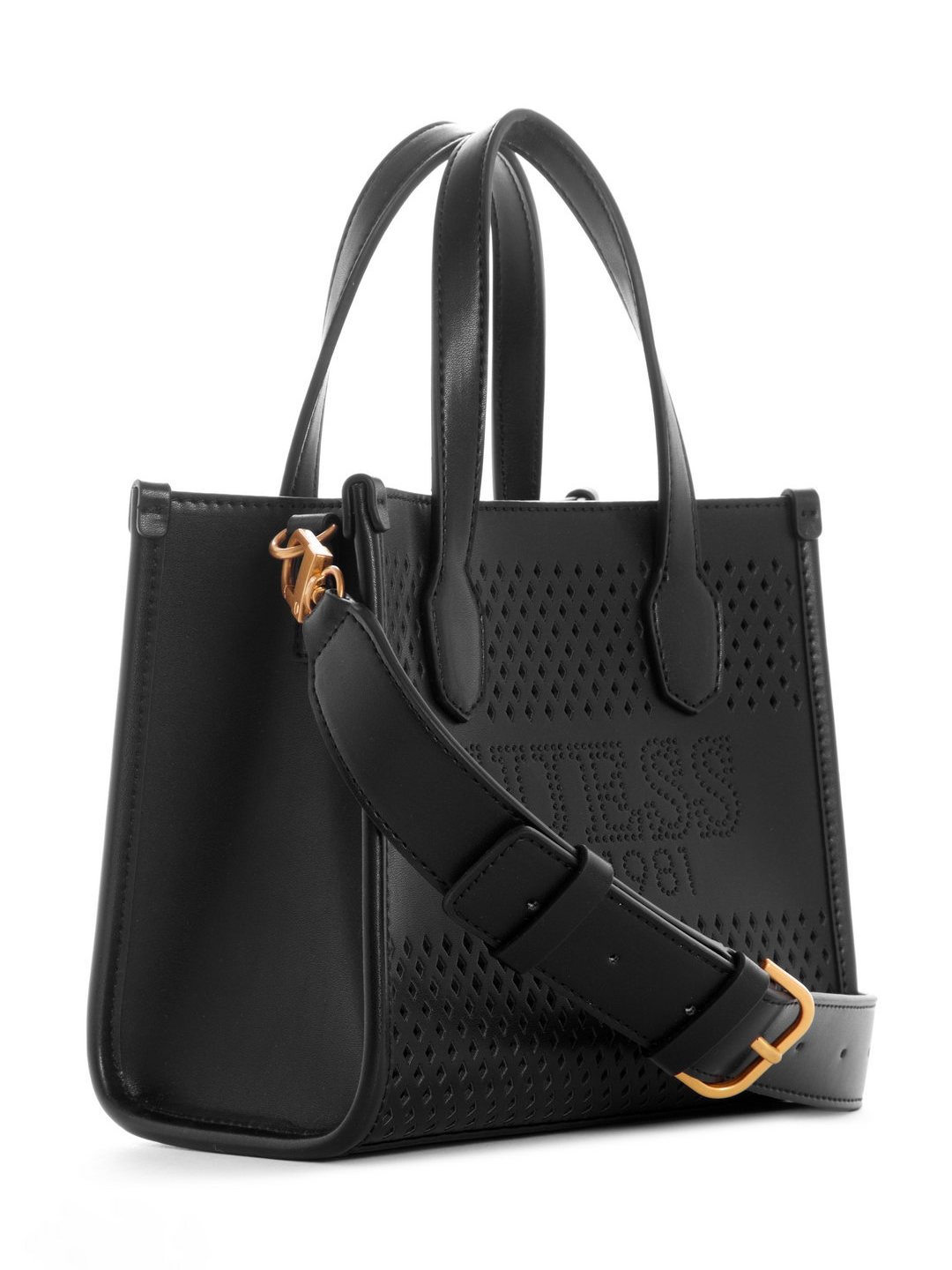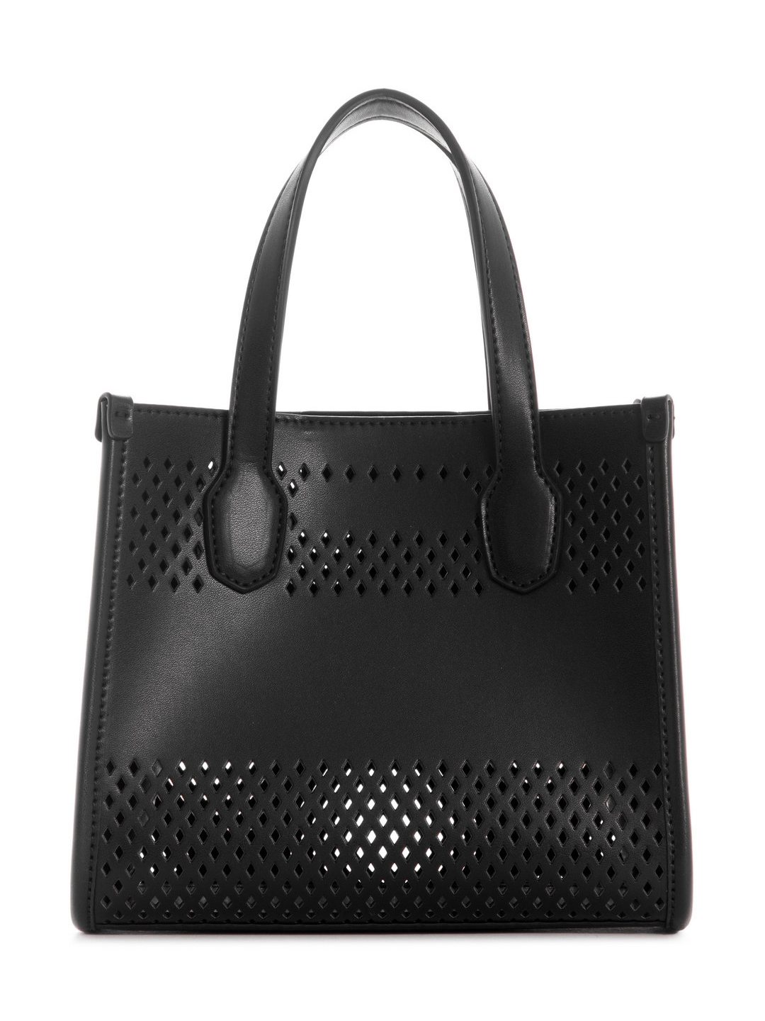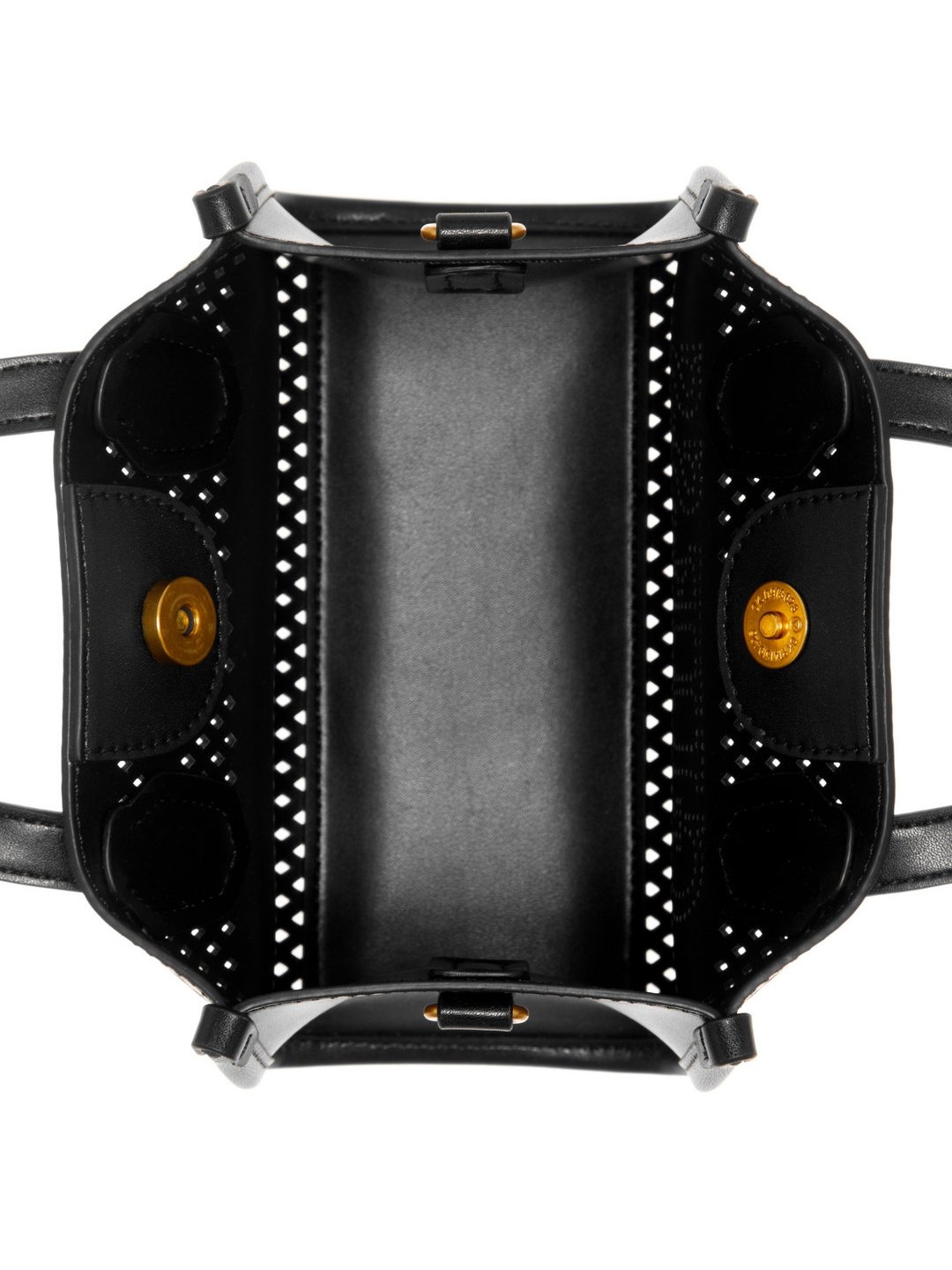 The katey perf mini tote bag in black is a stylish and versatile accessory for women. Crafted from durable pu fabric, it offers a sleek look and easy maintenance. The cutwork pattern adds a touch of elegance and uniqueness to the design. Perfect for daily use or special occasions, this mini tote provides ample space for essentials while remaining compact and lightweight. Its sturdy handles ensure comfortable carrying. Elevate your everyday style with this chic and functional bag that combines fashion with practicality. A must-have addition to any wardrobe.