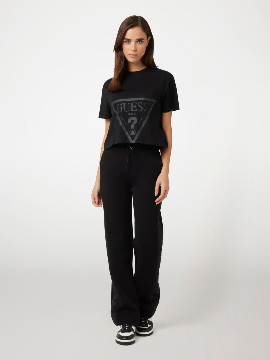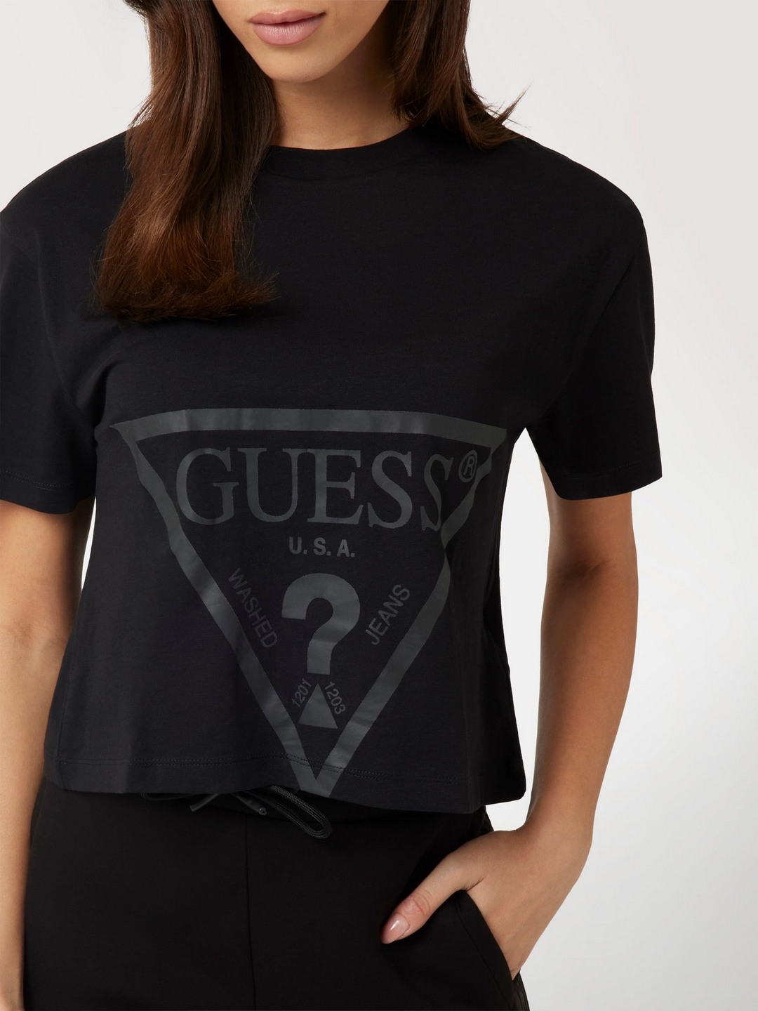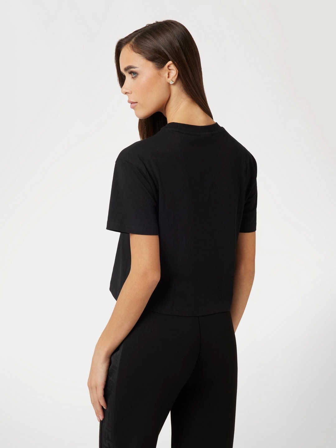 Elevate your casual style with this sleek black women's T-shirt, featuring a timeless round neck and comfortable regular sleeves. Crafted from pure cotton, it offers breathability and softness for all-day wear. The eye-catching brand logo pattern adds a touch of sophistication and modern flair, making it perfect for any occasion. Its short sleeve design ensures ease of movement, while the classic black hue pairs effortlessly with your favorite jeans or skirts. A versatile wardrobe essential that combines comfort with chic appeal.