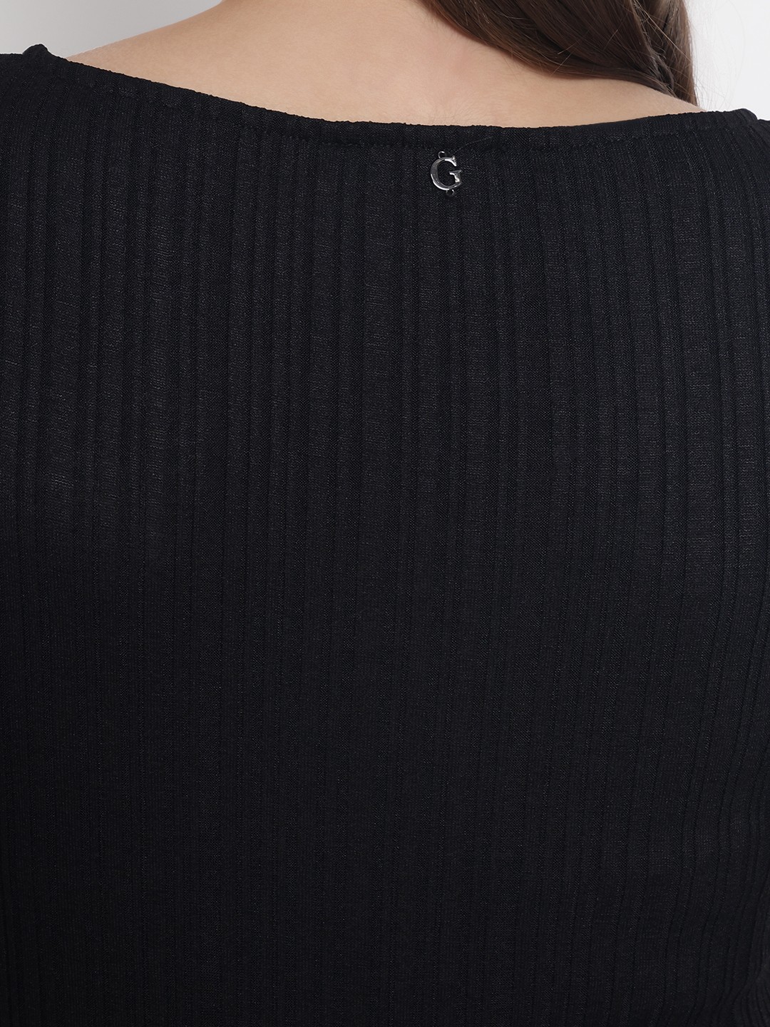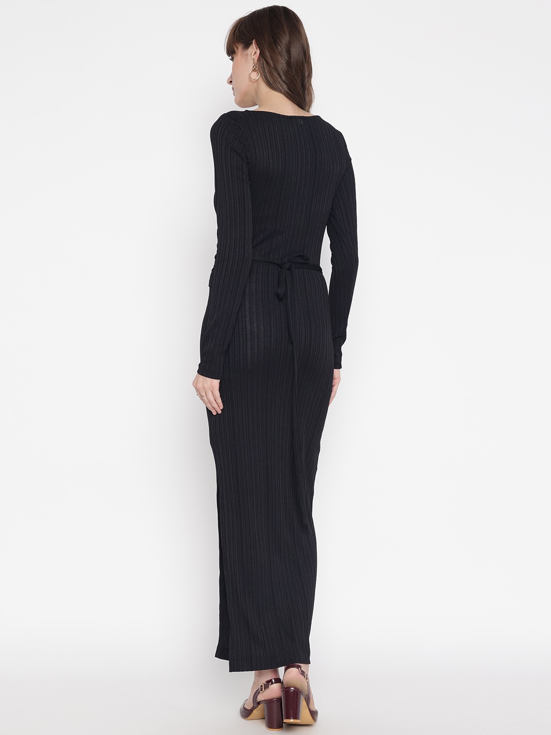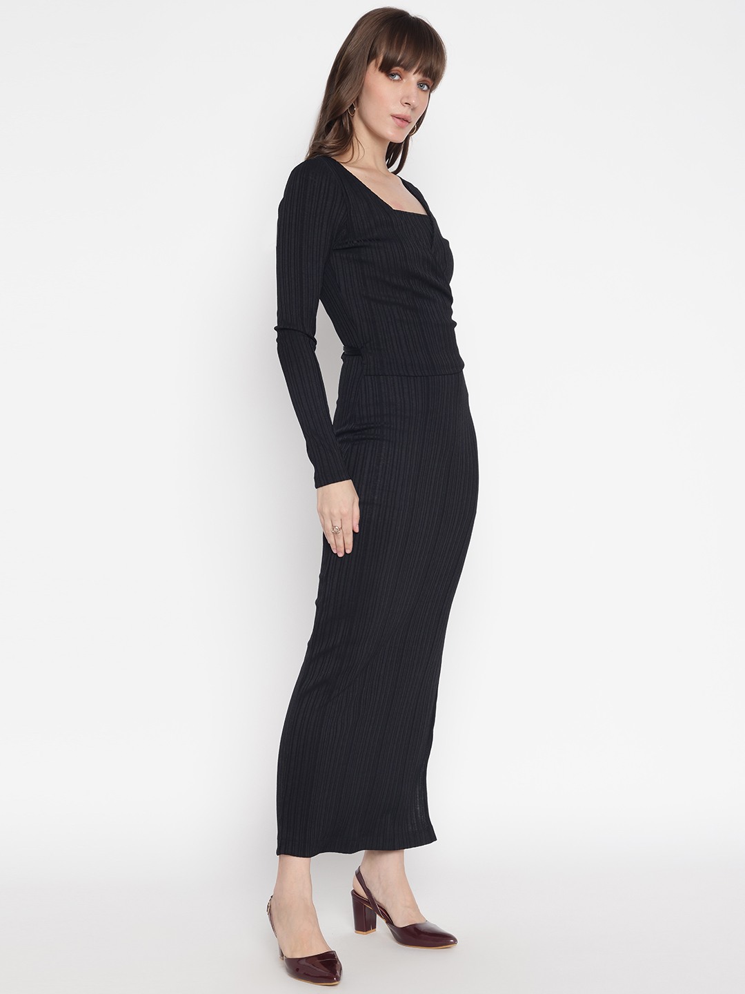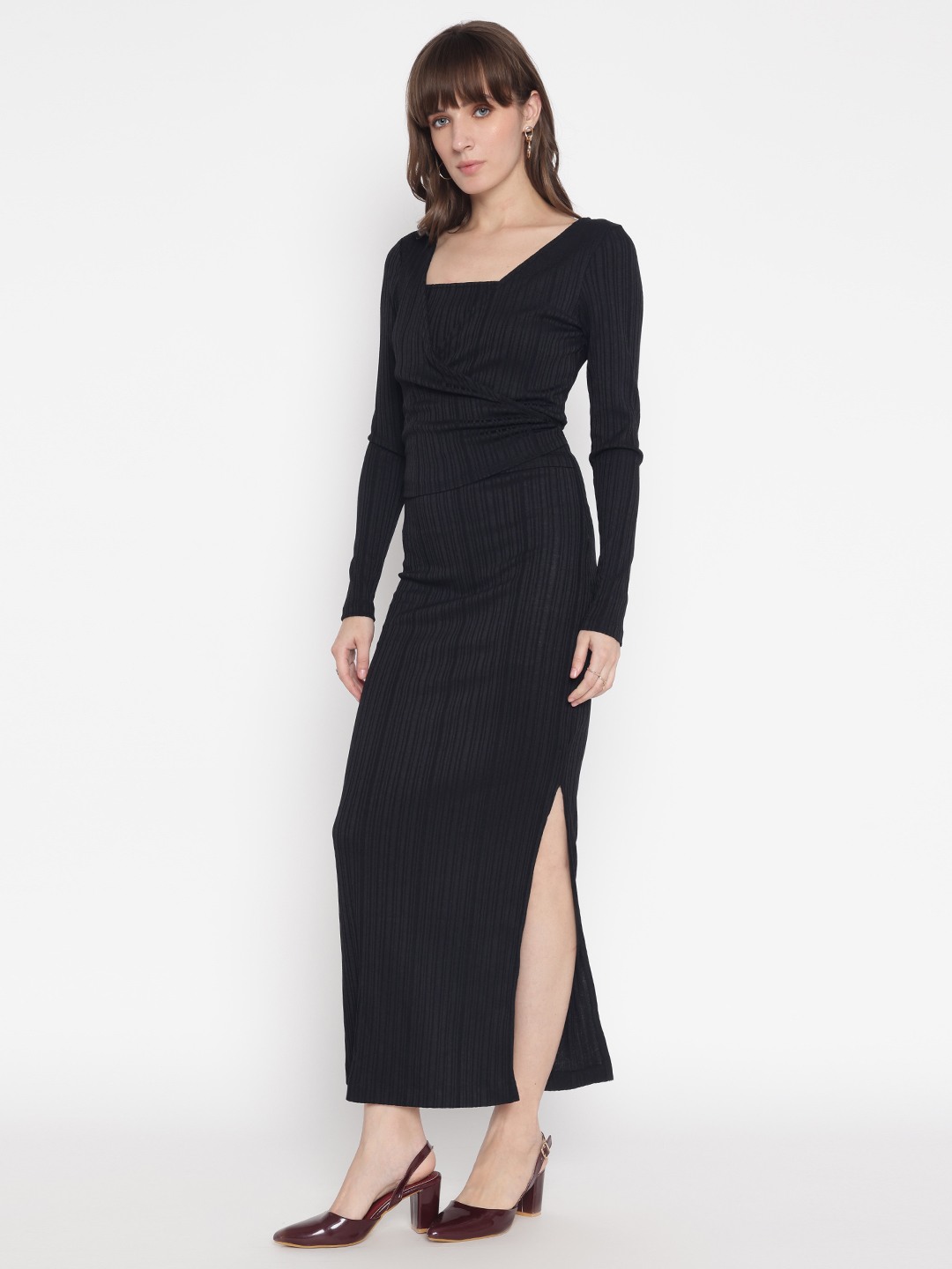 Elevate your wardrobe with this stunning black dress, designed for the modern woman who appreciates both style and comfort. Crafted in a luxurious ribbed pattern, this dress features a flattering regular fit that effortlessly complements your silhouette. The elegant square neck adds a touch of sophistication, while the full sleeves provide a chic, timeless appeal. Made from a high-quality blend of 95% polyester and 5% elastane, it offers a perfect stretch for all-day comfort. The tie-up closure adds a playful, customizable touch, making it ideal for any occasion. Whether you're heading to a dinner date or a casual outing, this dress is your go-to choice for effortless elegance.