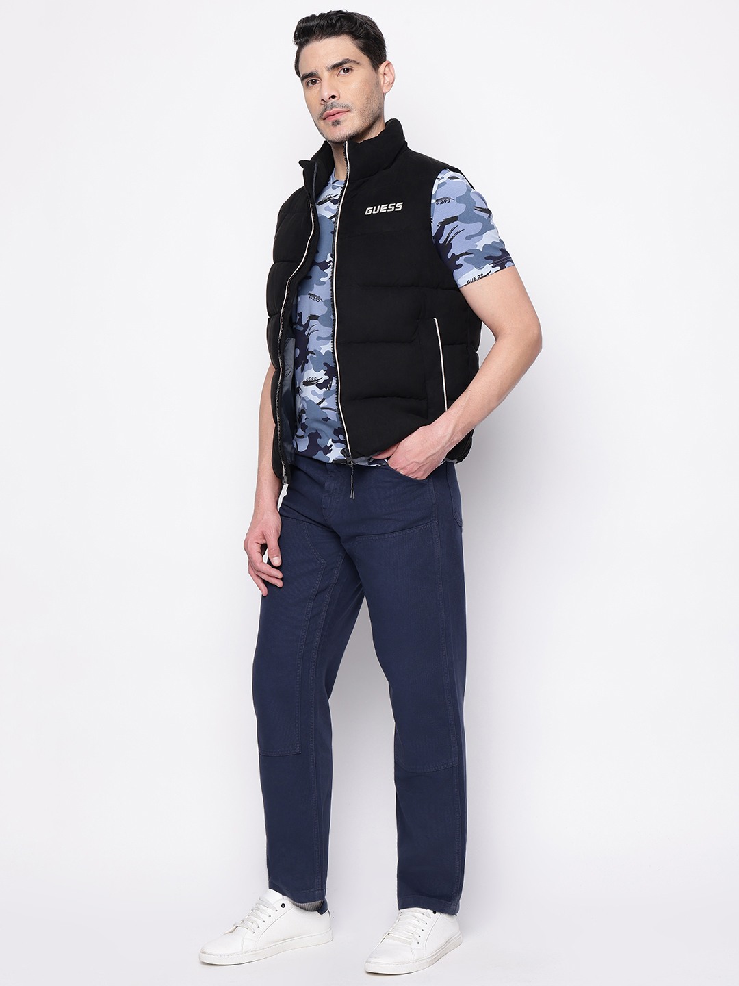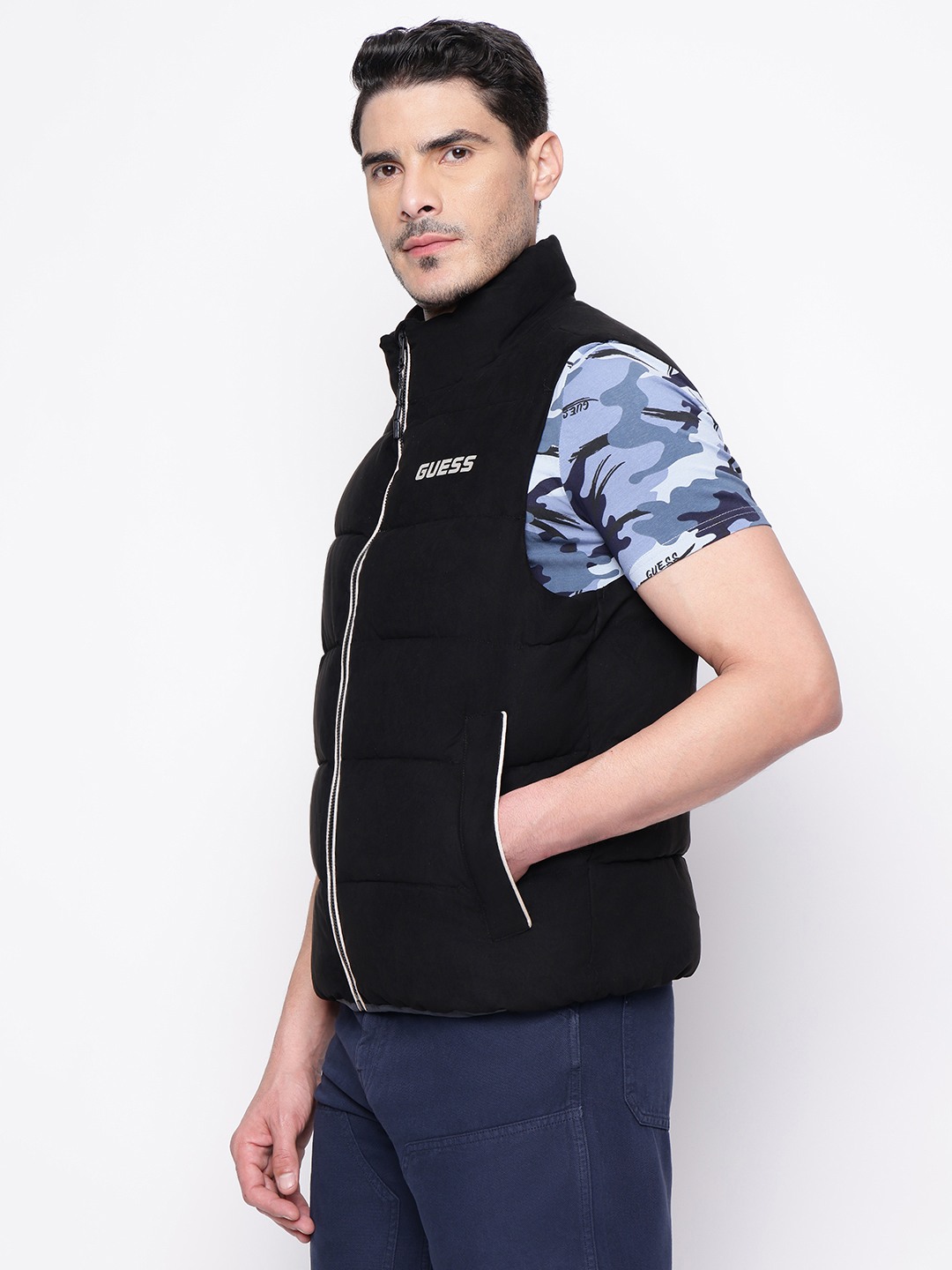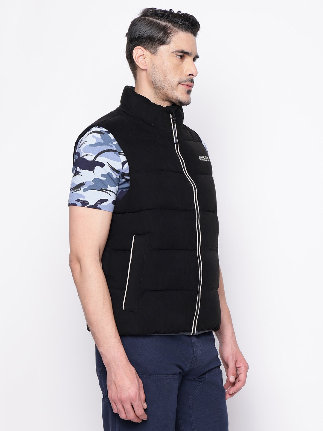 Elevate your style with our Men's Sleeveless Jacket, featuring a sleek regular fit adorned with an iconic brand logo pattern. Crafted from premium polyester fabric, this jacket offers a perfect blend of comfort and durability. The high neck design provides added warmth and a modern edge, while the zip closure ensures easy wearability. Ideal for layering, this versatile piece is perfect for any casual or sporty occasion. Make a statement and showcase your brand loyalty with this must-have addition to your wardrobe.