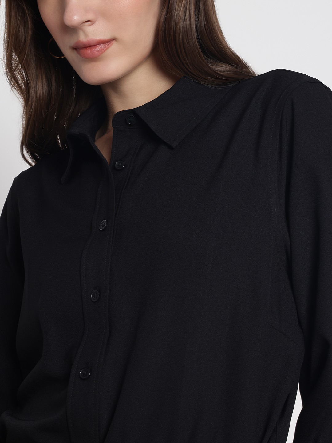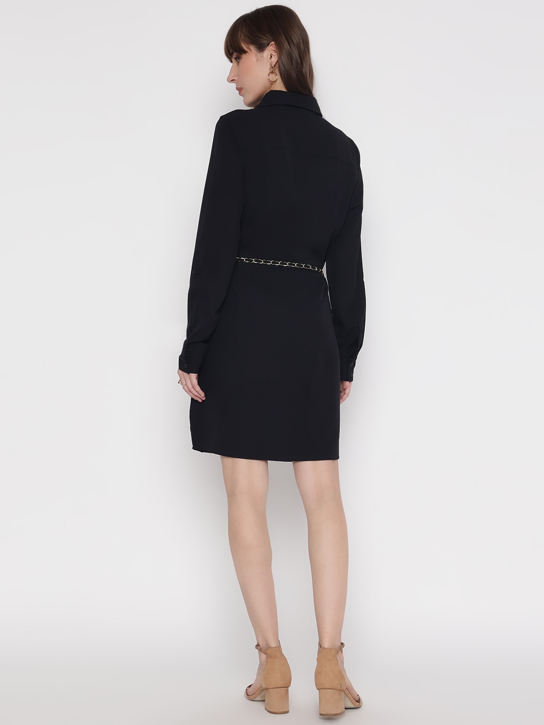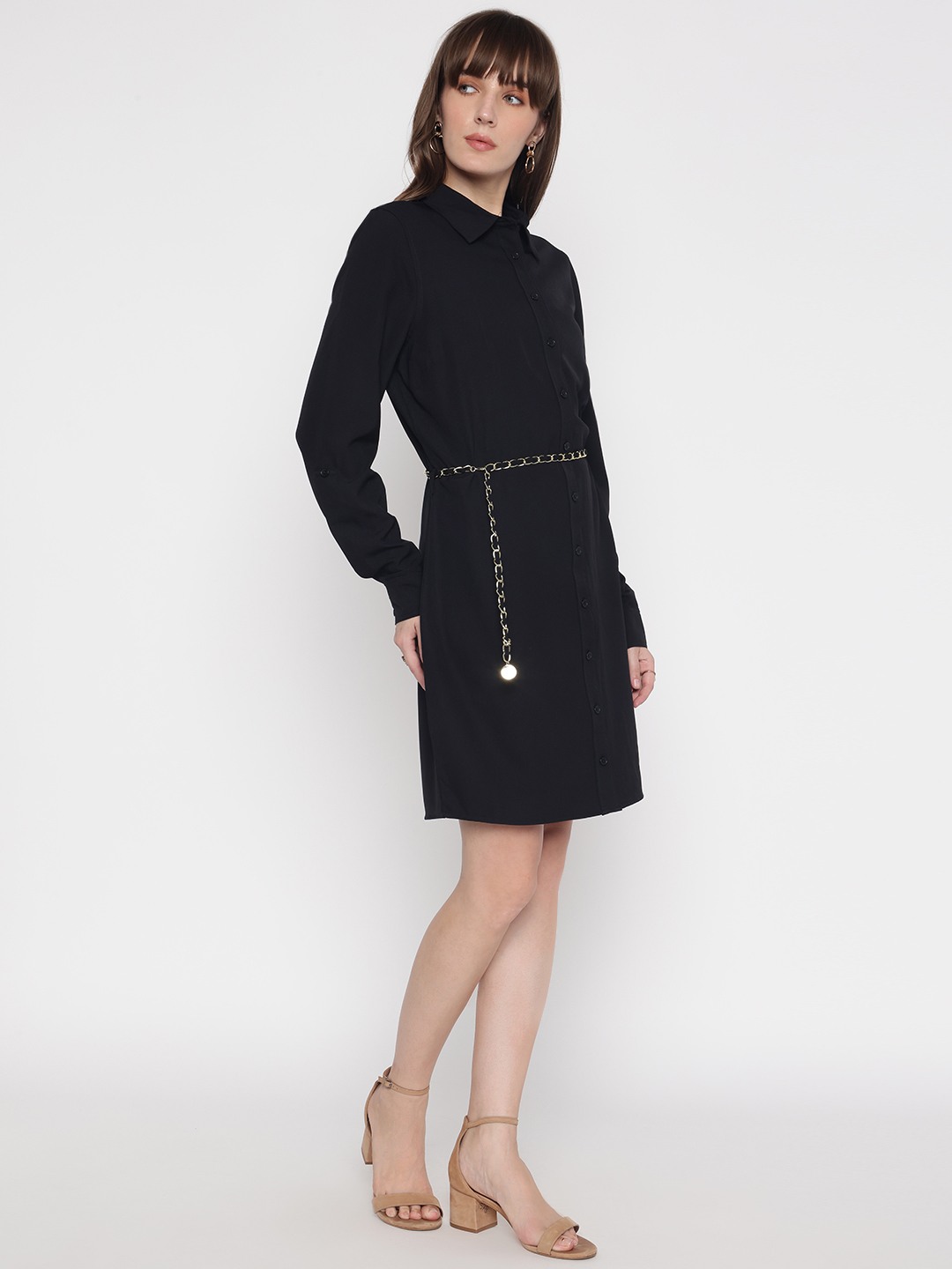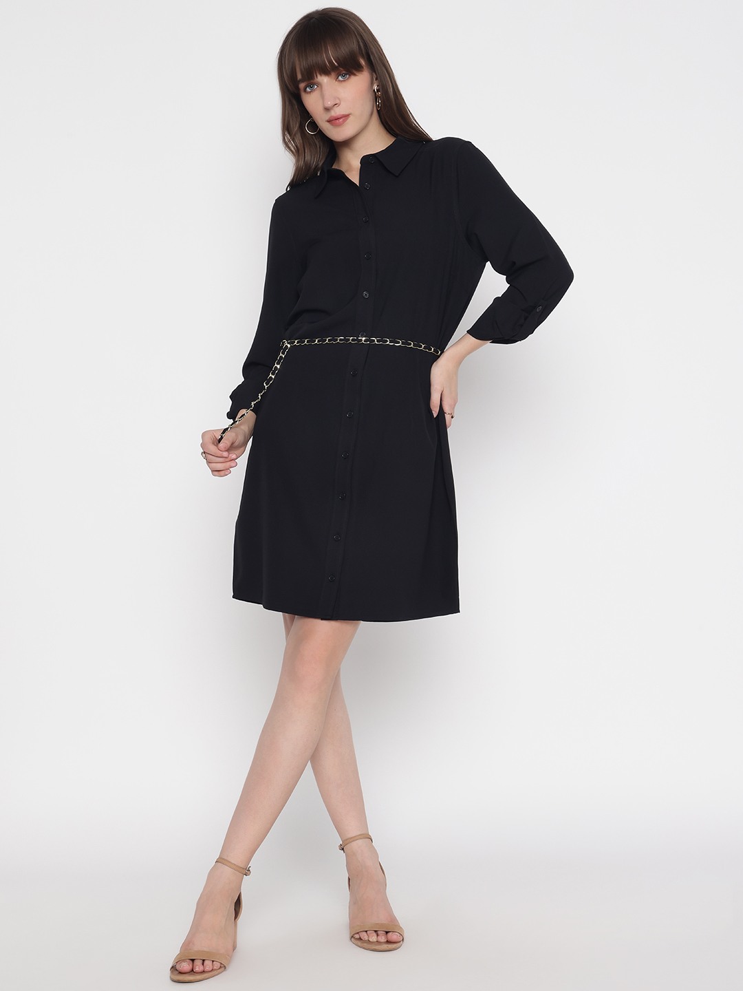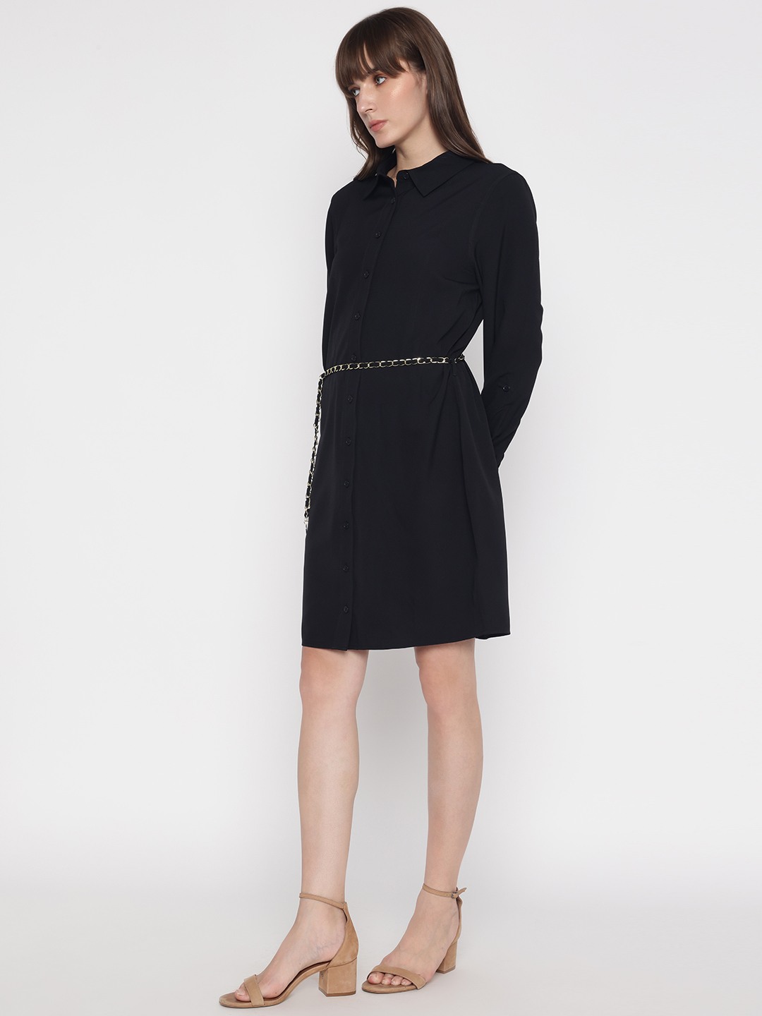 Elevate your wardrobe with this timeless black dress, designed for the modern woman who values both style and comfort. Crafted from a luxurious blend of 95% polyester and 5% elastane, this dress offers a flattering regular fit that moves with you. The solid pattern exudes elegance, while the full sleeves and classic shirt collar add a touch of sophistication. Featuring a convenient button closure, this versatile piece is perfect for any occasion, from office meetings to evening outings. Embrace effortless chic with this must-have dress.