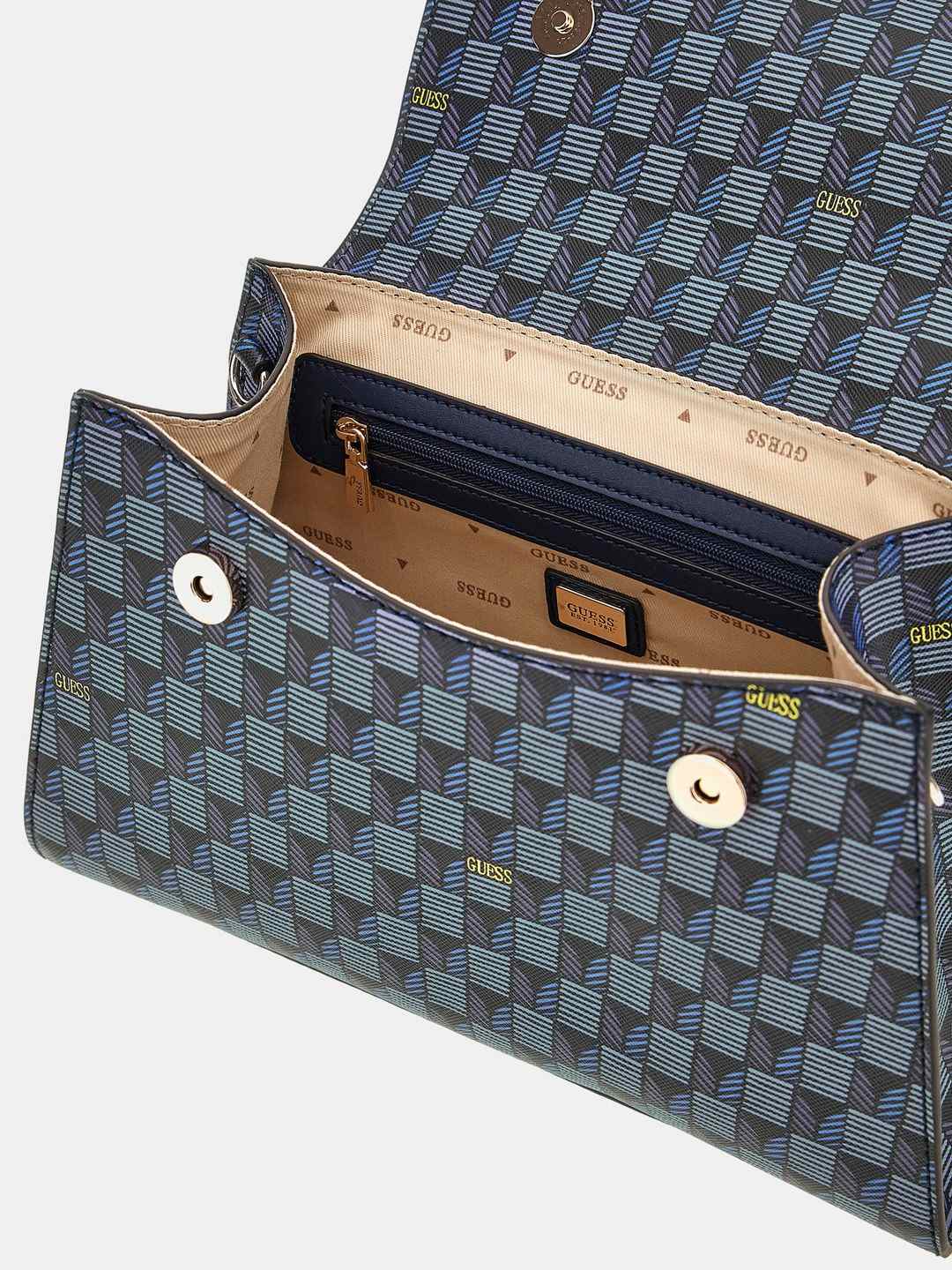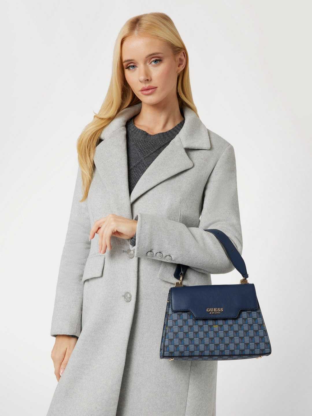 Discover the Hallie Top Handle Flap Bag in Blue Logo color, a chic accessory for the modern woman. Crafted from high-quality PU fabric, this bag features a striking geometric pattern that adds a touch of sophistication to any outfit. The top handle design offers versatility, allowing you to carry it with ease. Its spacious interior is perfect for your essentials, while the secure flap closure ensures everything stays in place. Whether for a day at the office or a night out, the Hallie bag is your stylish companion.
