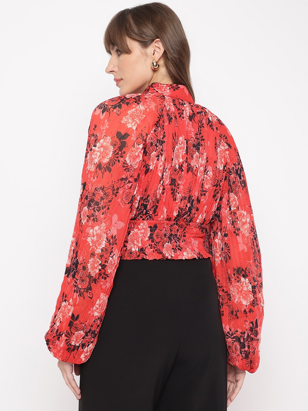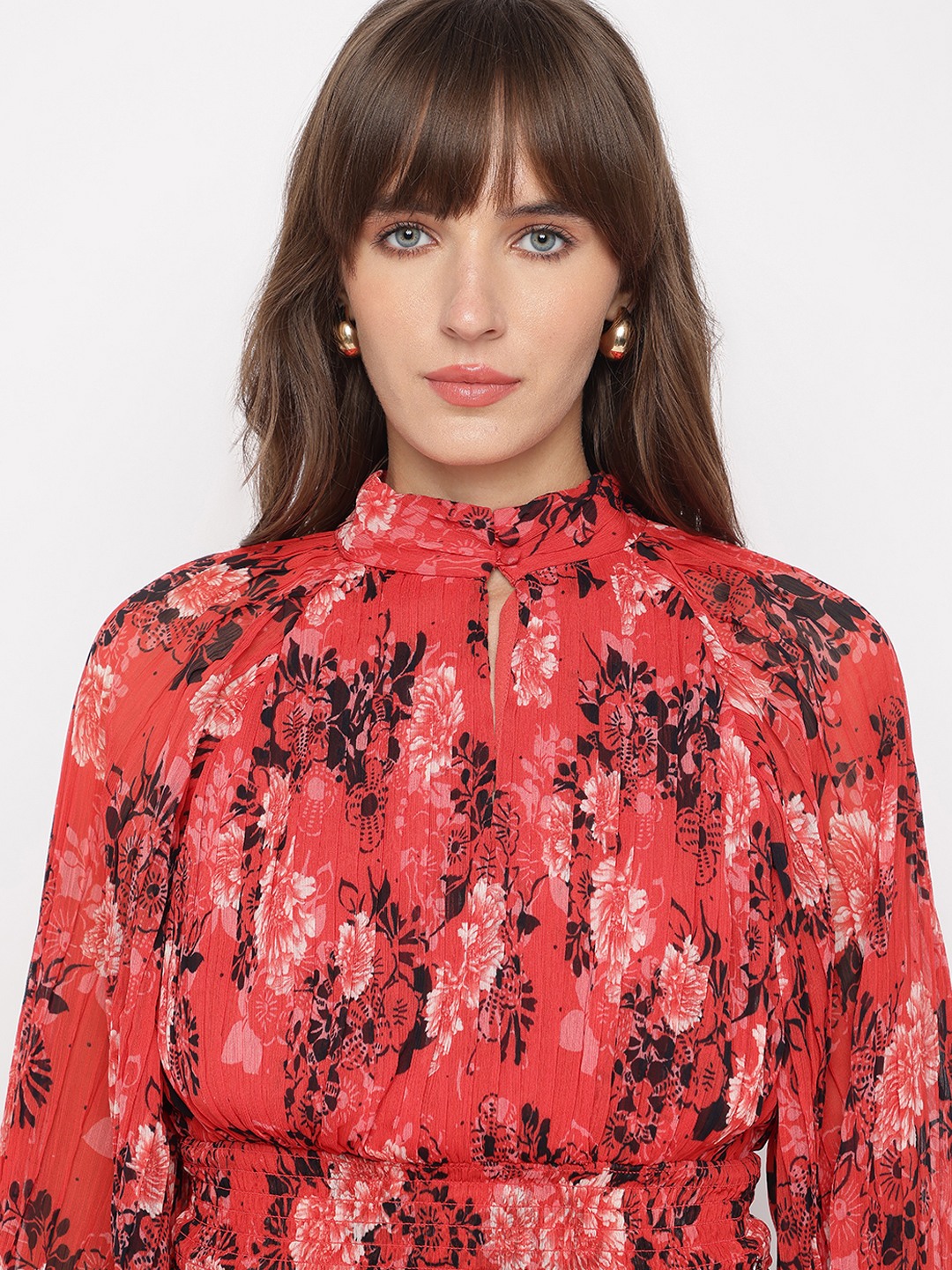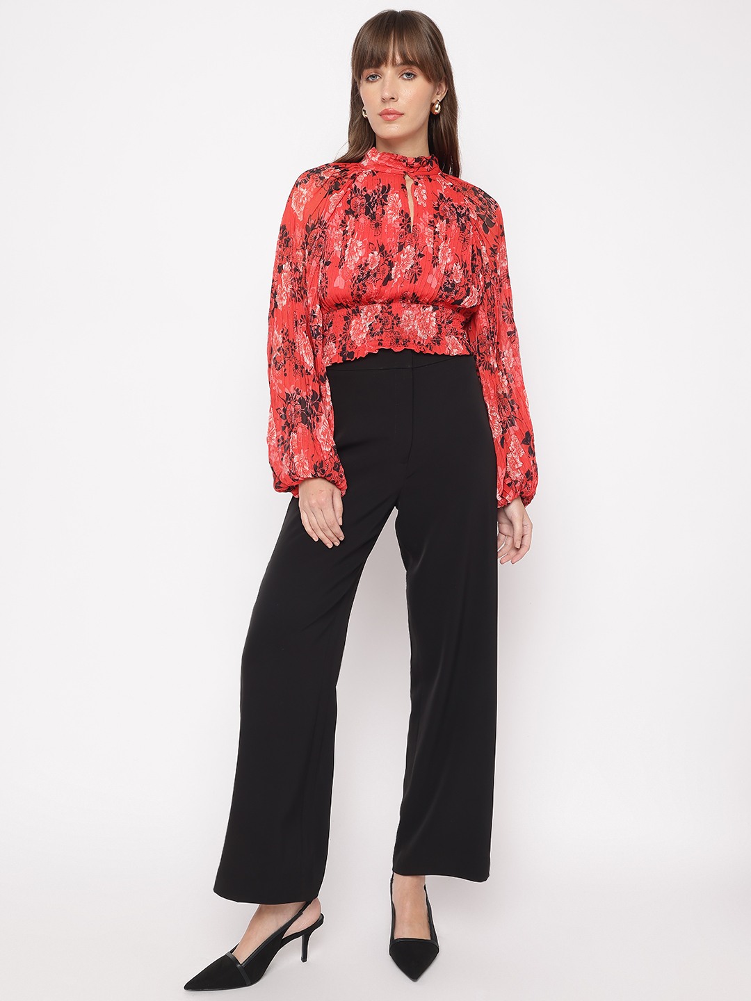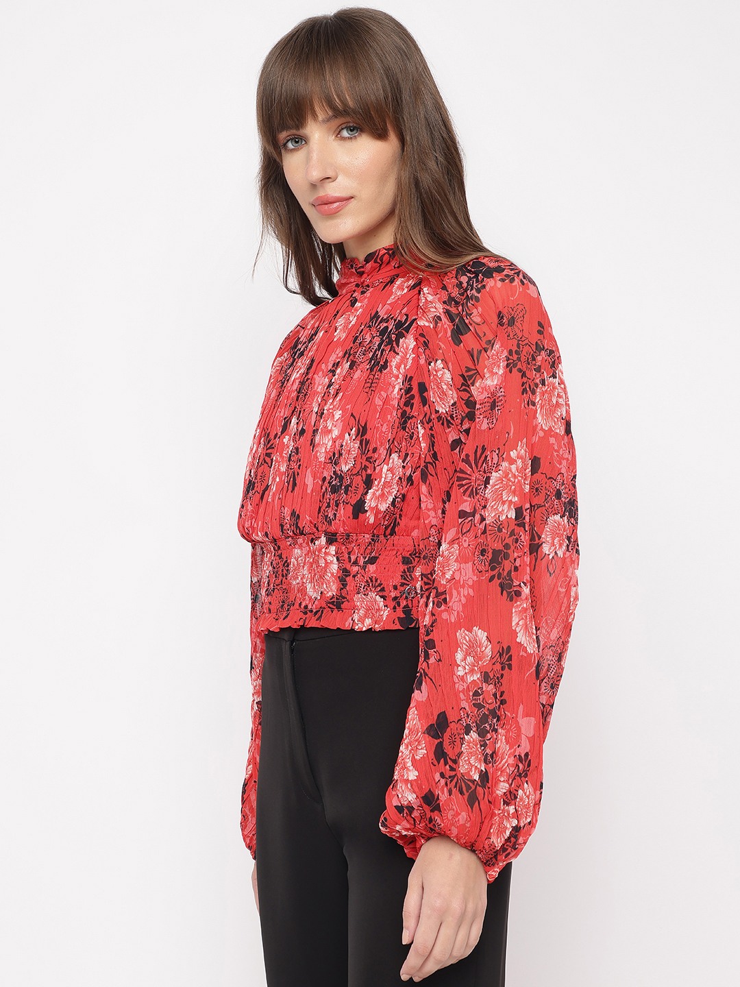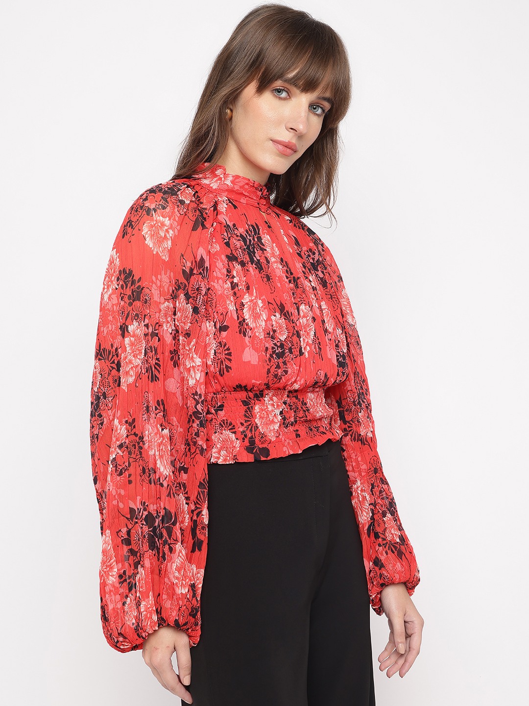 Call Me Cherry Floral Mock Neck Full Sleeve Pleated Top
