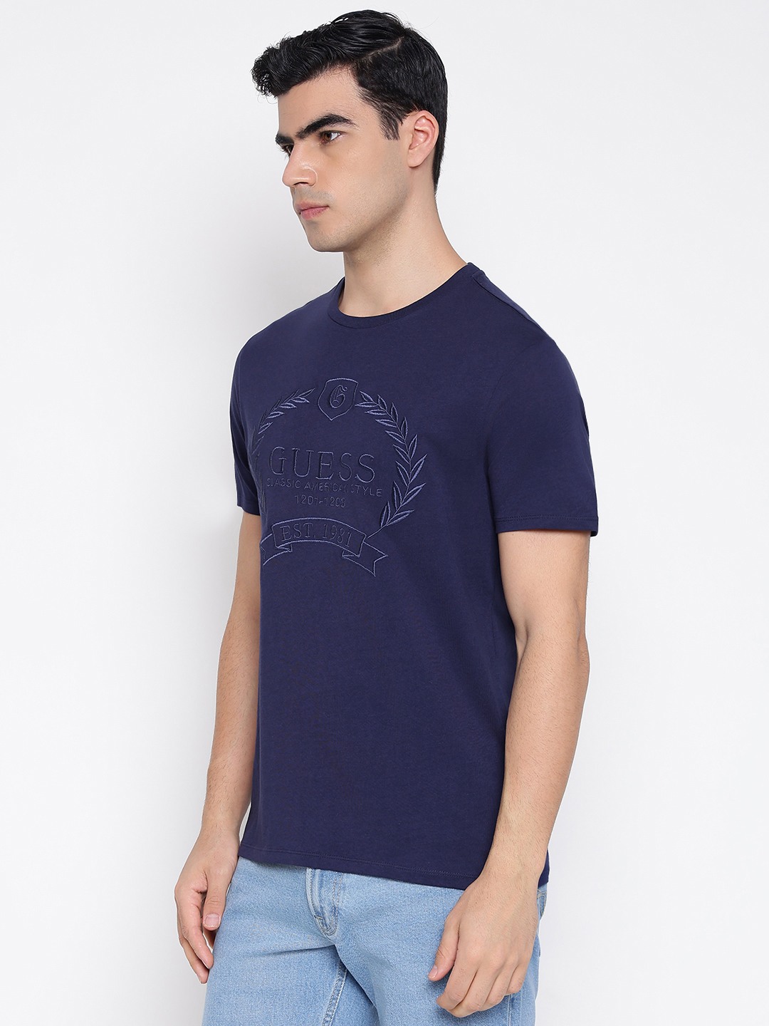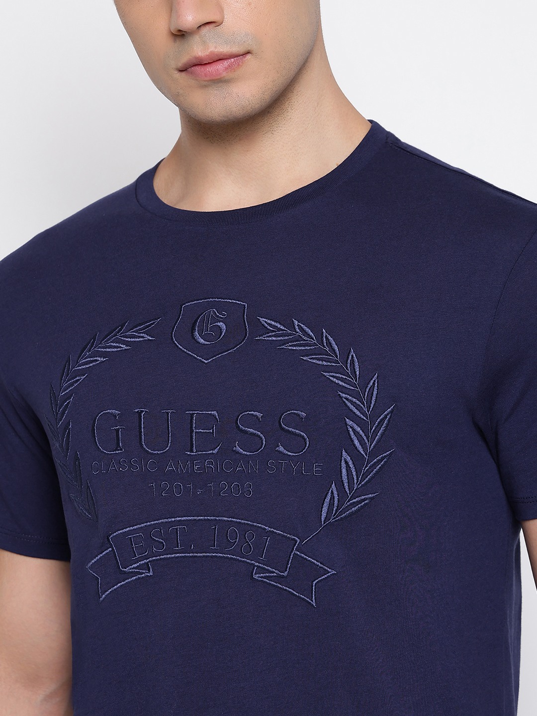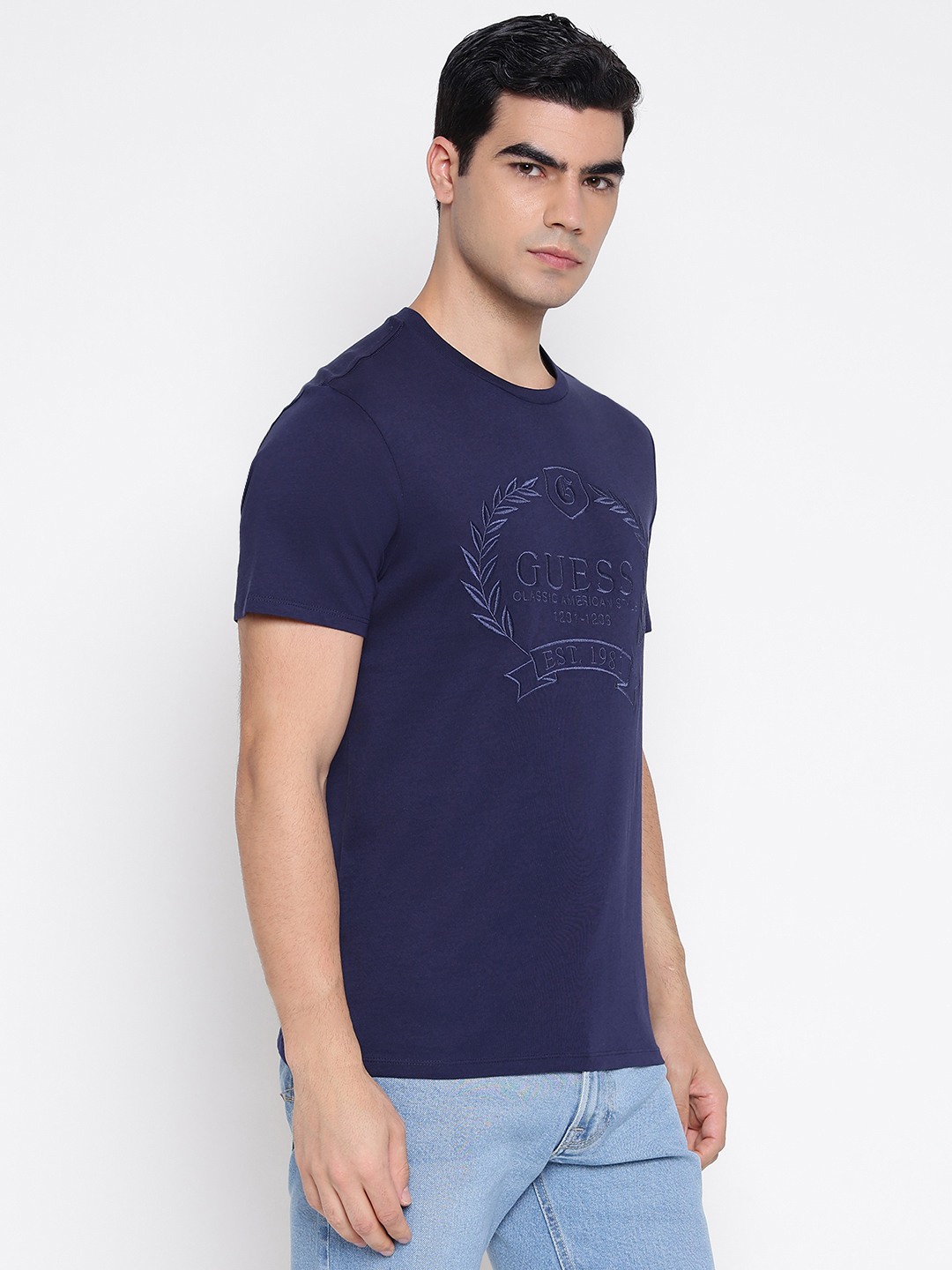 Classic Crest Summer Night Blue Graphic Embroidery Round Neck Slim Fit Organic T-Shirt