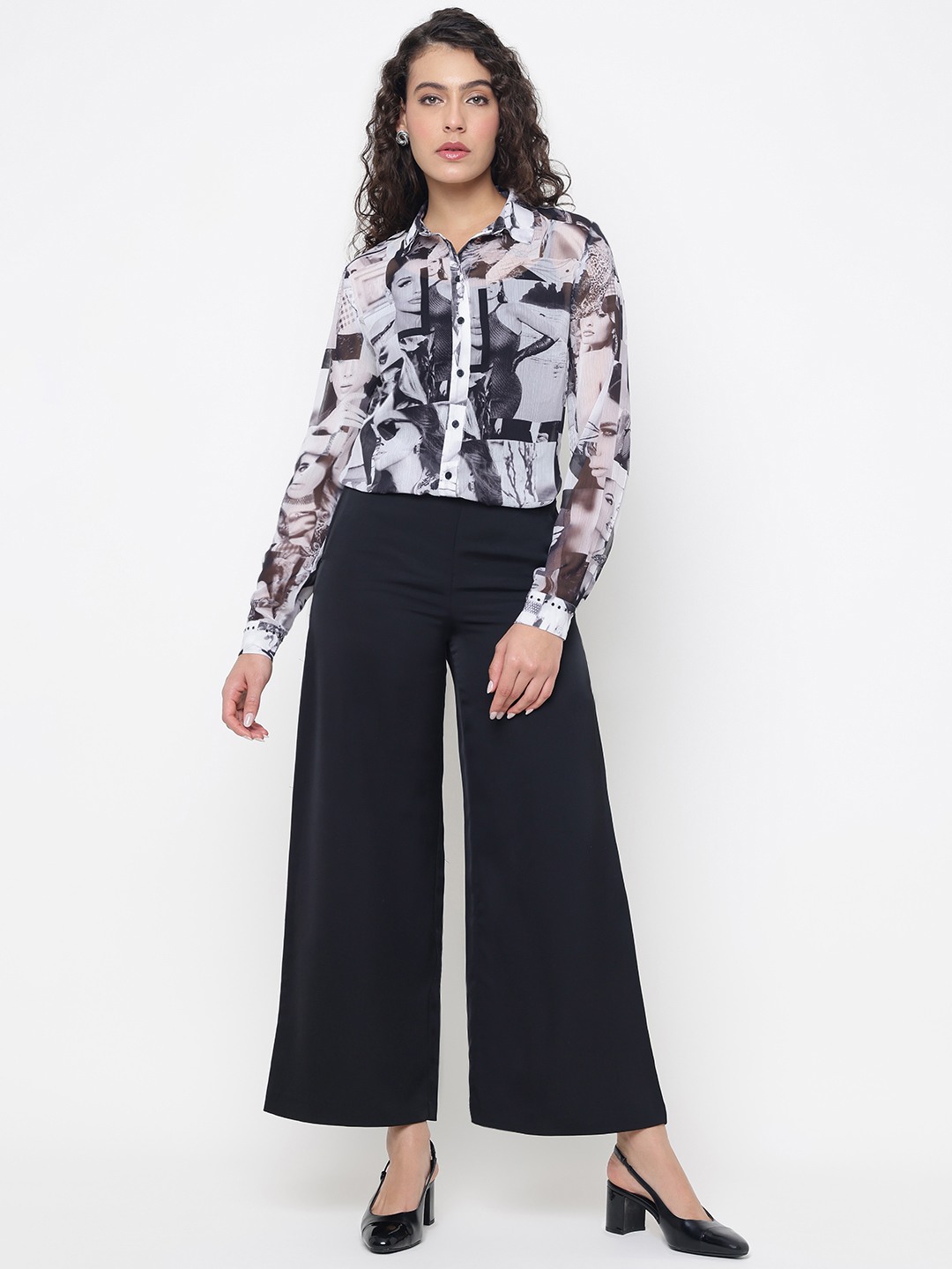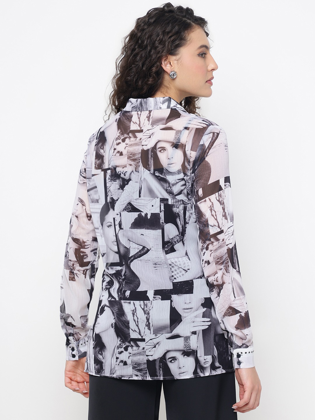 Elevate your wardrobe with our chic women's shirt, designed in a regular fit for effortless style and comfort. This full-sleeve shirt features a striking graphic pattern that adds a modern twist to any ensemble. Crafted from high-quality polyester fabric, it offers a smooth, lightweight feel, perfect for all-day wear. The spread collar adds a touch of sophistication, while the button closure ensures a secure fit. Ideal for both casual outings and professional settings, this versatile shirt is a must-have addition to your fashion collection.