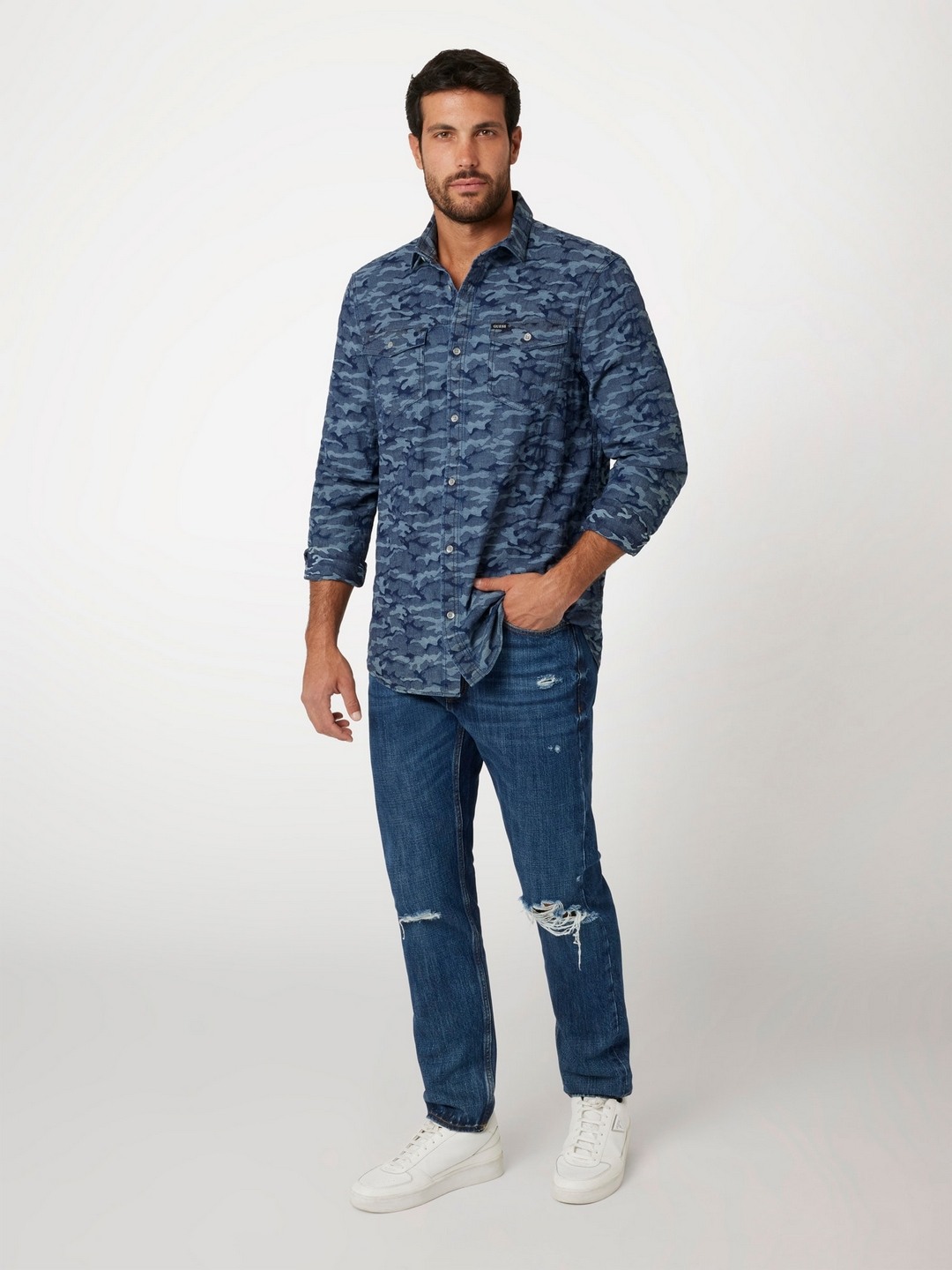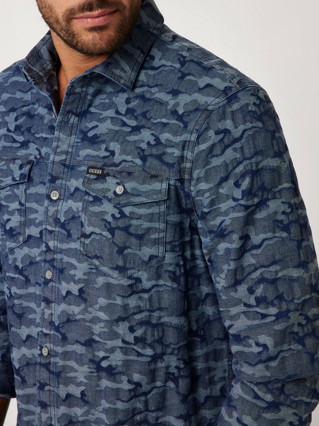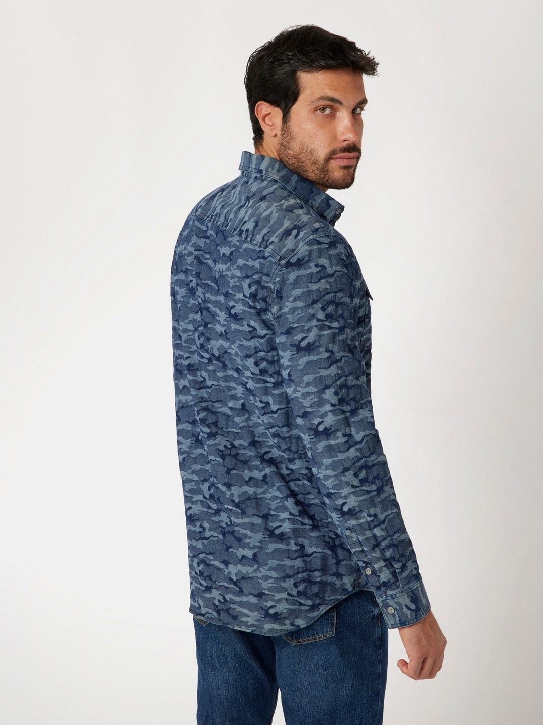 Introducing our stylish indigo camouflage shirt, designed for the modern man who values both comfort and fashion. This regular-fit shirt features a unique camouflage pattern that adds a touch of rugged sophistication to your wardrobe. Crafted from a premium cotton blend fabric, it ensures breathability and comfort throughout the day. The full sleeves offer versatility for any season, while the spread collar adds a classic touch to your look. With a convenient button closure, this shirt is perfect for casual outings or smart-casual events. Elevate your style with this must-have piece today!