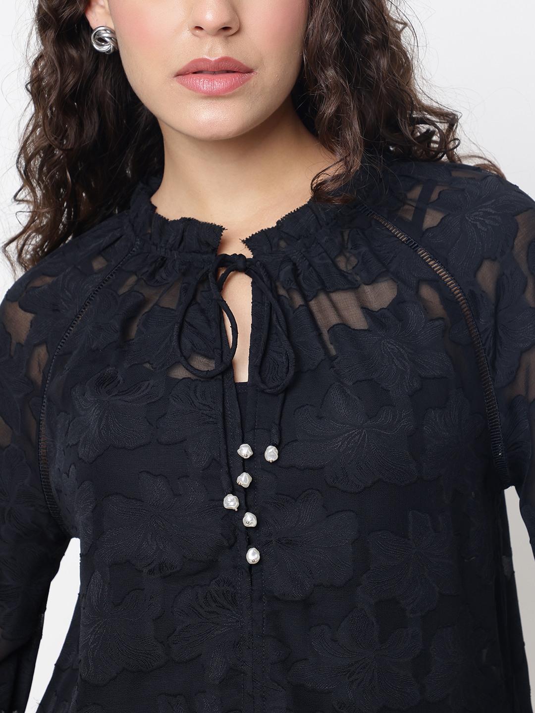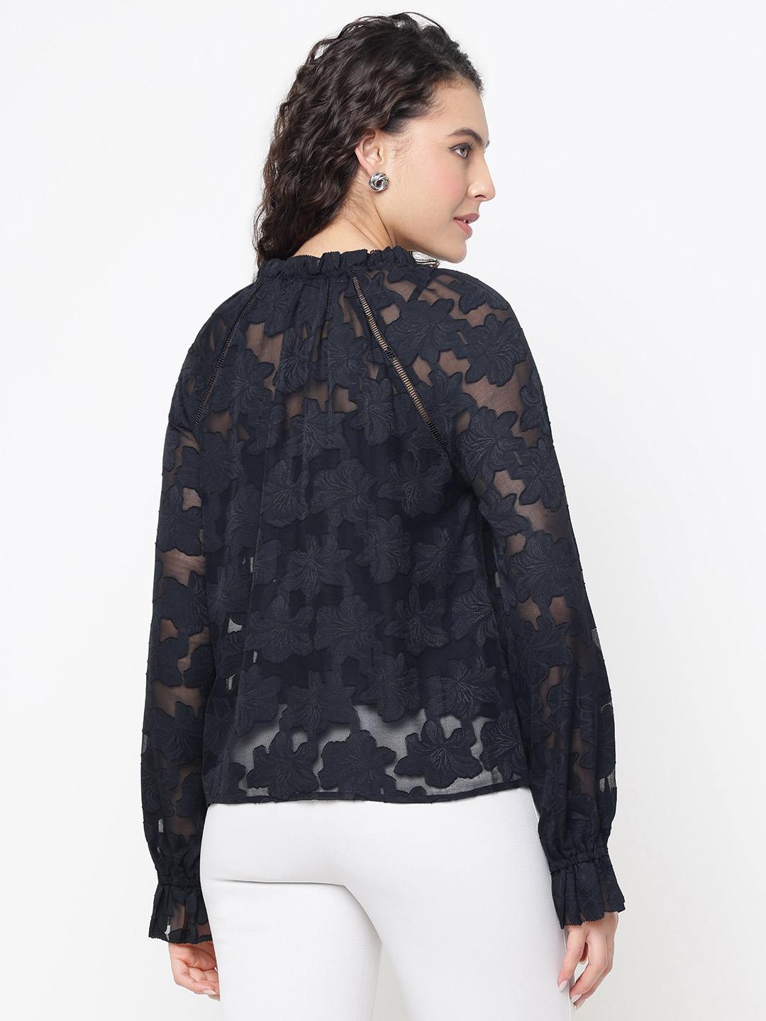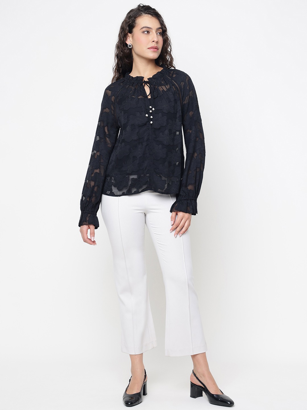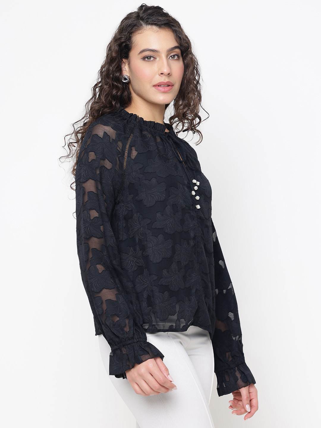 Elevate your wardrobe with our comfort fit floral embroidery top, designed for the modern woman who values style and ease. Crafted from premium polyester fabric, this top offers a luxurious feel and lasting durability. The intricate floral embroidery adds a touch of elegance, while the full sleeves provide a sophisticated silhouette. Featuring a chic tie-up neck and tie-ups closure, this top allows for a customizable fit, ensuring comfort throughout the day. Perfect for any occasion, pair it with your favorite jeans or skirt for a timeless look.