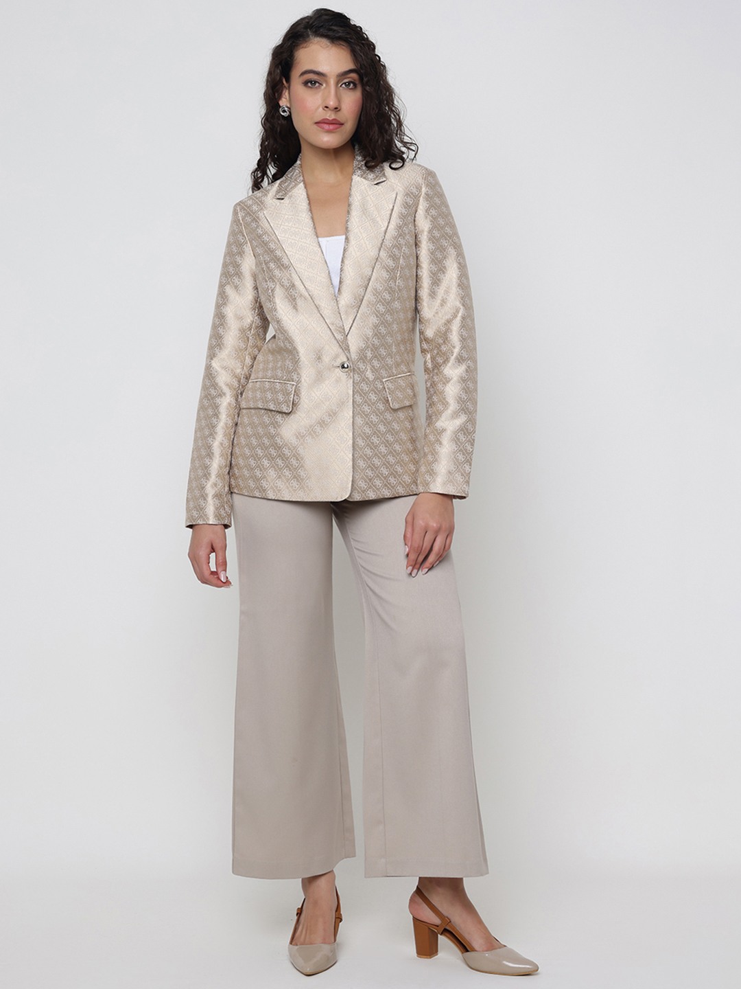 Elevate your wardrobe with our chic single-breasted blazer, designed for the modern woman who appreciates style and comfort. This regular-fit blazer features a striking geometric pattern that adds a contemporary edge to any outfit. Crafted from high-quality polyester fabric, it ensures durability and a smooth finish. The full sleeves and classic lapel collar offer a timeless appeal, while the button closure provides a secure fit. Perfect for both professional settings and casual outings, this blazer is a versatile addition to your fashion collection.