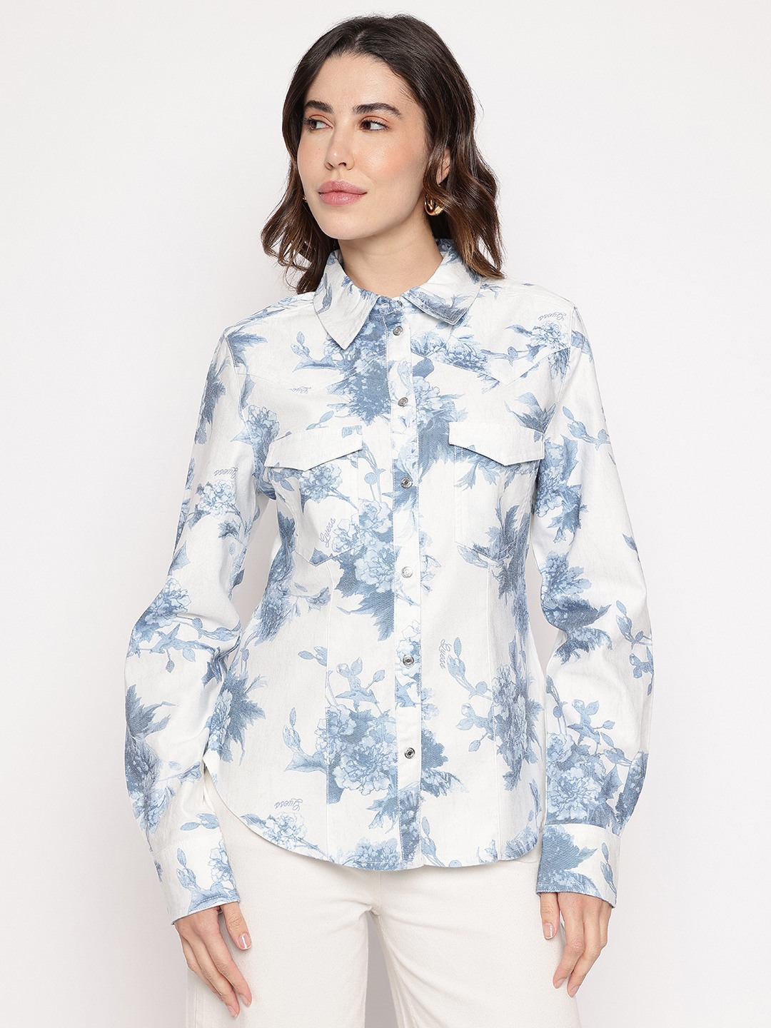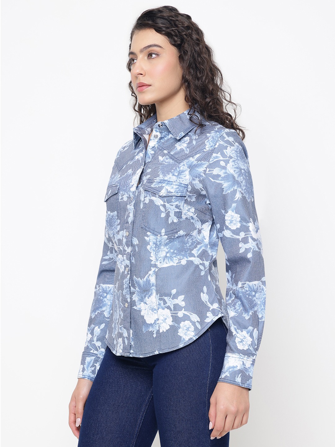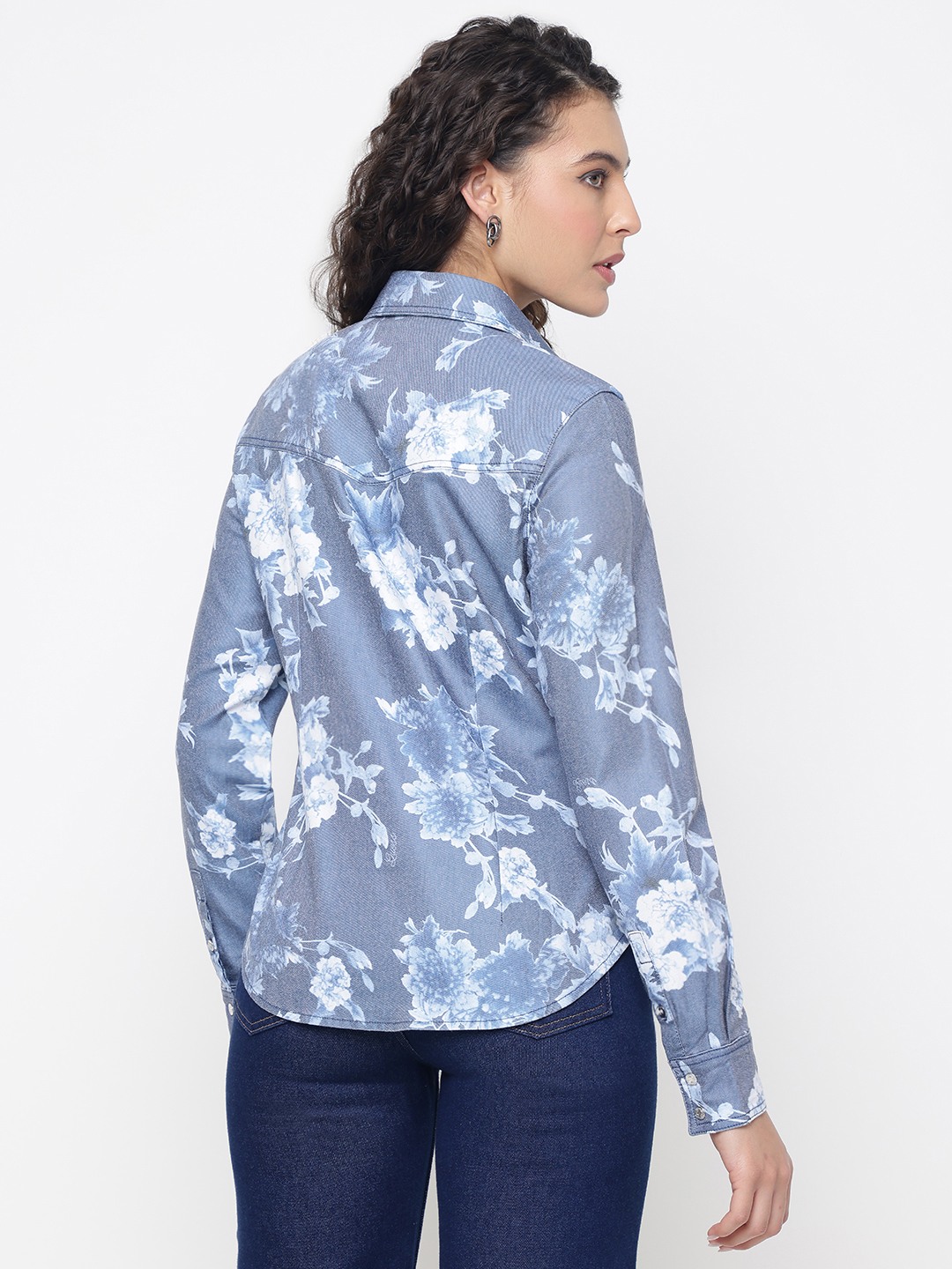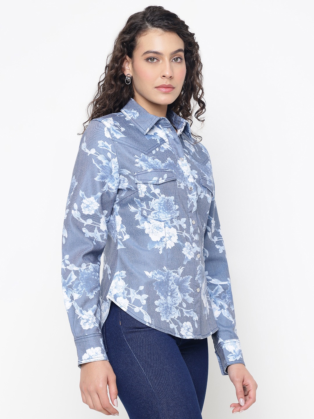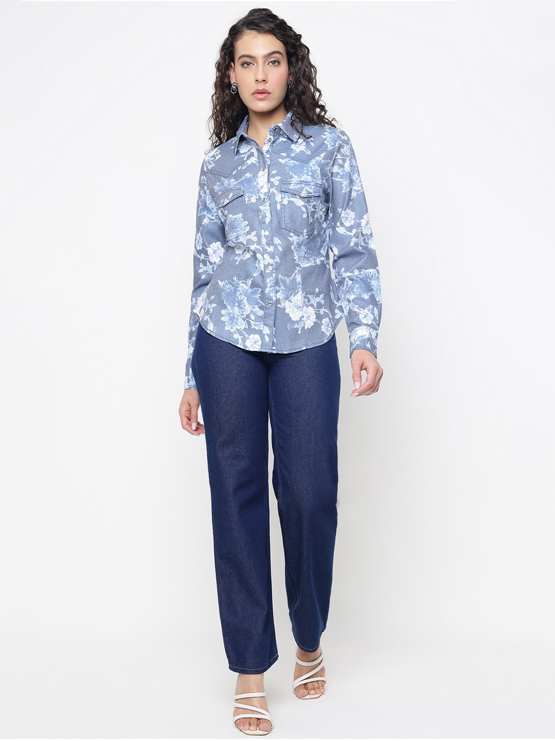 Elevate your wardrobe with our chic denim shirt, designed for the modern woman who appreciates style and comfort. This regular-fit shirt features a captivating floral pattern that adds a touch of femininity to your ensemble. Crafted from high-quality polyester fabric, it ensures durability and a soft feel against the skin. The full sleeves offer versatility, perfect for any season, while the spread collar adds a classic touch. Complete with a button closure, this shirt is ideal for both casual outings and sophisticated gatherings. Embrace effortless elegance with this must-have piece.
