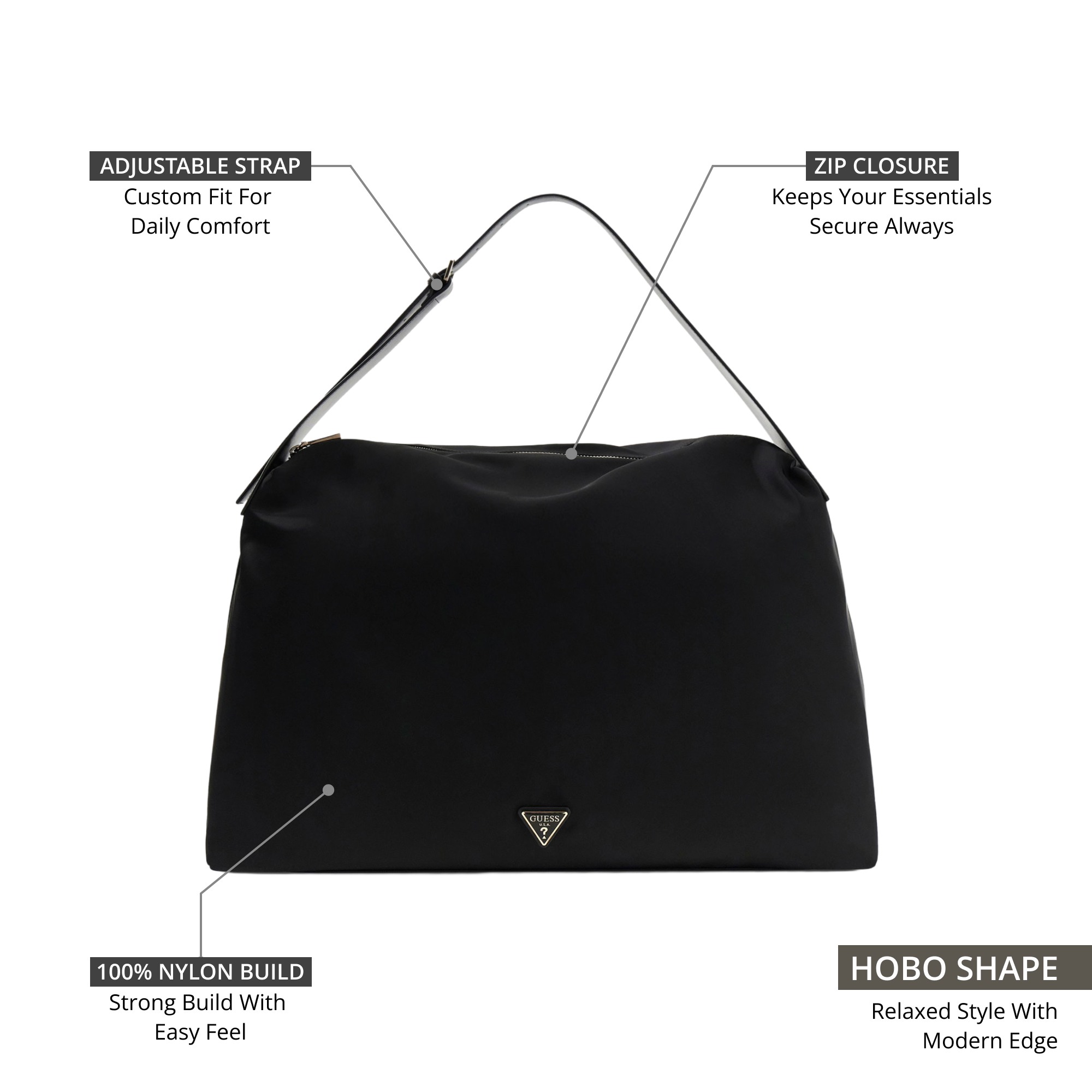 Elevate your everyday look with the Guess Black Nylon Solid Women Shoulder Bag. This stylish accessory is crafted from high-quality, durable nylon, offering a sleek and modern aesthetic. Its solid black finish ensures it complements any outfit, while the spacious interior provides ample room for your essentials. Designed for the modern woman, it features a comfortable shoulder strap and a secure closure, making it the perfect blend of fashion and functionality for work, travel, or casual outings.