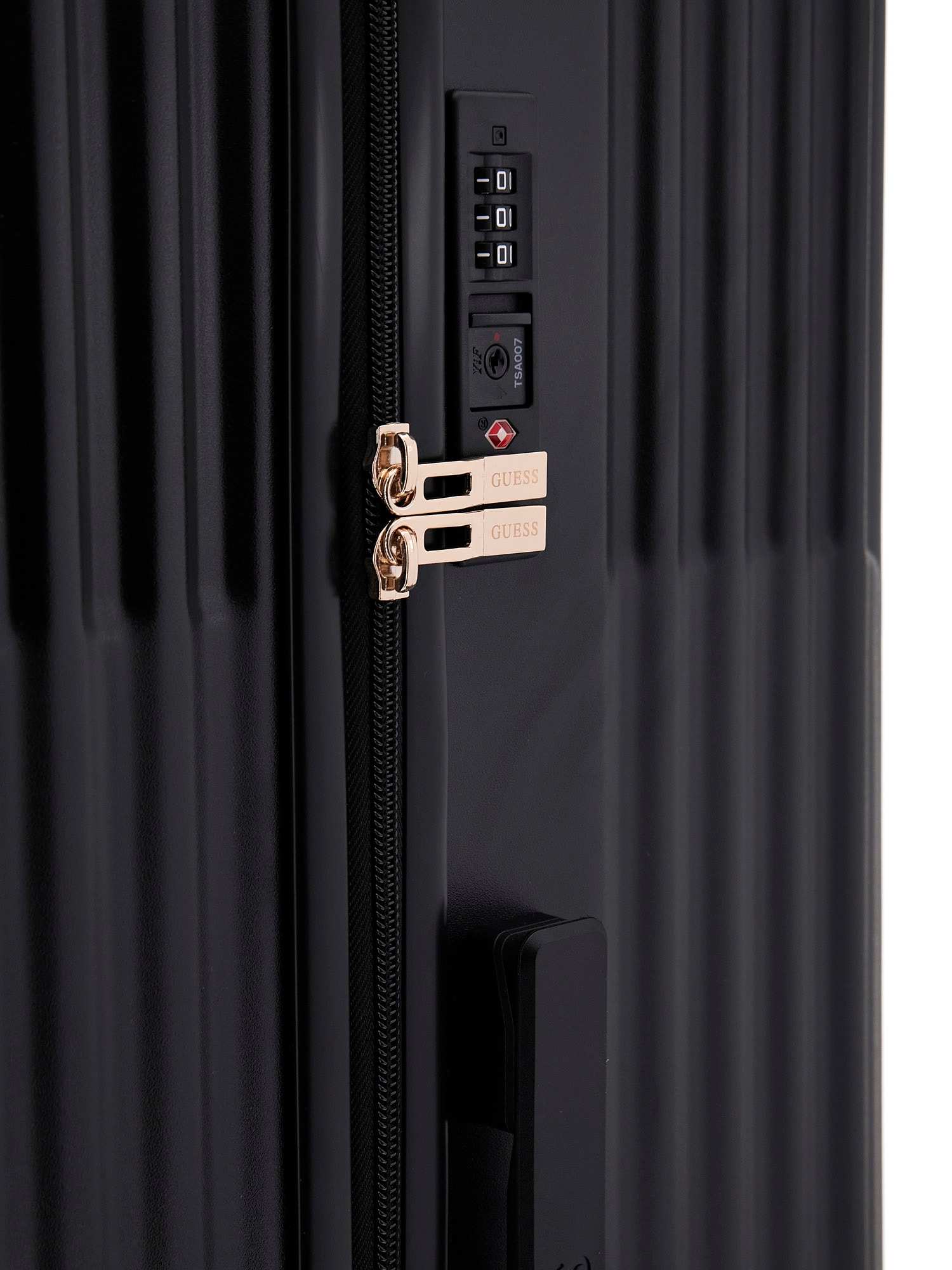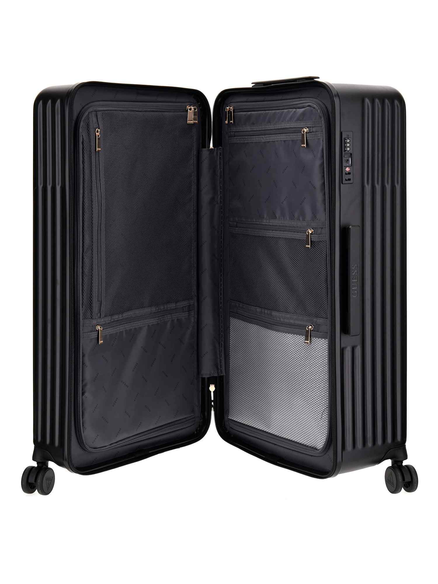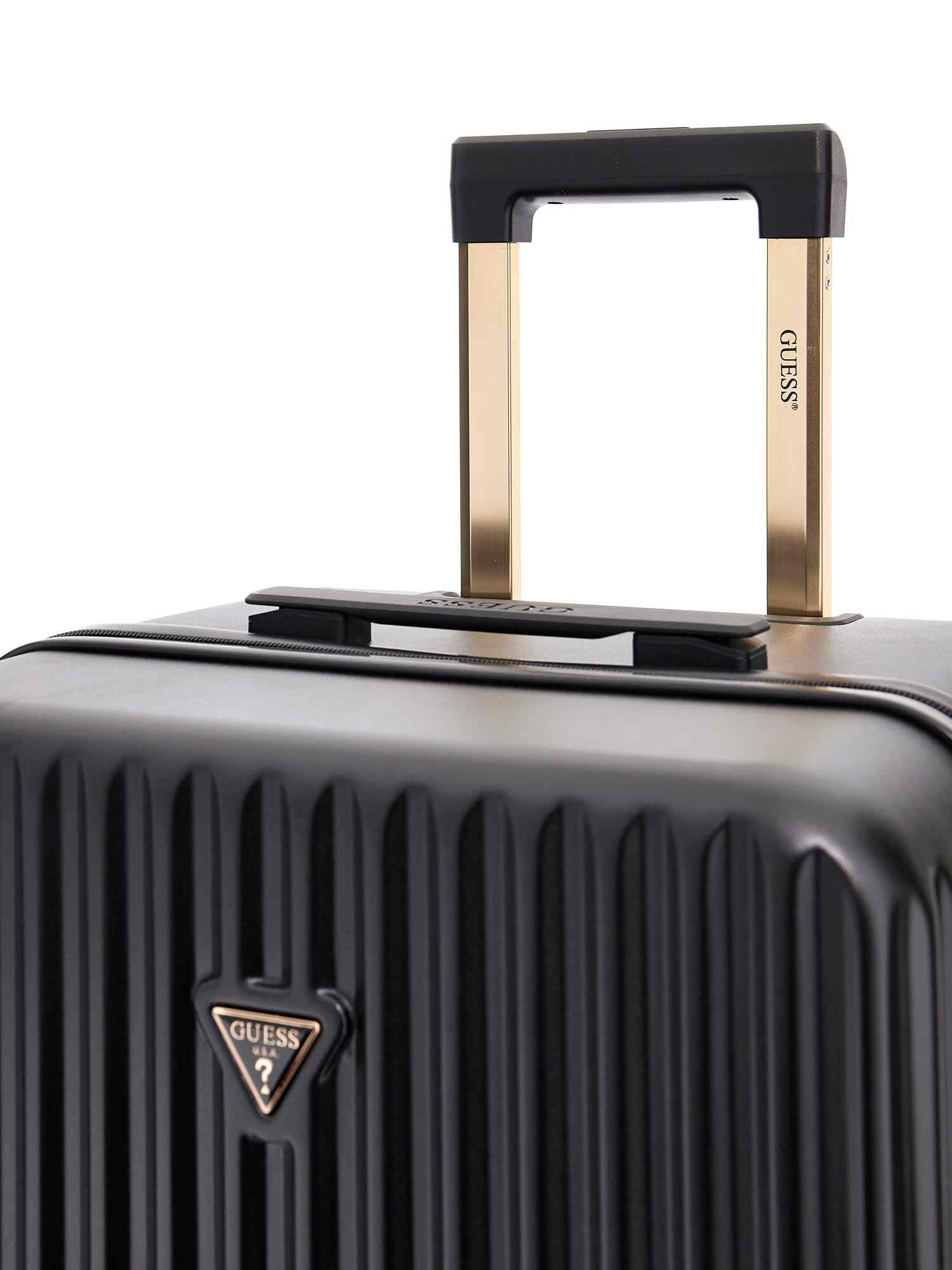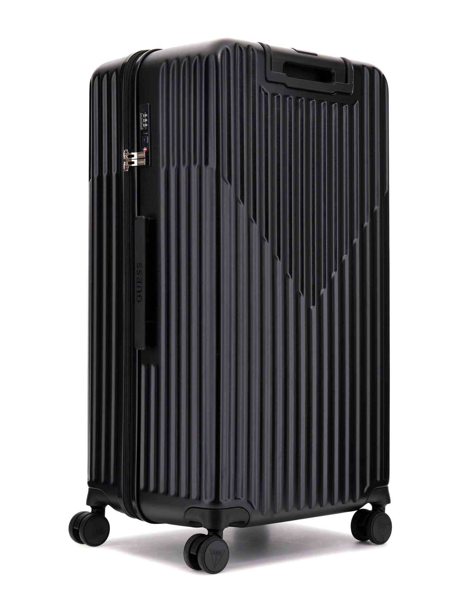 Elevate your travel style with the Guess Black Polycarbonate Textured Woman Trolley Bag. This chic and durable trolley bag is designed to make a statement while keeping your belongings safe and secure. With its sleek black polycarbonate construction and textured design, this bag is as stylish as it is functional. The spacious interior allows for easy organization and the smooth-rolling wheels ensure effortless mobility. Whether you're jetting off for a weekend getaway or a business trip, this trolley bag will be your go-to travel companion. Travel in style and confidence with Guess.