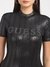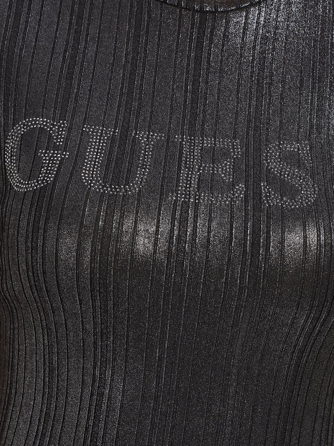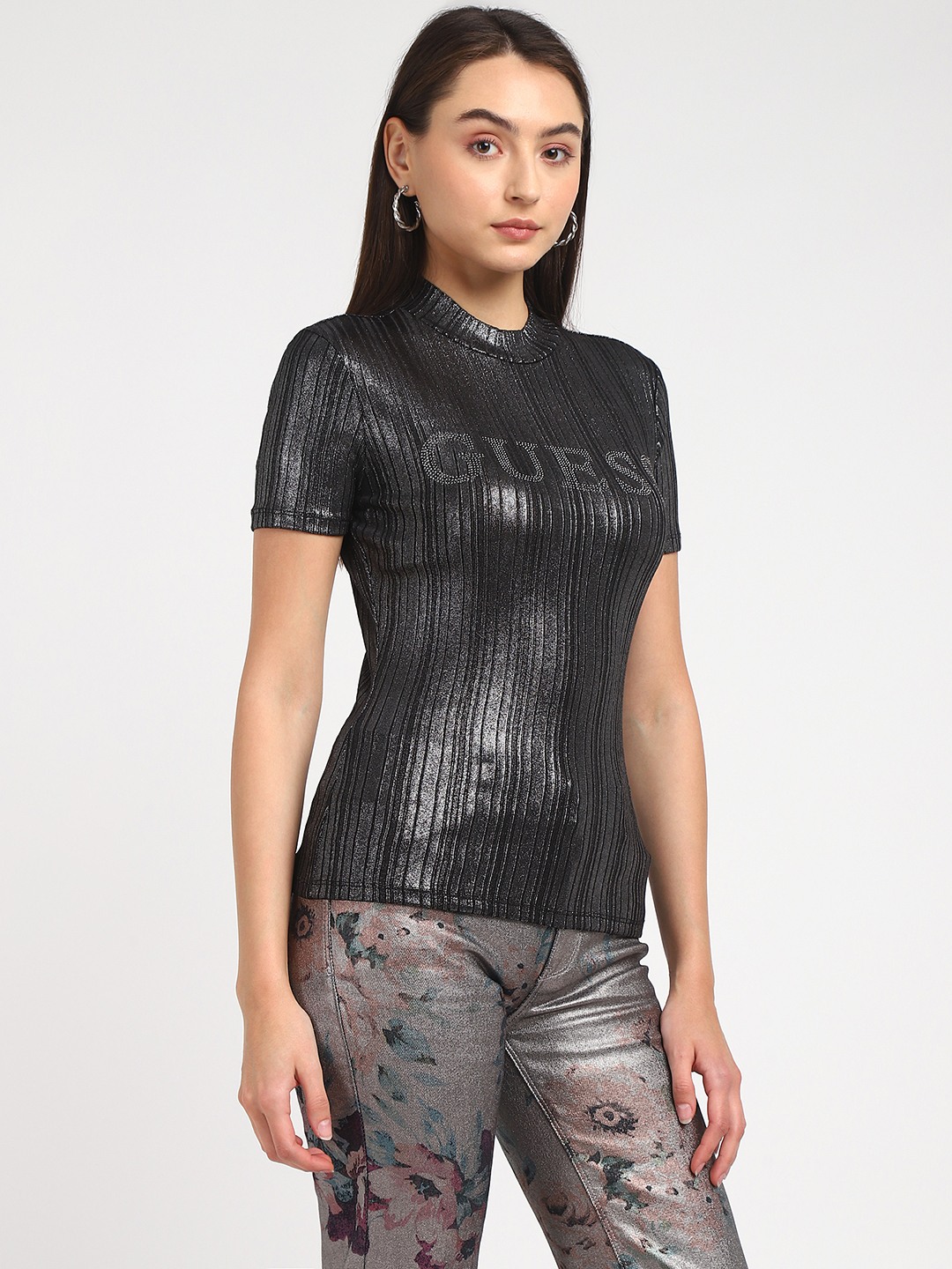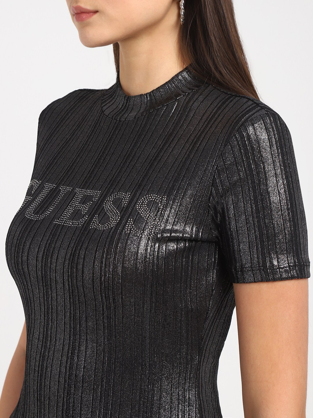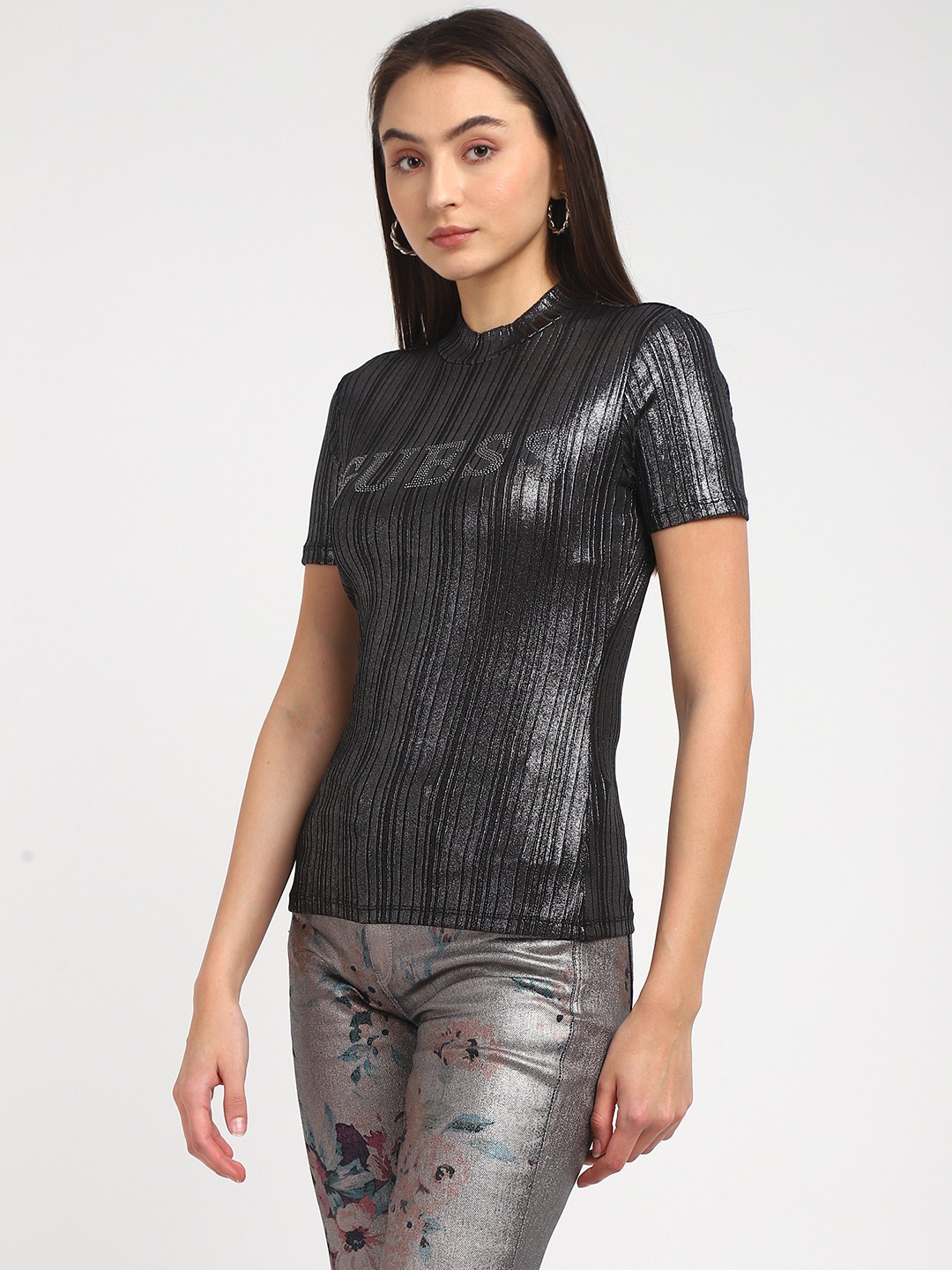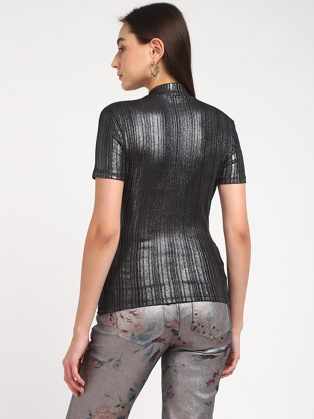 Black Solid Round Neck Short Sleeves Cristina - Metallic Top
