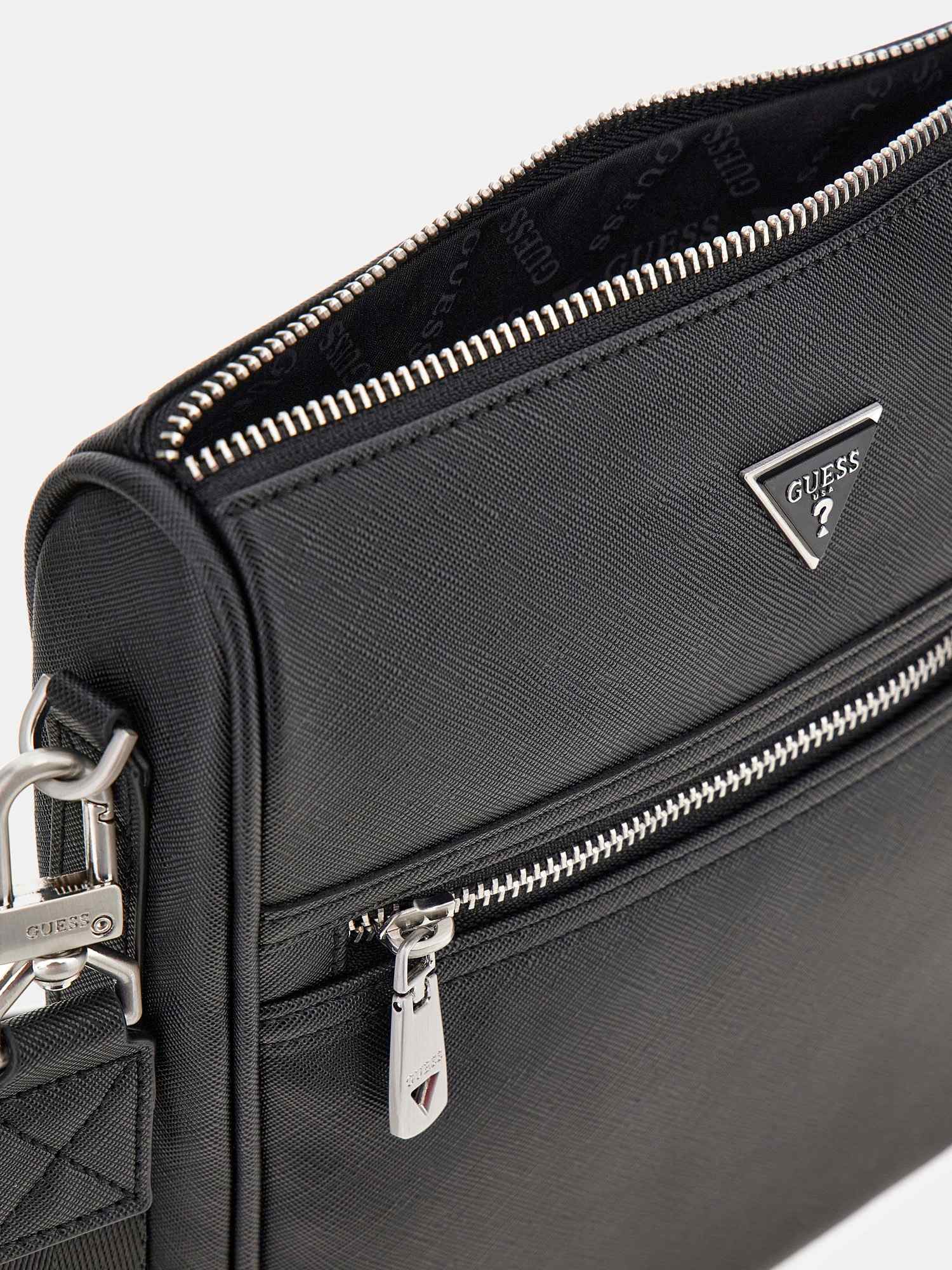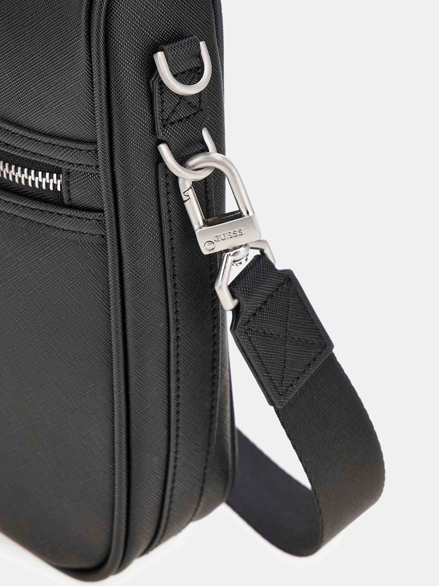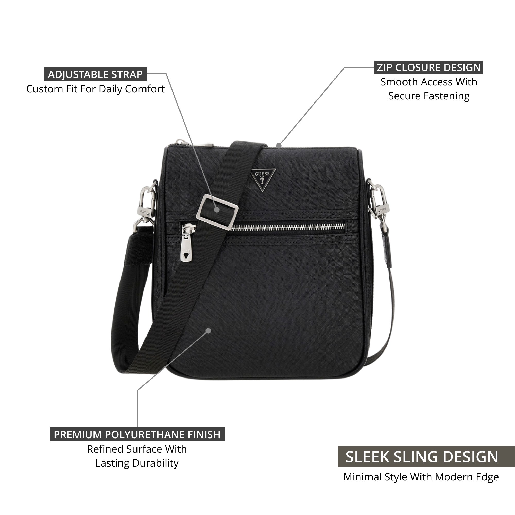 Upgrade your daily essentials with the Guess Black Polyurethane Solid Men Sling Bag. This sophisticated piece is expertly crafted from premium polyurethane, featuring a clean and minimal solid black design that exudes modern elegance. Its lightweight construction and adjustable shoulder strap make it ideal for comfortable, all-day use. Whether you are commuting or exploring the city, this versatile sling bag offers a stylish way to keep your belongings organized while adding a touch of Guess signature style to your look.