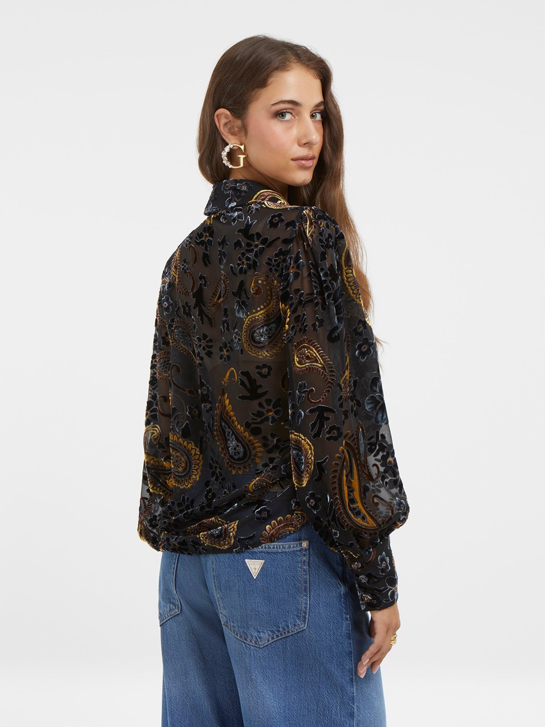 Black Printed Spread Collar Full Sleeves Paisley Velvet Top