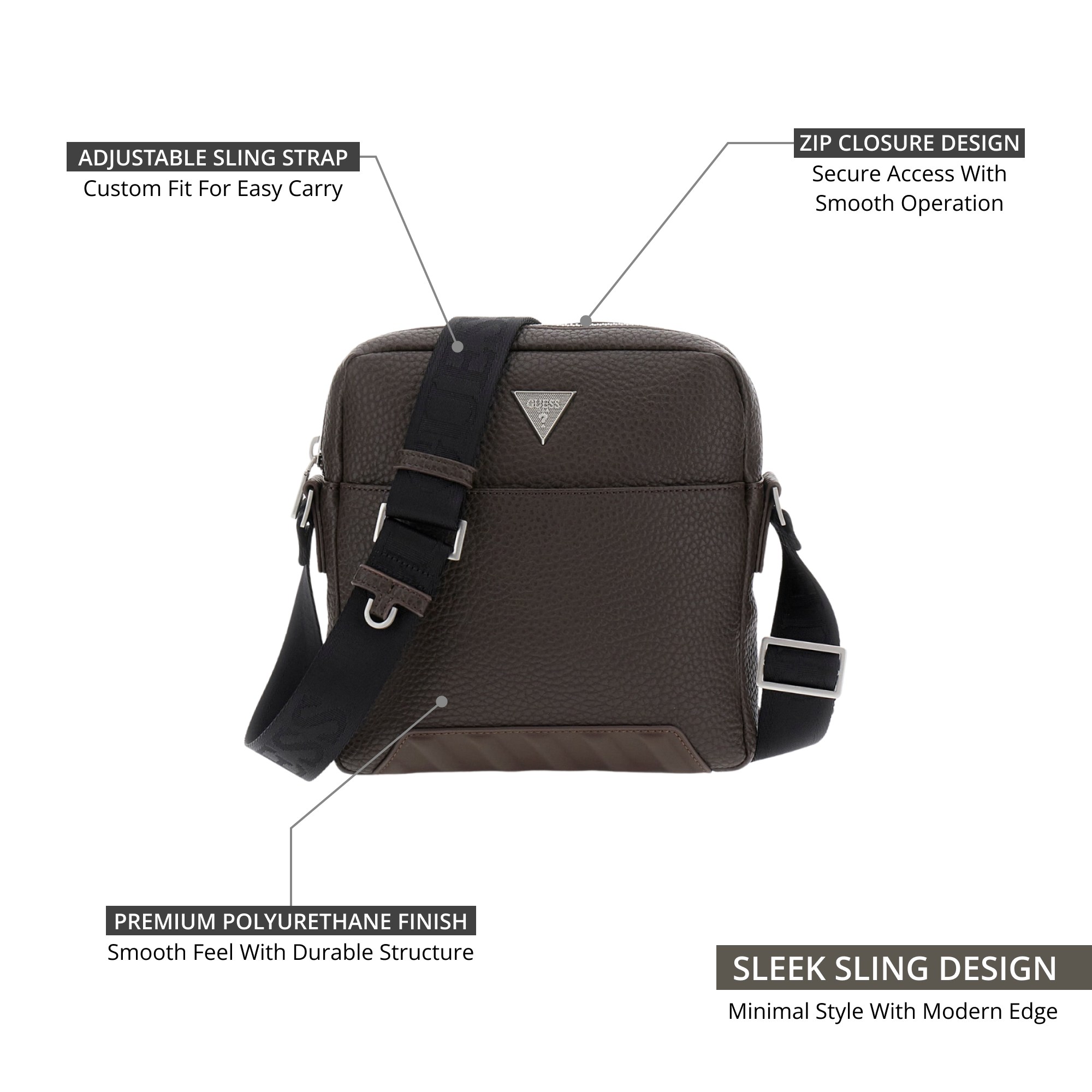 Elevate your daily style with the Guess Brown Polyurethane Solid Men Sling Bag. This sophisticated accessory is expertly crafted from high-quality polyurethane, featuring a rich brown finish and subtle branding for a polished look. Designed for practicality, it includes a secure zip closure, internal pockets, and an adjustable strap for a personalized fit. Whether you are traveling or heading to a meeting, this versatile bag provides effortless organization for your essentials while adding a touch of modern elegance to your ensemble.
