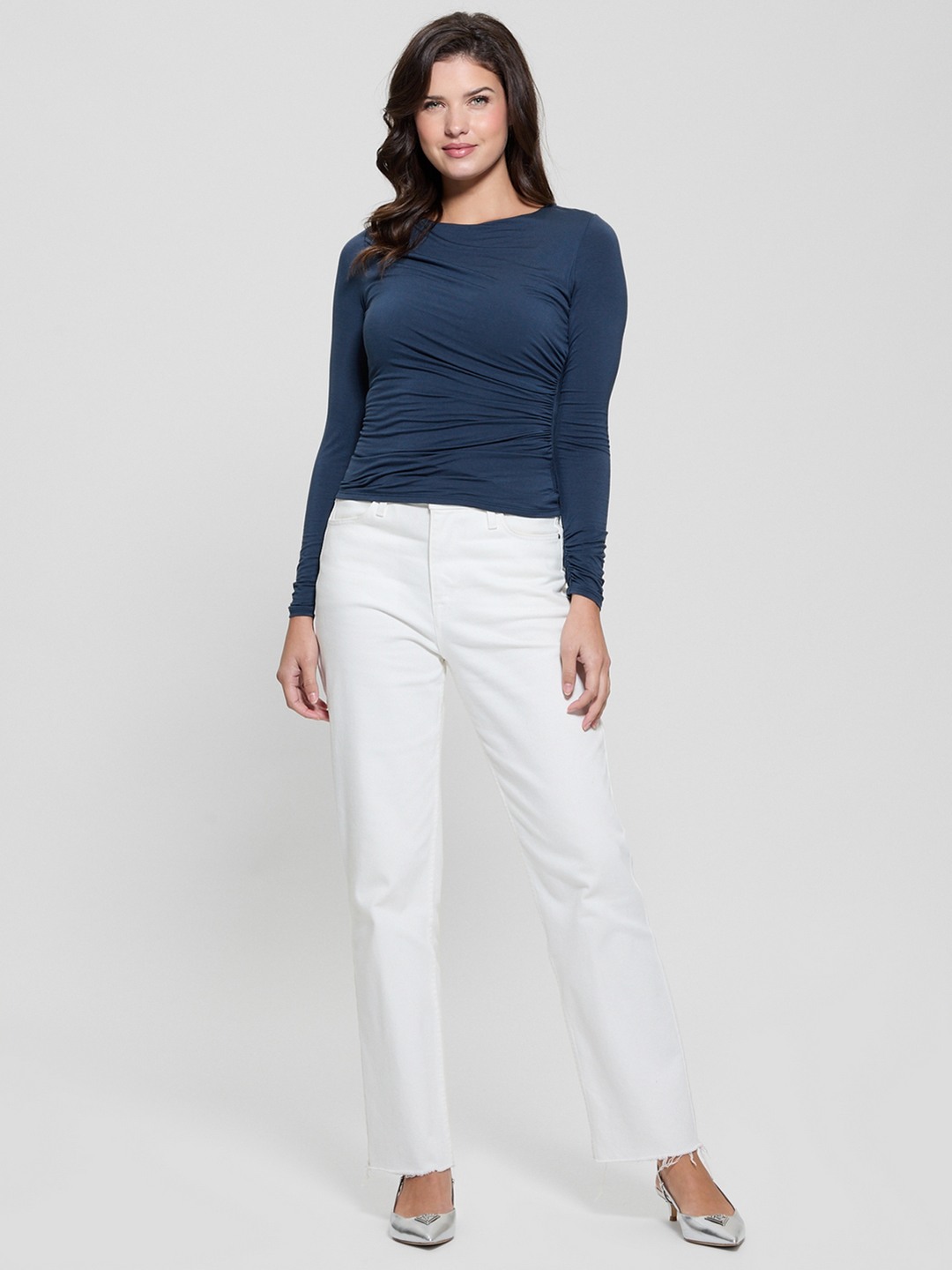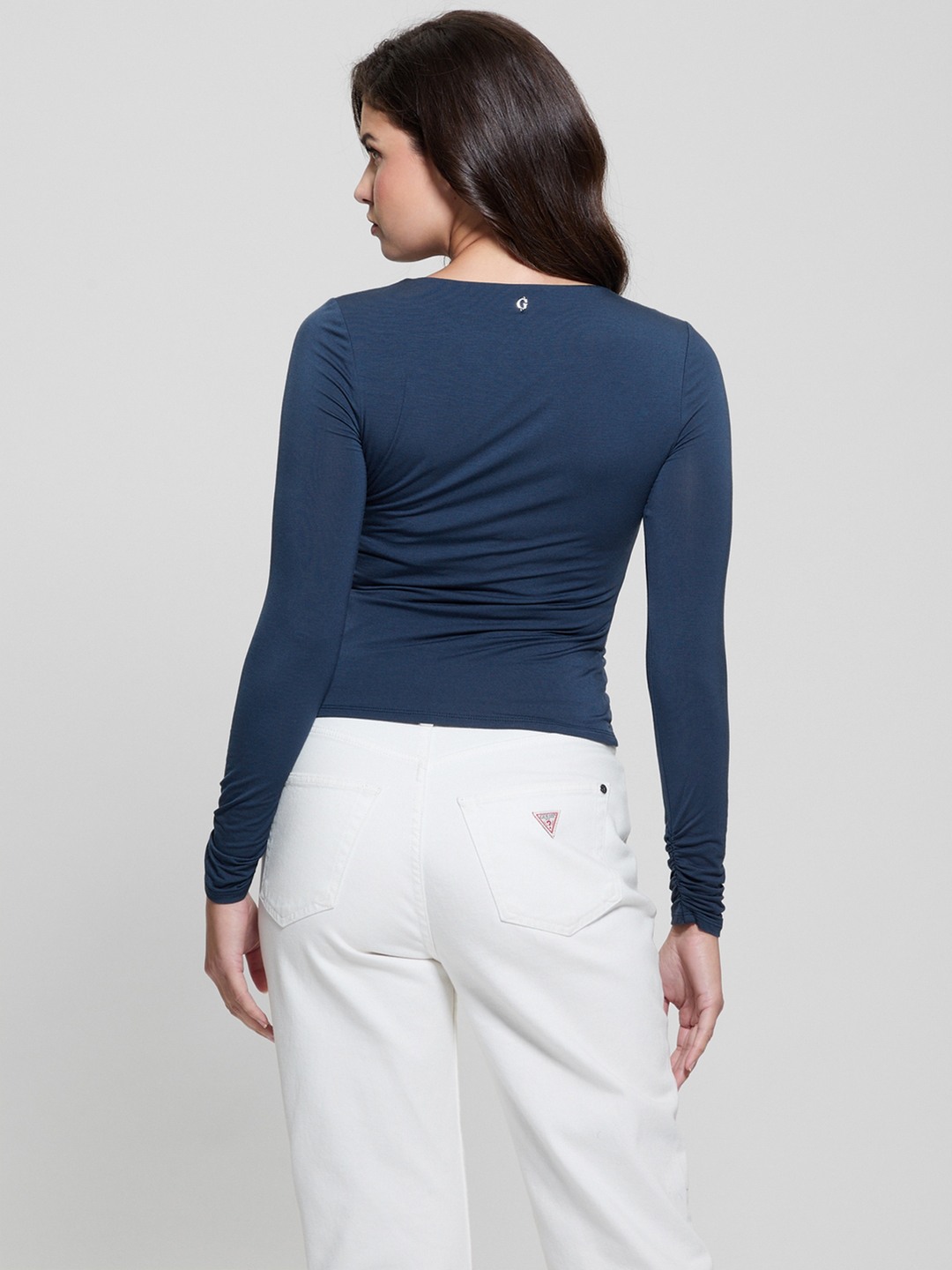 Elevate your wardrobe with this elegant blue top, featuring a solid pattern and long sleeves. Crafted from a luxurious modal blend, it offers a soft, comfortable fit. The round neck design adds a classic touch, while the pull-on closure ensures ease of wear. Perfect for any occasion, day or night.