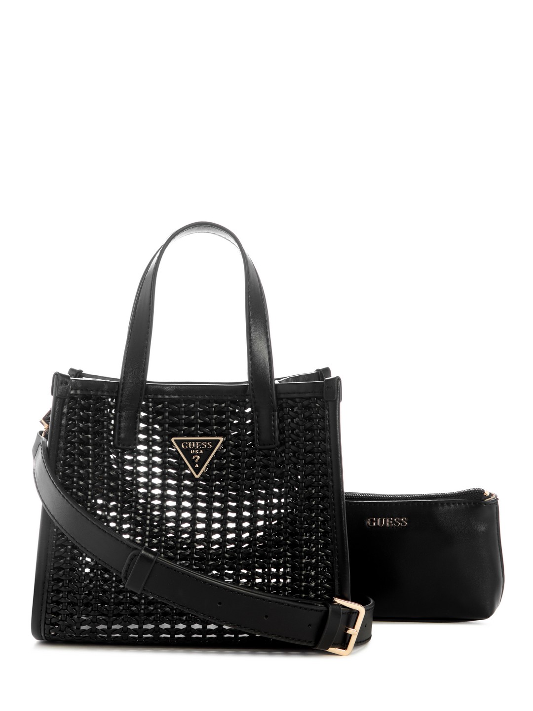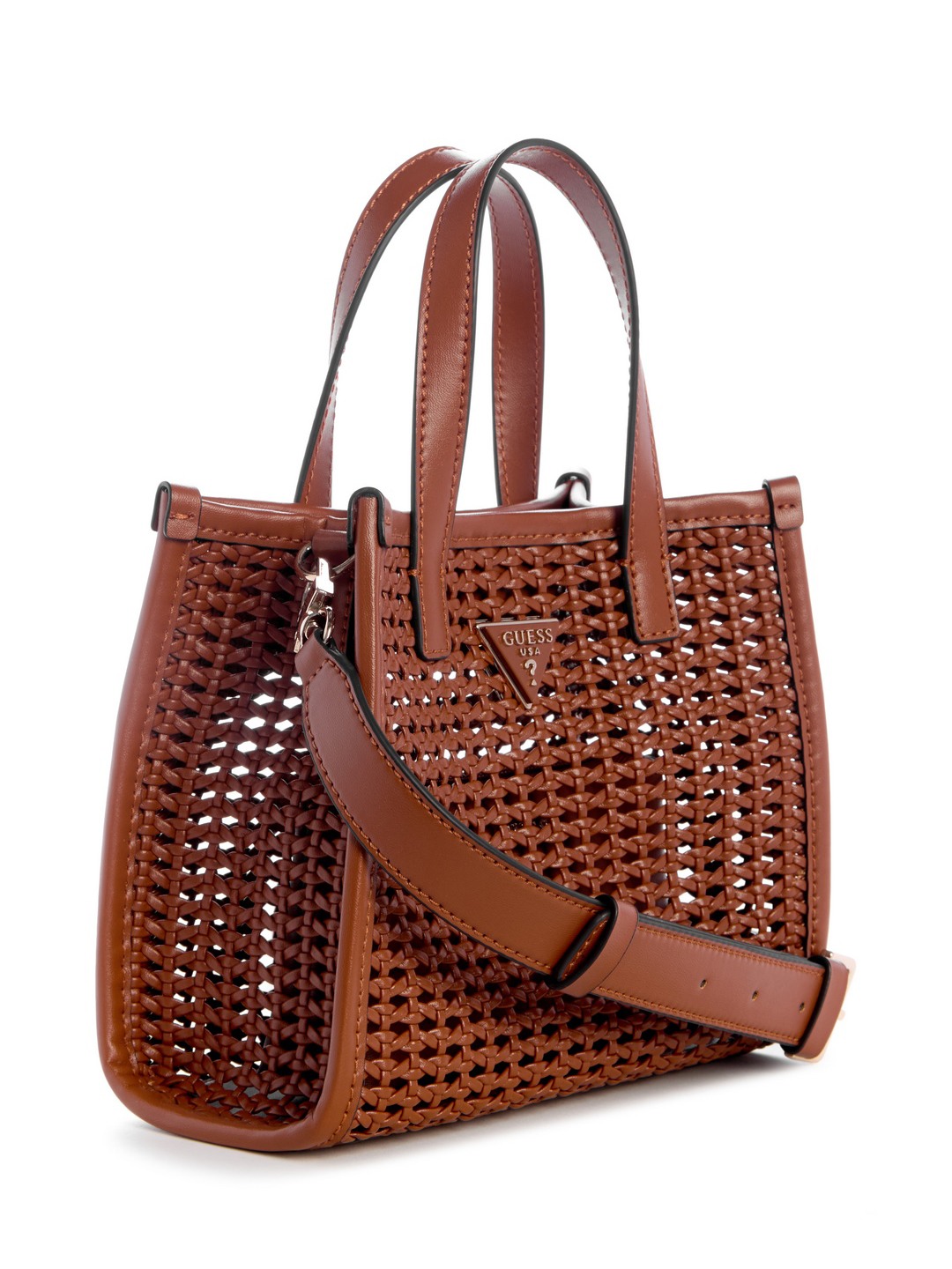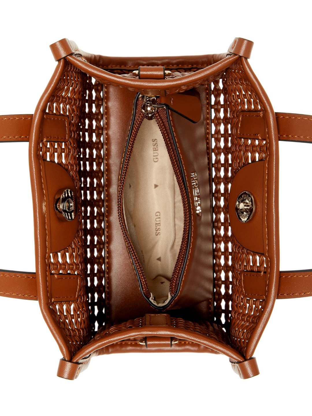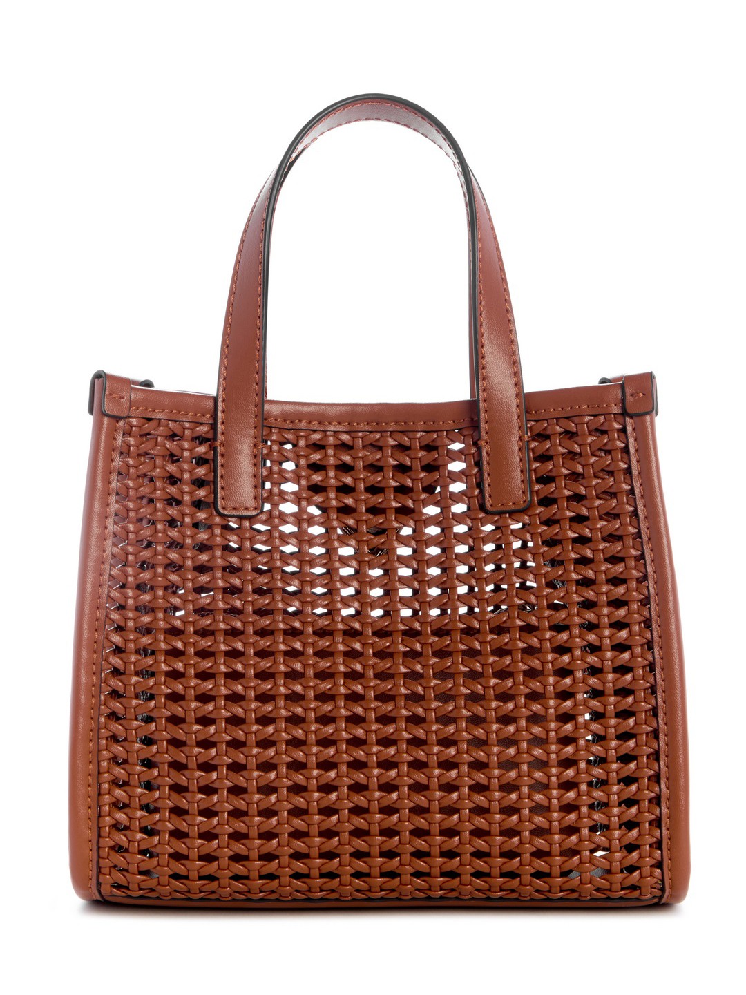 Guess Women Brown Woven Lattice Adjustable Detachable Strap Mini Carryall Tote Bag with Inner Bag