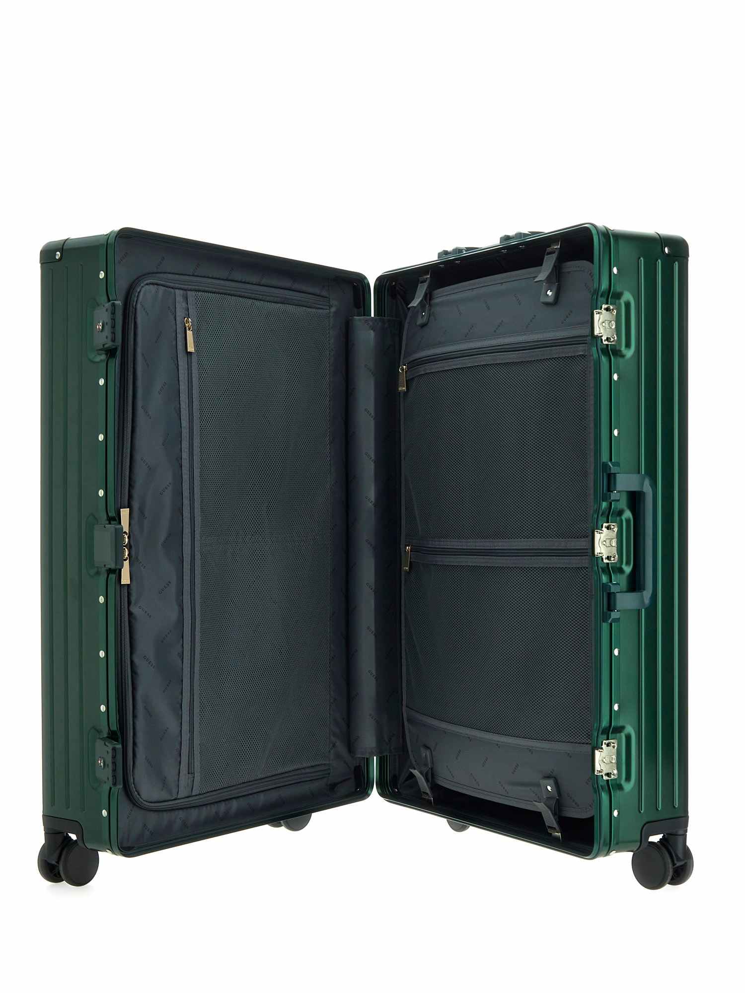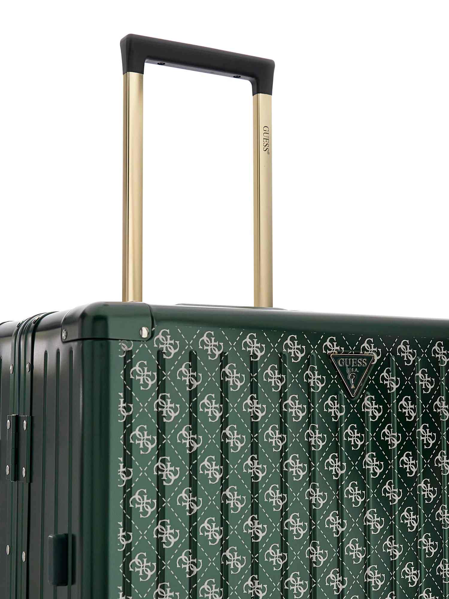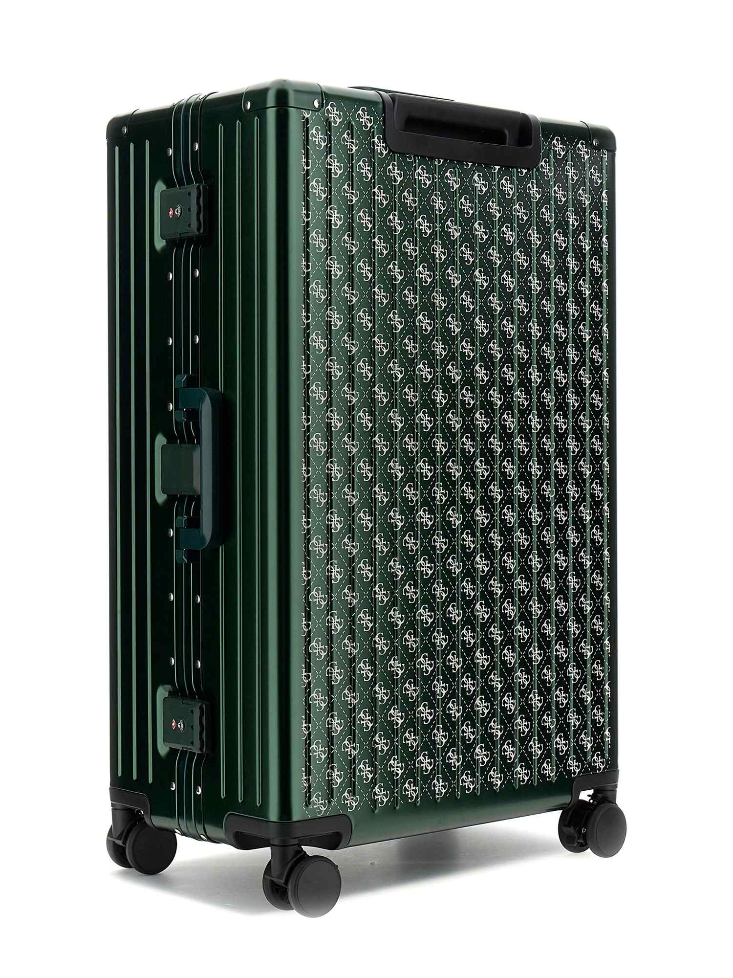 Elevate your travel style with the Guess Green Aluminum Logo Women Trolley Bag. This sleek and stylish luggage piece features a durable aluminum construction, ensuring your belongings stay safe and secure on your journey. The vibrant green color and iconic Guess logo add a touch of sophistication to your travels. With ample storage space and smooth-rolling wheels, this trolley bag is both practical and fashionable. Make a statement wherever you go with this must-have accessory for the modern, on-the-go woman.