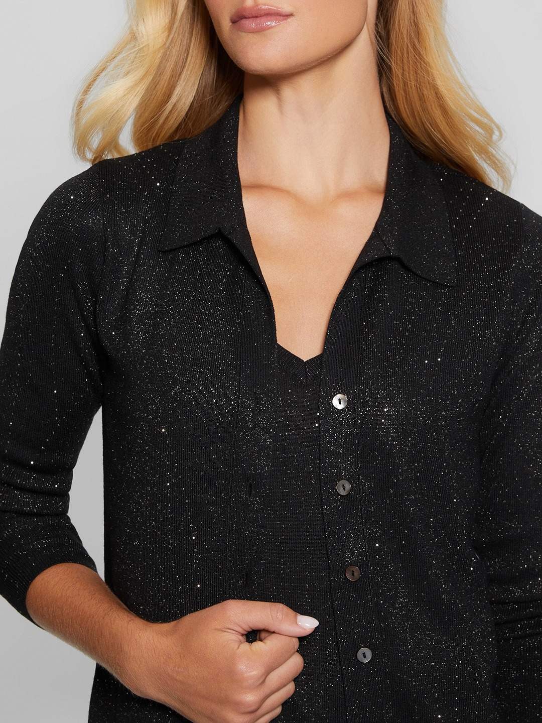 Elevate your style with this chic black sweater, featuring a regular shimmer pattern. Crafted from a soft polyester blend, it offers long sleeves and a sophisticated shirt collar. The button closure adds a touch of elegance, making it perfect for any occasion. Ideal for women seeking comfort and timeless fashion.