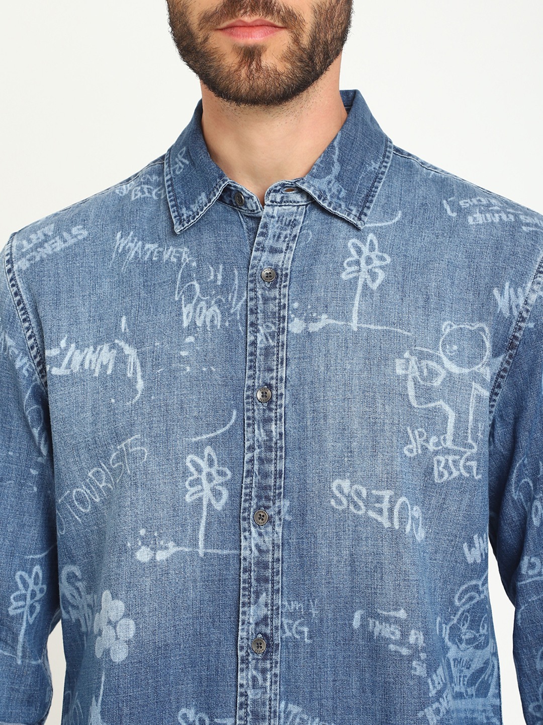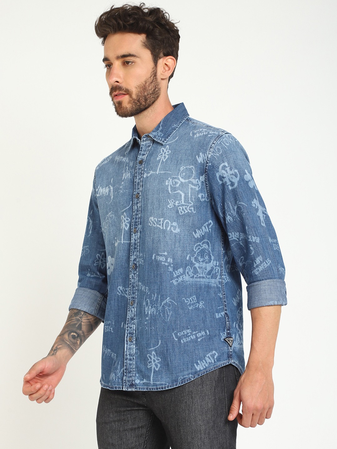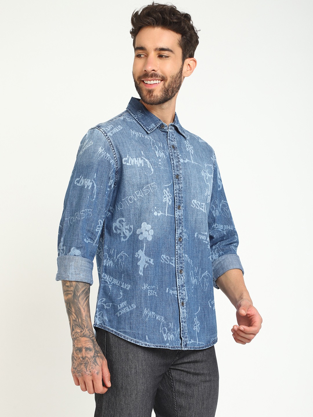 Blue Printed Spread Collar Full Sleeves Denim Shirt