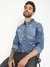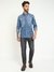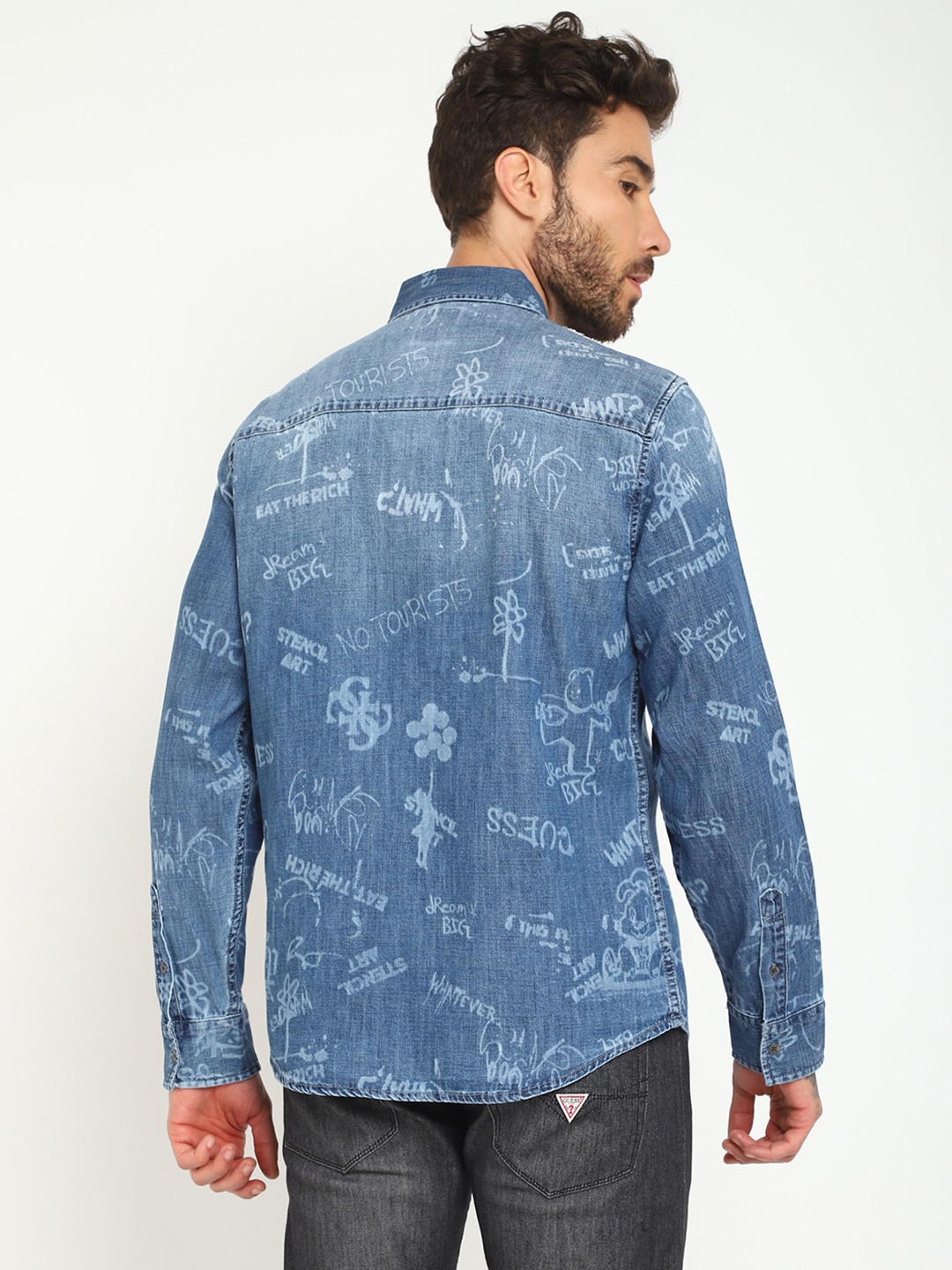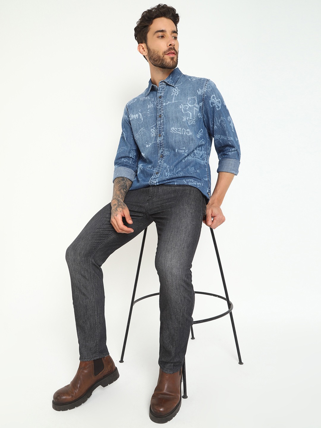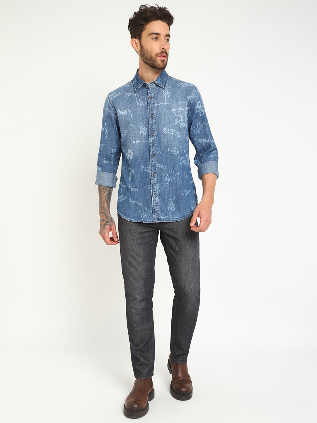 Blue Printed Spread Collar Full Sleeves Denim Shirt