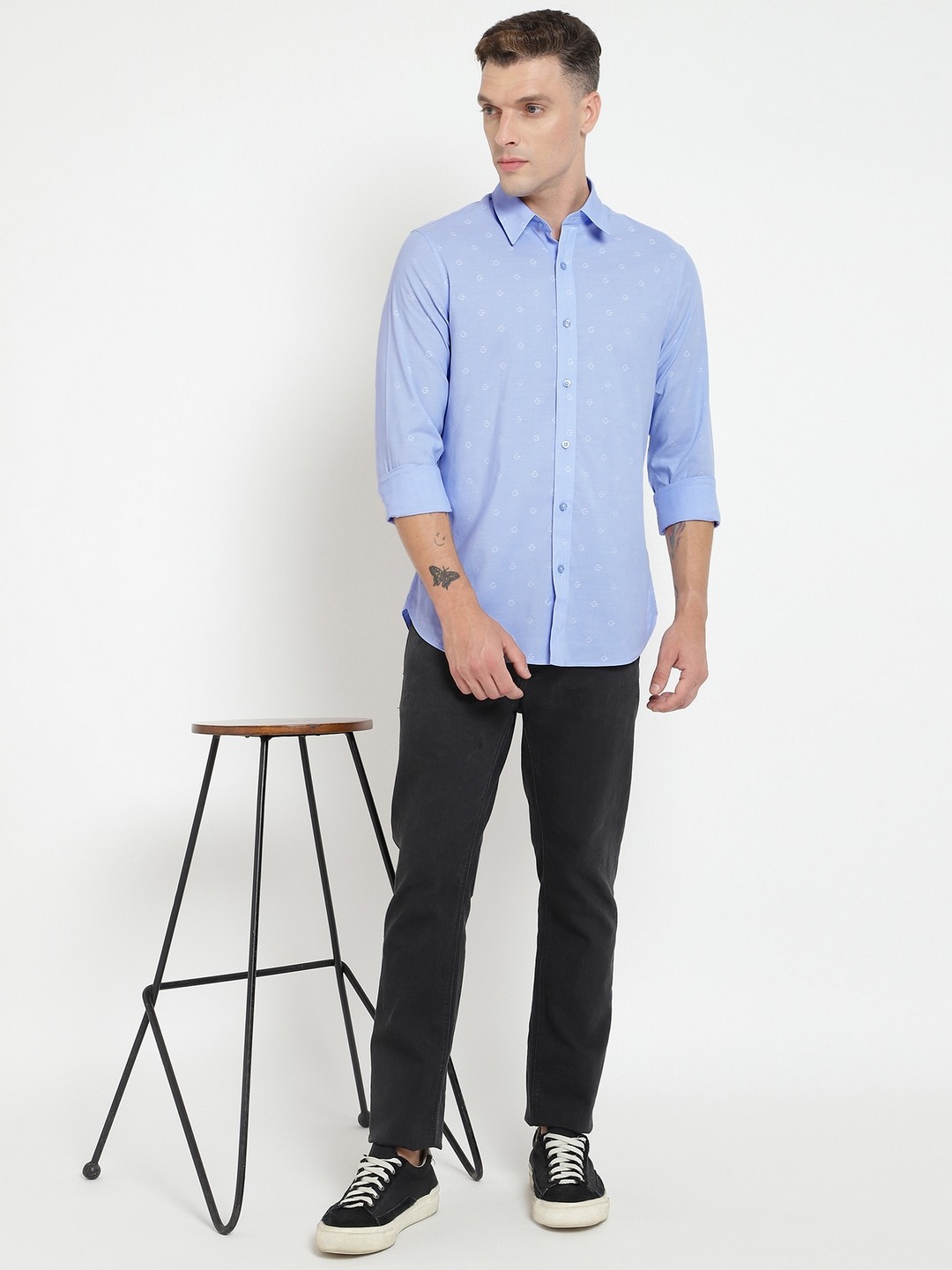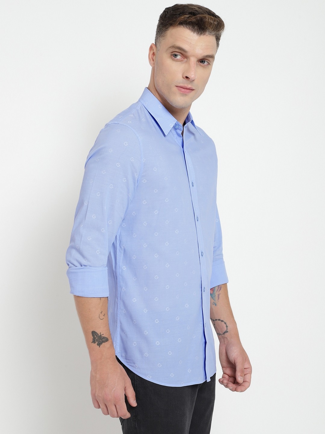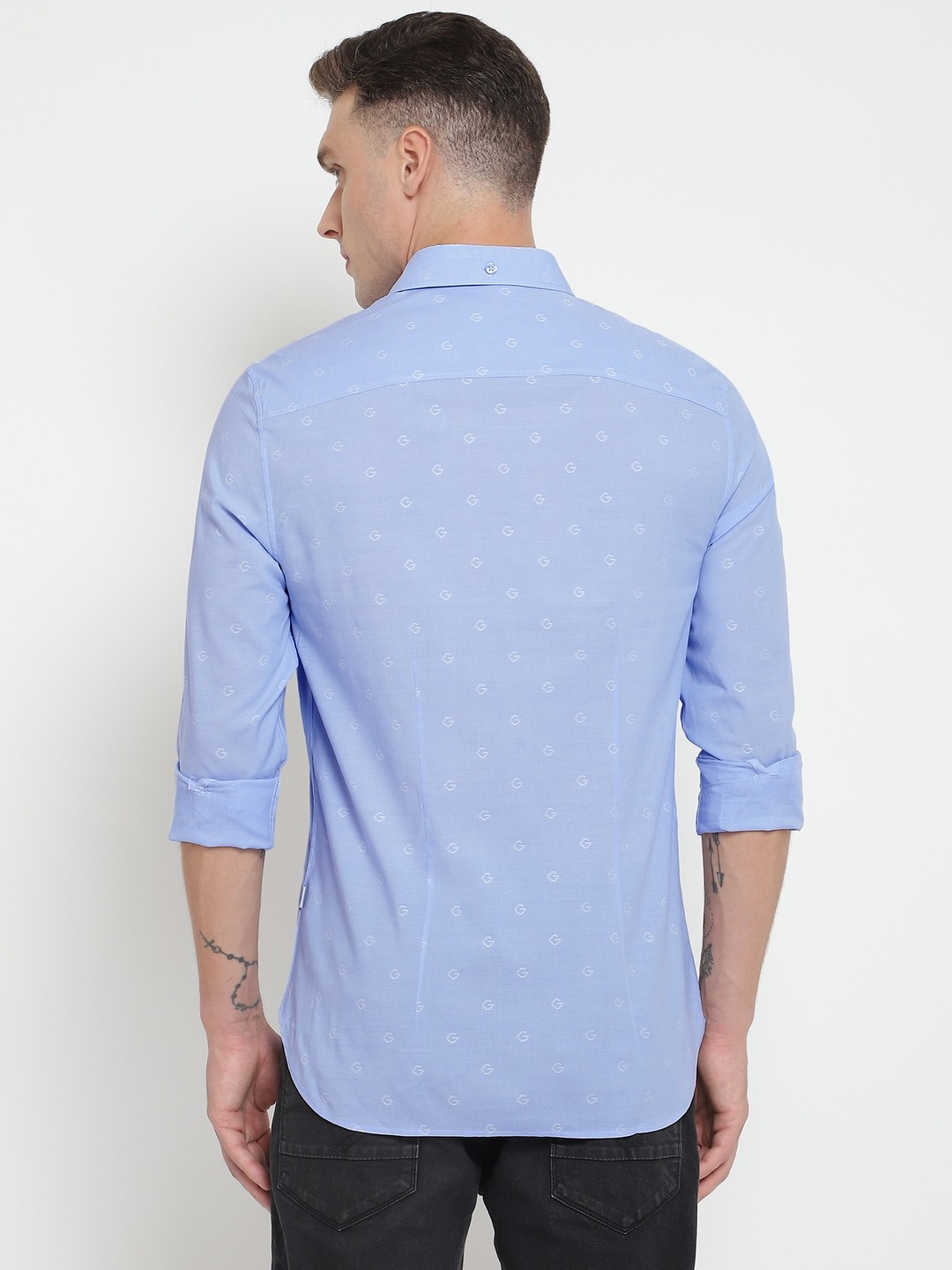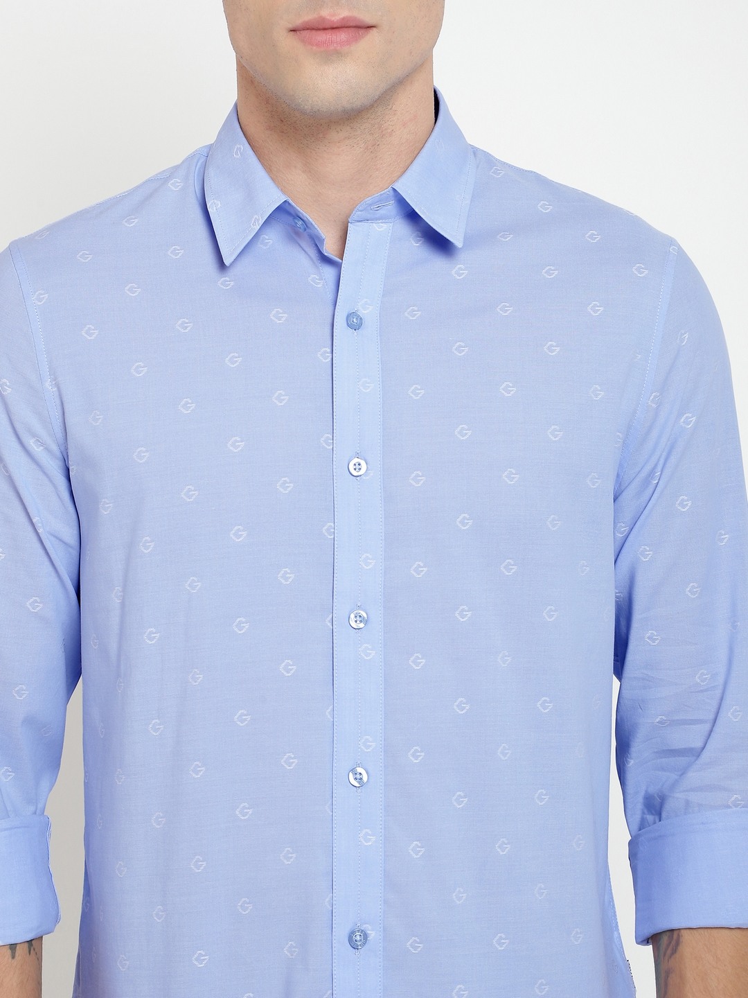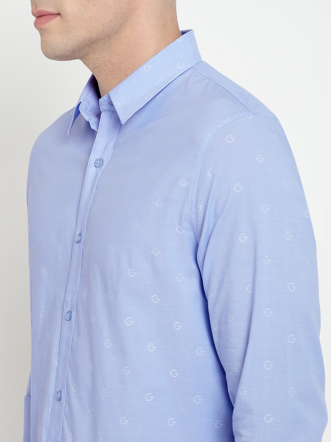 Blue Self Design Spread Collar Full Sleeves Shirt