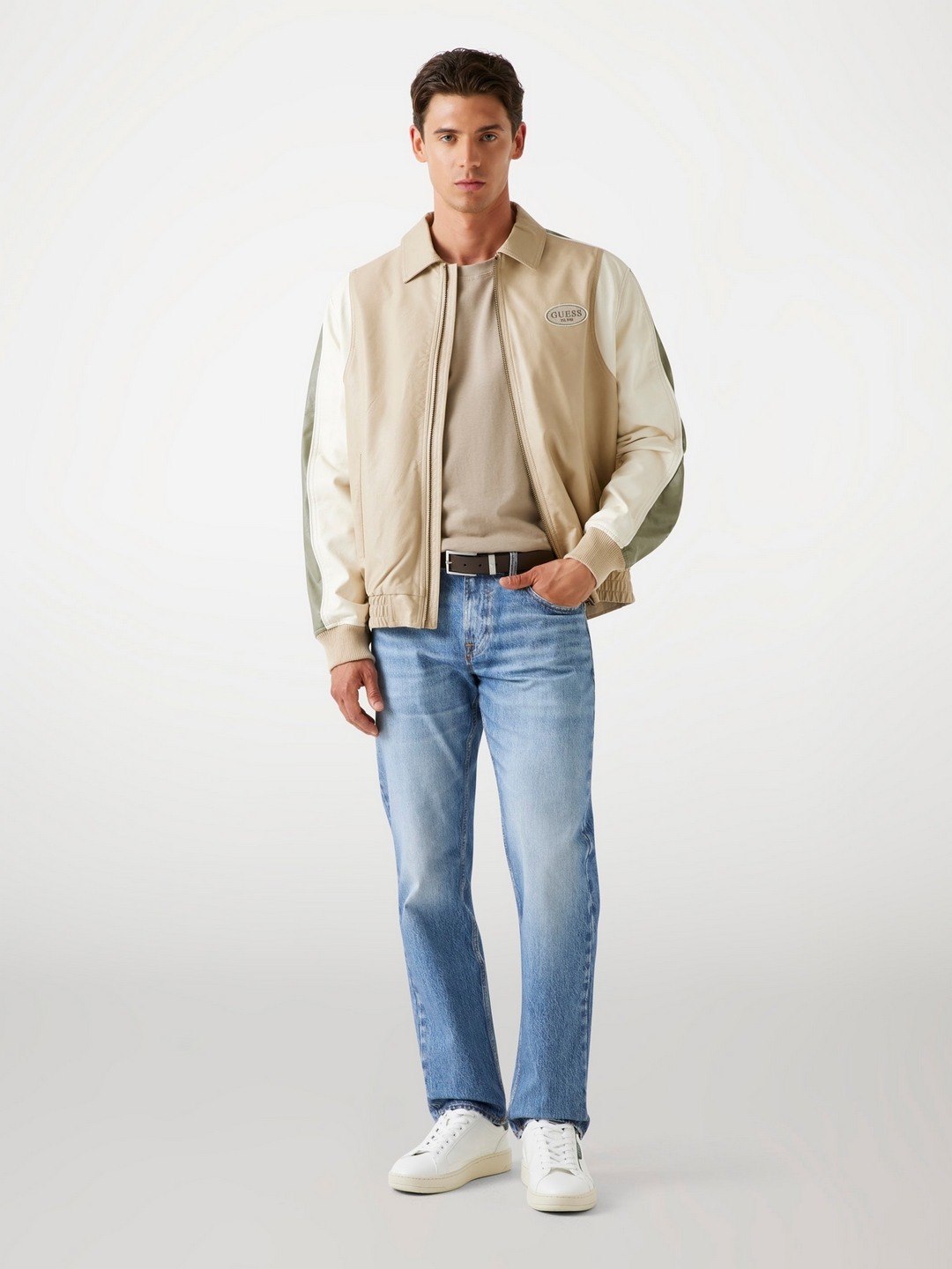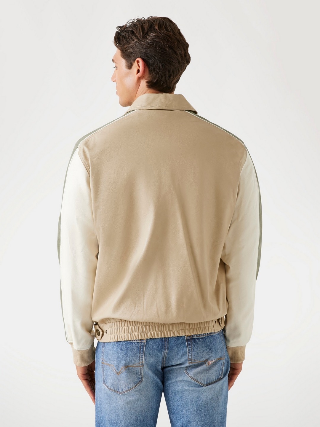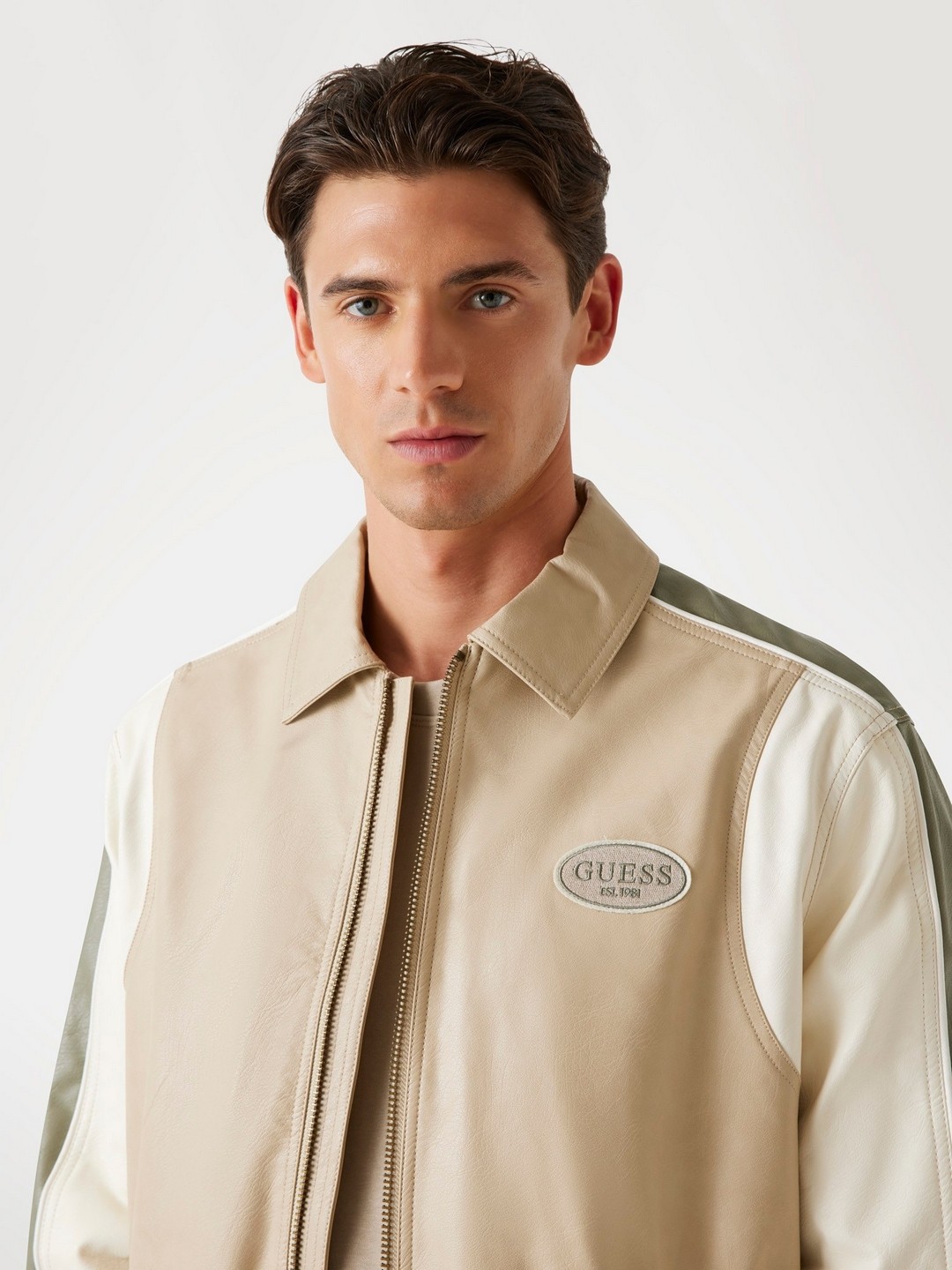 Elevate your style with our men's beige color-blocked jacket, designed for the modern man who values both fashion and function. This regular-fit jacket features a striking color-blocked pattern that adds a contemporary edge to any outfit. Crafted from durable polyurethane fabric, it offers a sleek, leather-like finish that's both water-resistant and easy to maintain. The long sleeves and classic collared design provide a timeless appeal, while the zip closure ensures a secure fit. Perfect for any occasion, this jacket is a versatile addition to your wardrobe.