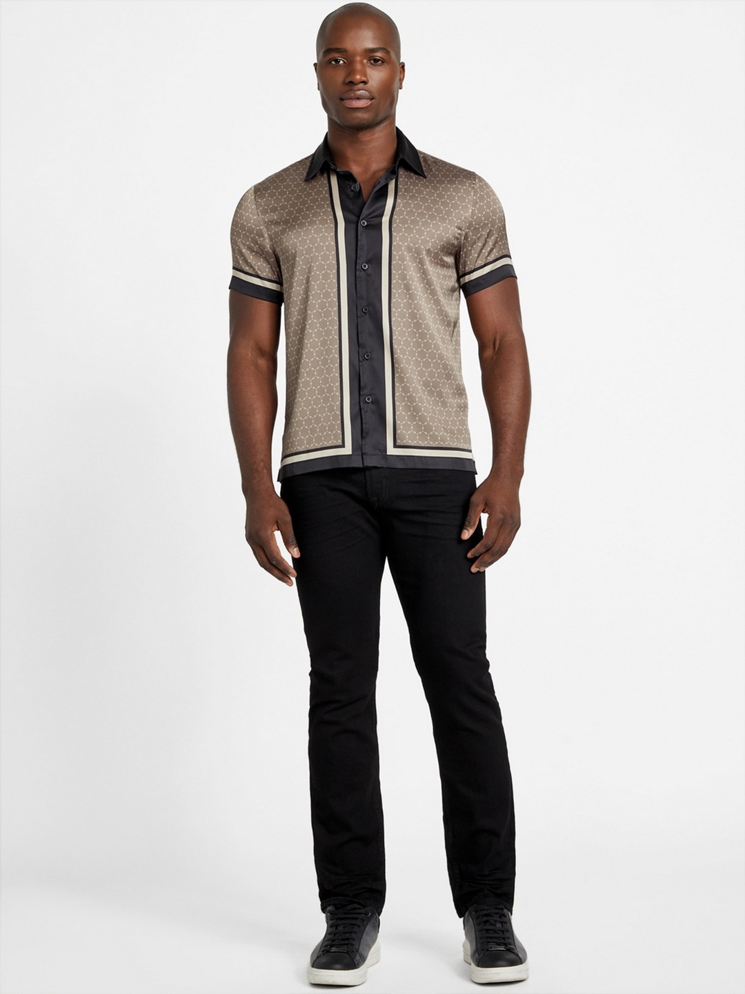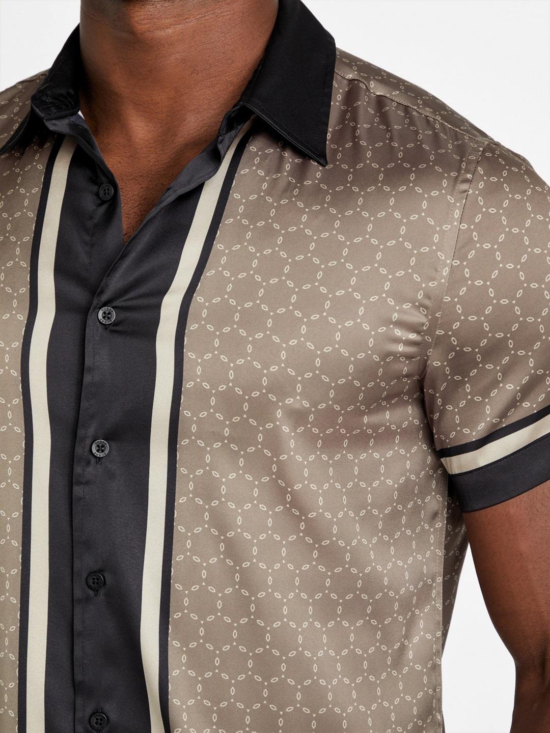 Elevate your wardrobe with our stylish brown geometric pattern shirt, designed for the modern man. This regular fit shirt features a sophisticated spread collar and short sleeves, perfect for any casual or semi-formal occasion. Crafted from a premium polyester blend fabric, it offers both comfort and durability, ensuring you stay cool and confident all day long. The button closure adds a classic touch, making it easy to wear and pair with your favorite trousers or jeans. Embrace effortless style with this versatile piece.