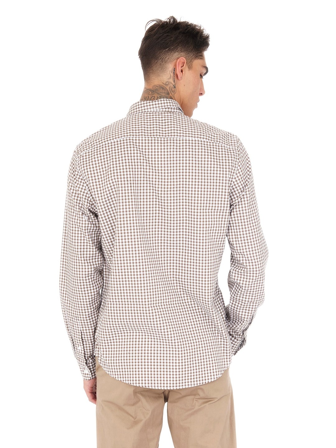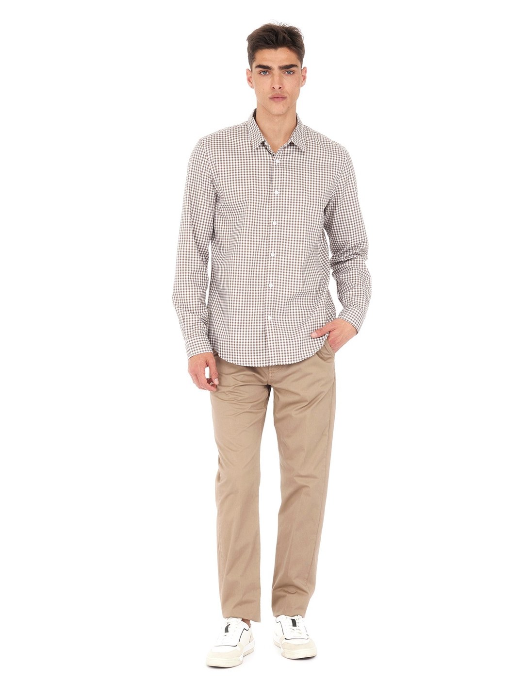 Elevate your wardrobe with this beige checked shirt, featuring a regular fit and long sleeves. Crafted from premium cotton, it offers comfort and style. The spread collar and button closure add a classic touch, making it perfect for any occasion. Ideal for the modern man seeking timeless elegance and versatility.