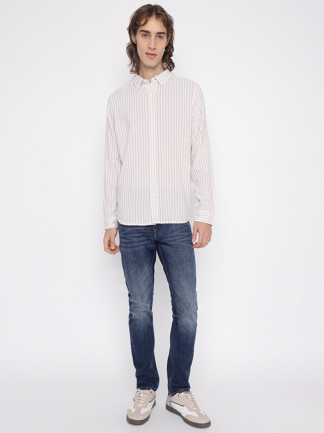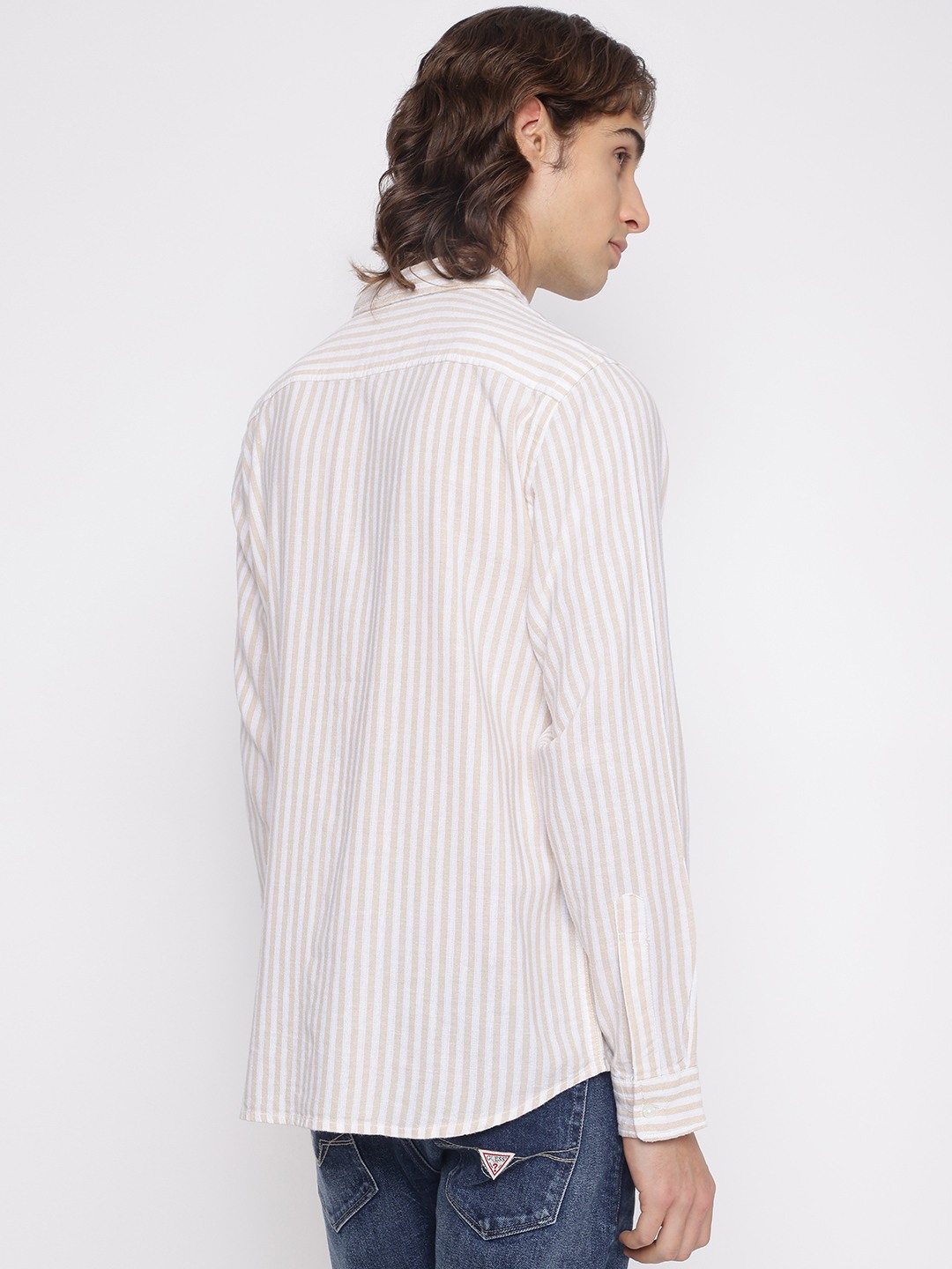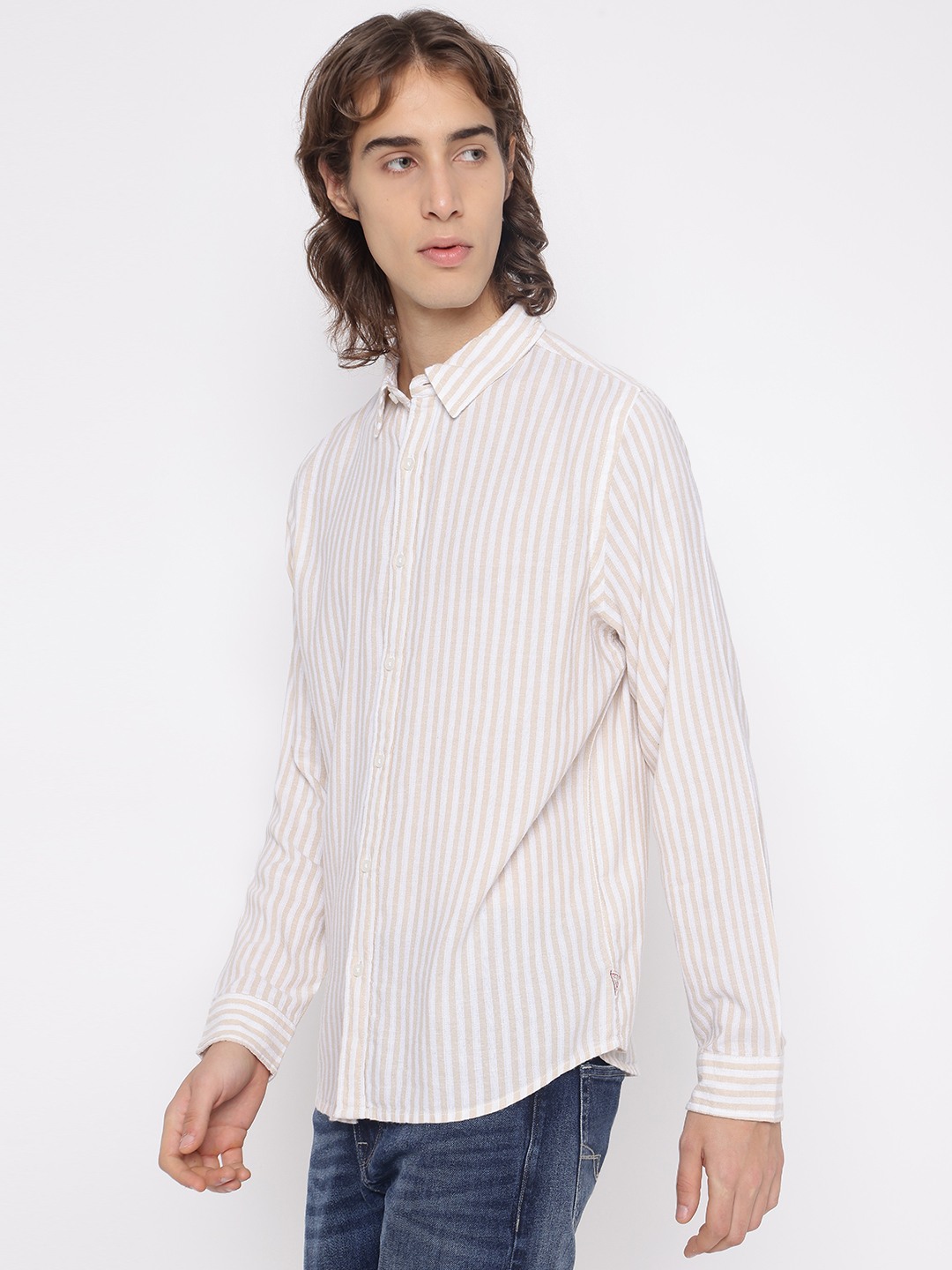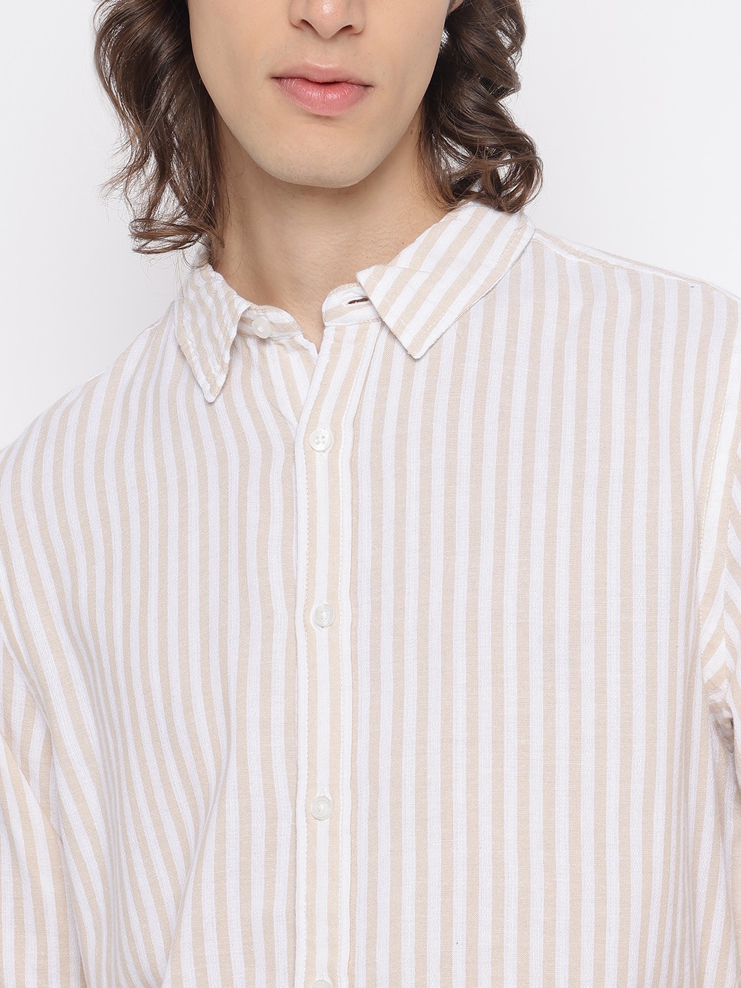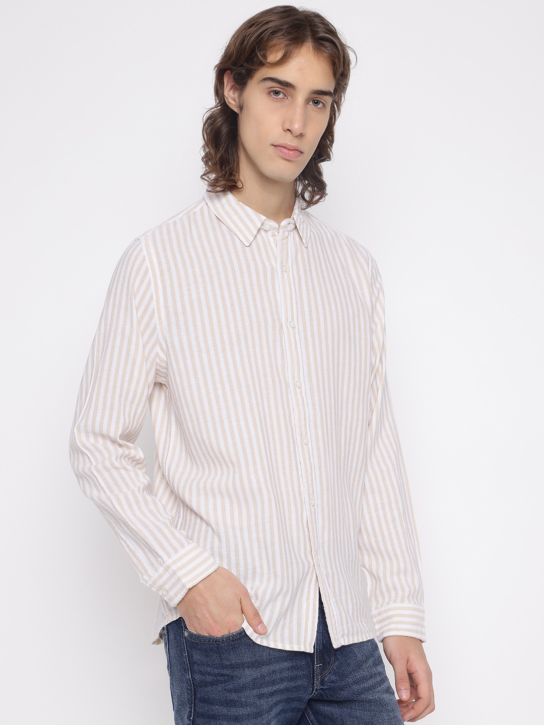 Elevate your wardrobe with this beige shirt, featuring a sophisticated vertical pattern. Designed for men, it offers a regular fit with long sleeves and a spread collar. Crafted from a comfortable cotton blend fabric, it ensures all-day wearability. The button closure adds a classic touch, making it perfect for any occasion.