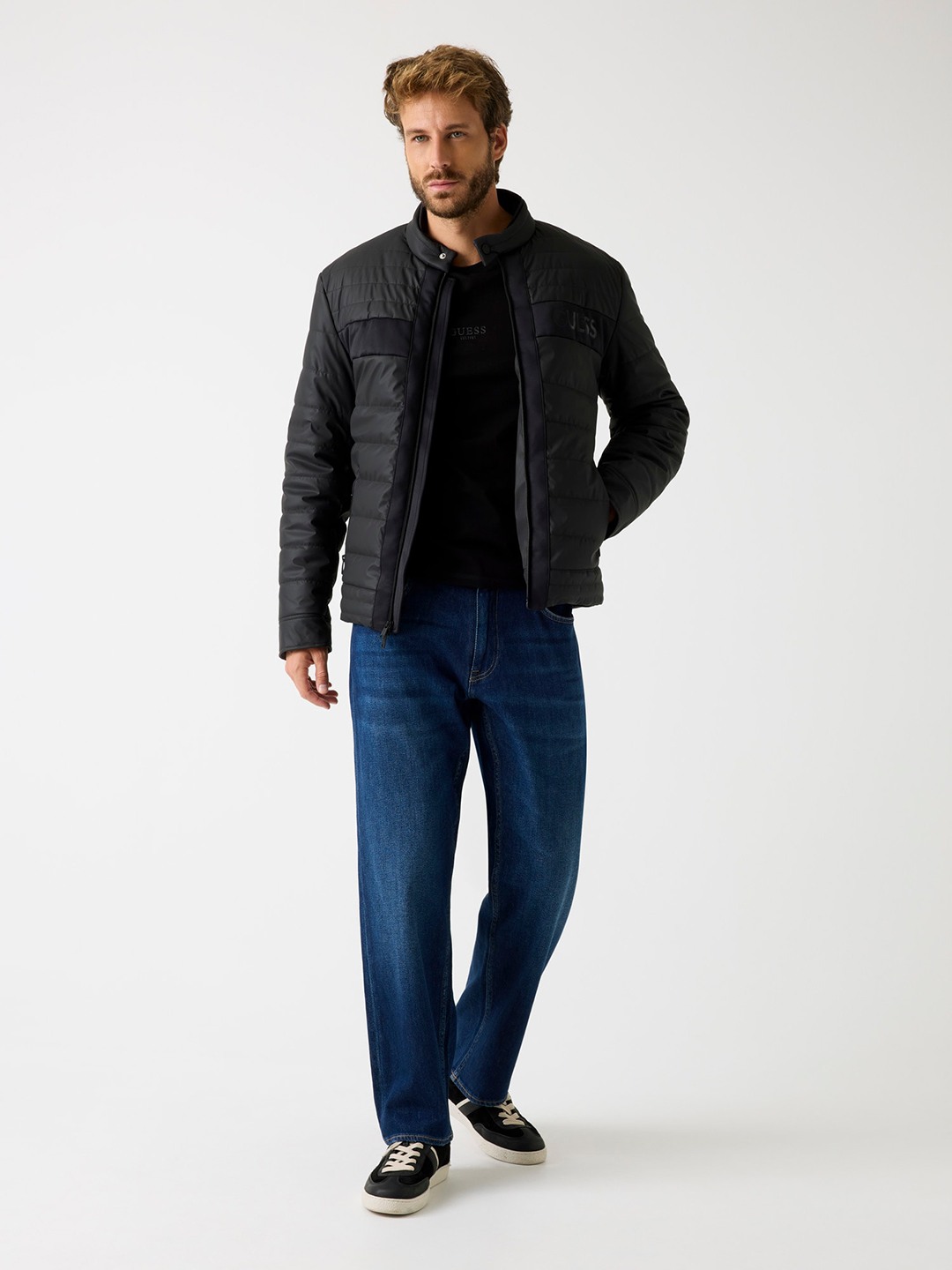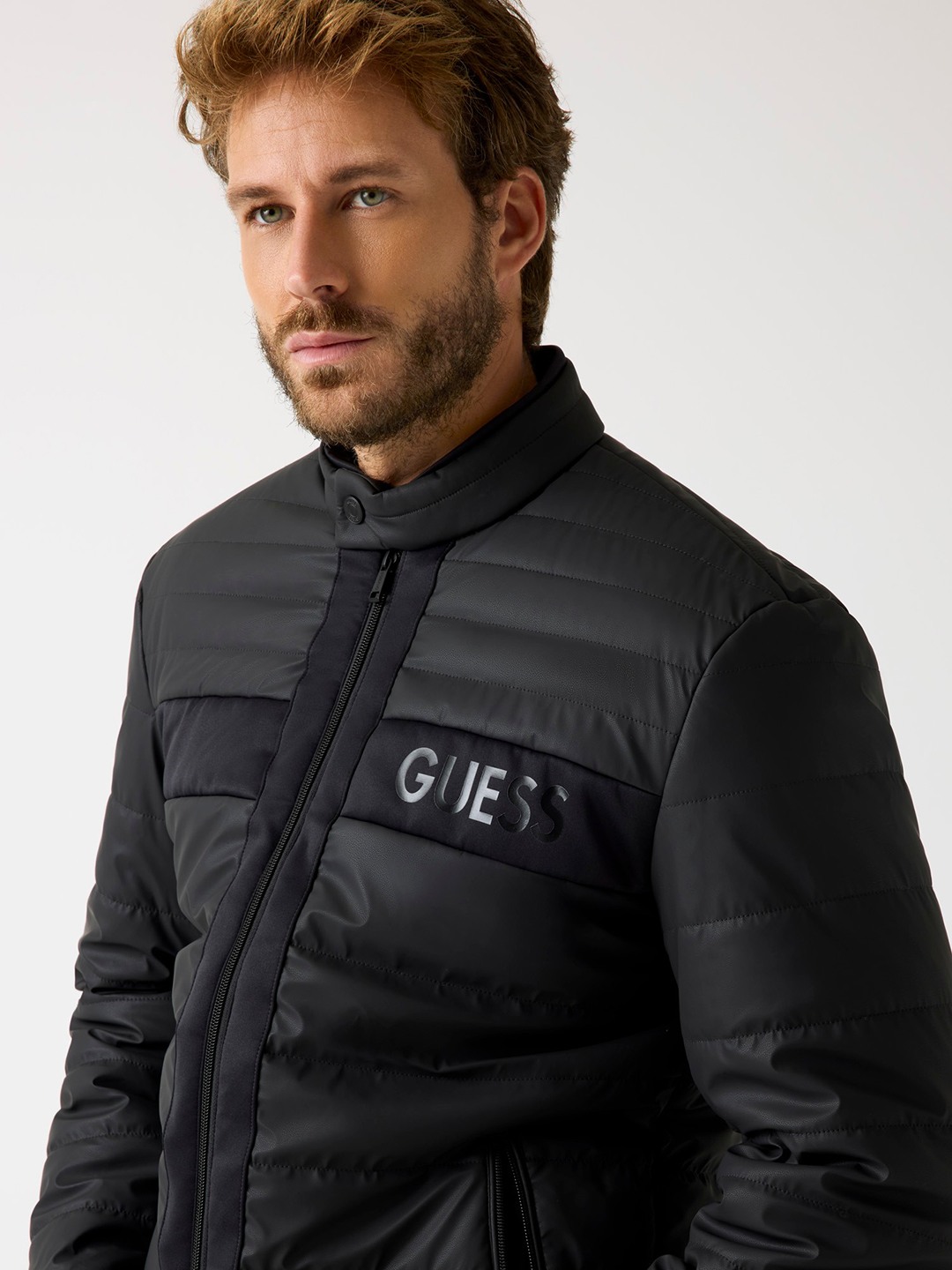 Elevate your style with our sleek black quilted jacket, designed for the modern man. This regular-fit jacket combines functionality and fashion, featuring a sophisticated quilted pattern that adds texture and depth. Crafted from durable polyurethane fabric, it offers a lightweight yet robust wear. The full sleeves and high neck provide extra warmth and protection against the elements. A convenient zipper closure ensures easy wearability, making it an ideal choice for both casual outings and formal occasions.