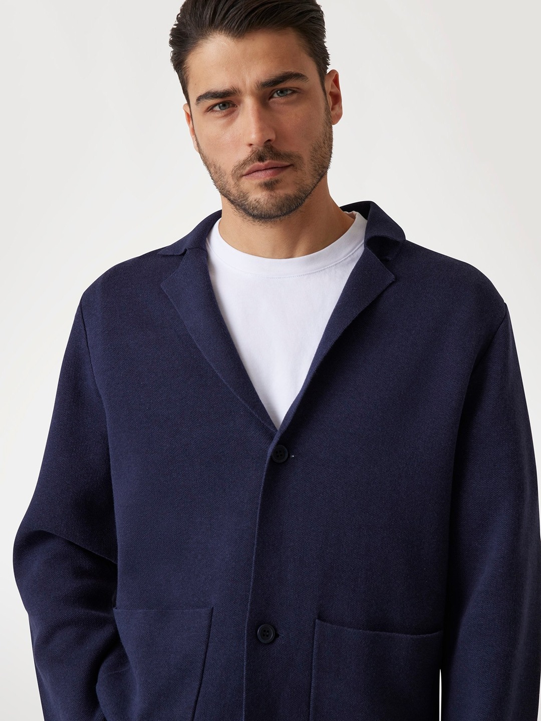 Elevate your style with this navy blue blazer, featuring a regular fit and solid pattern. Crafted from a luxurious viscose blend, it offers comfort and sophistication. The long sleeves and notch collar add classic elegance, while the button closure ensures a polished look. Perfect for any occasion, this blazer is a wardrobe essential.