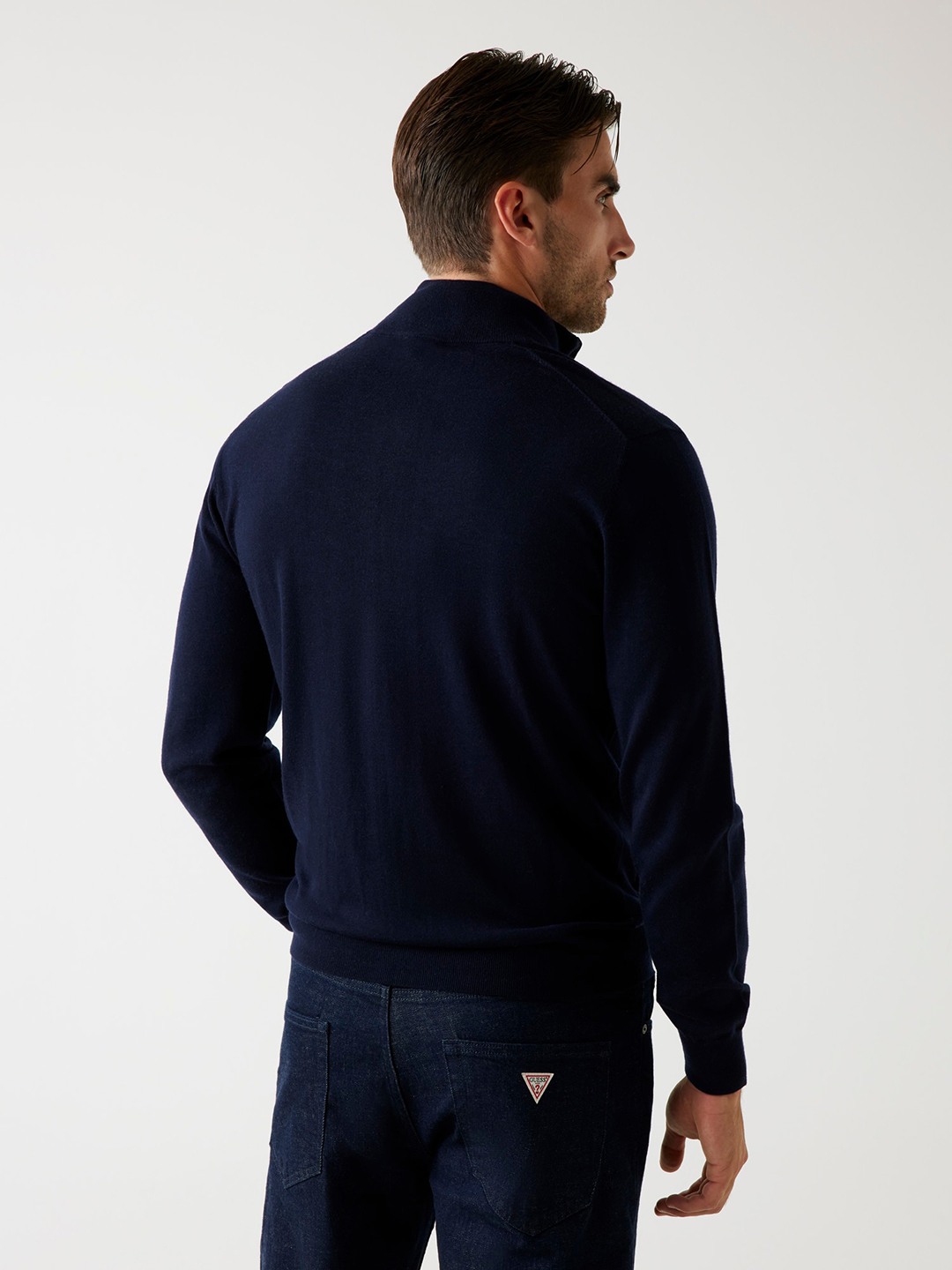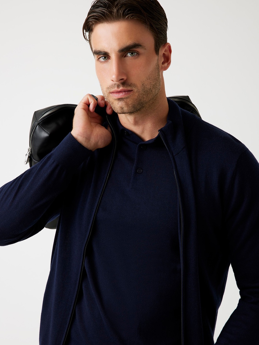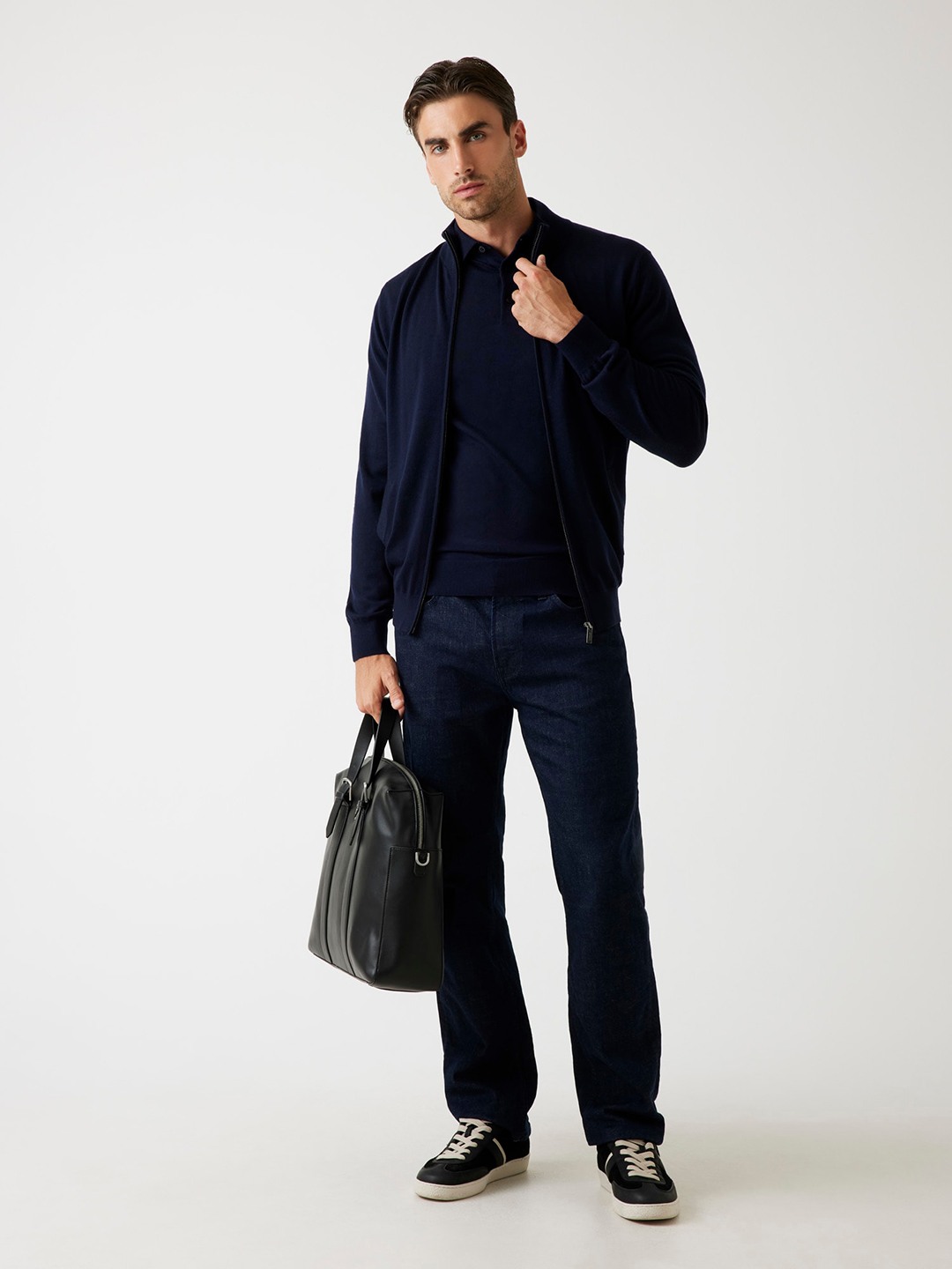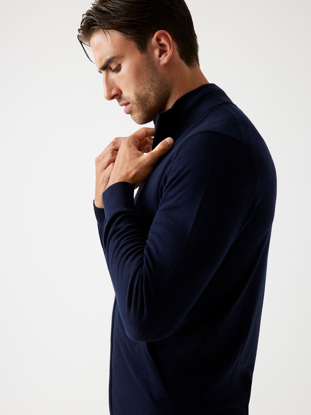 Elevate your winter wardrobe with our sophisticated navy blue sweater, designed for the modern man who values both style and comfort. This regular-fit sweater features a timeless solid pattern, making it a versatile addition to any outfit. Crafted from premium wool fabric, it ensures warmth and softness against the skin. The full sleeves and high neck provide extra coverage, while the convenient zipper closure adds a contemporary touch. Perfect for layering or wearing solo, this sweater is a must-have for any fashion-forward gentleman.