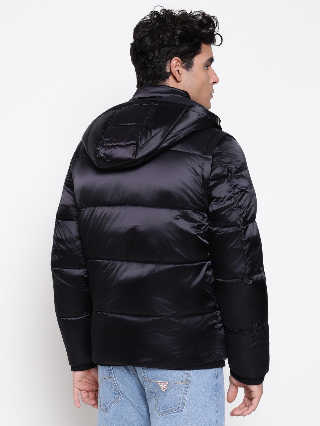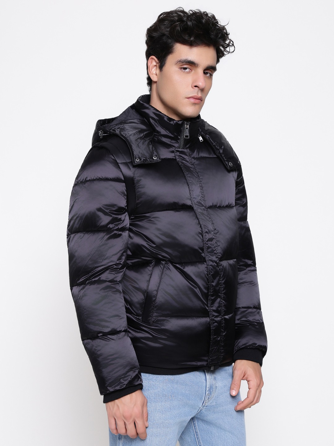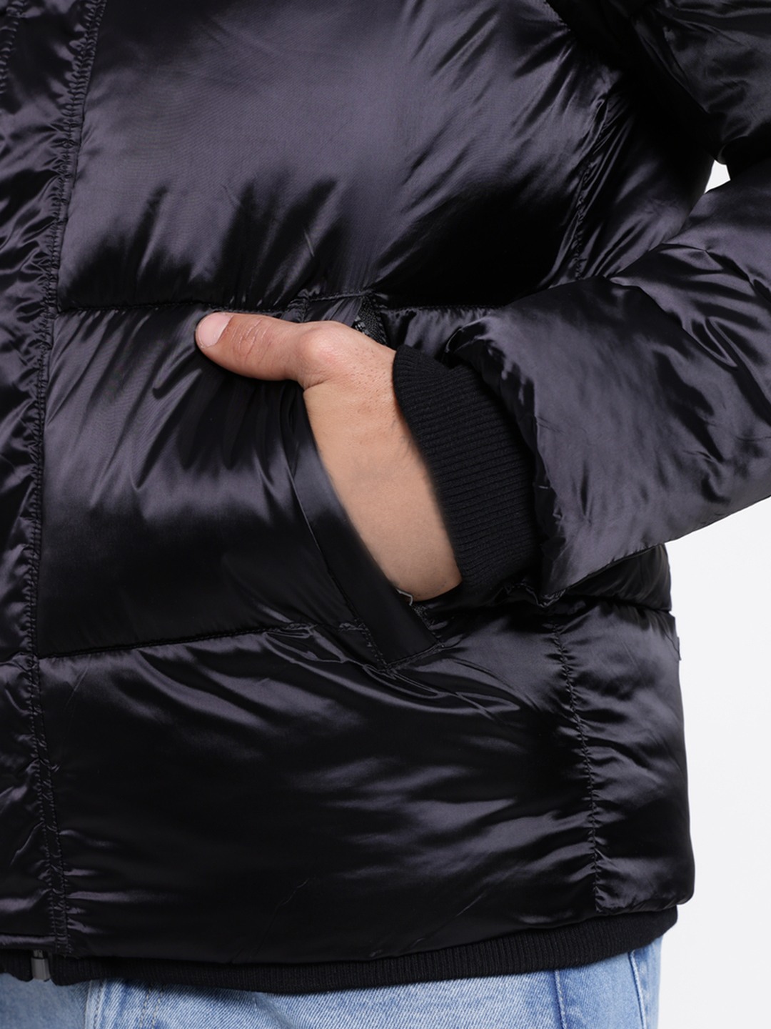 Experience style and comfort with this satin wet effect metallized puffer jacket in black. Designed for men, it features a regular fit and solid pattern, making it versatile for various occasions. The full sleeves and hooded neck provide added warmth and protection against the elements. Crafted from durable polyamide fabric, it offers a sleek look with a zipper closure for easy wear. Perfect for those who want to make a statement while staying cozy, this jacket combines fashion and functionality effortlessly.