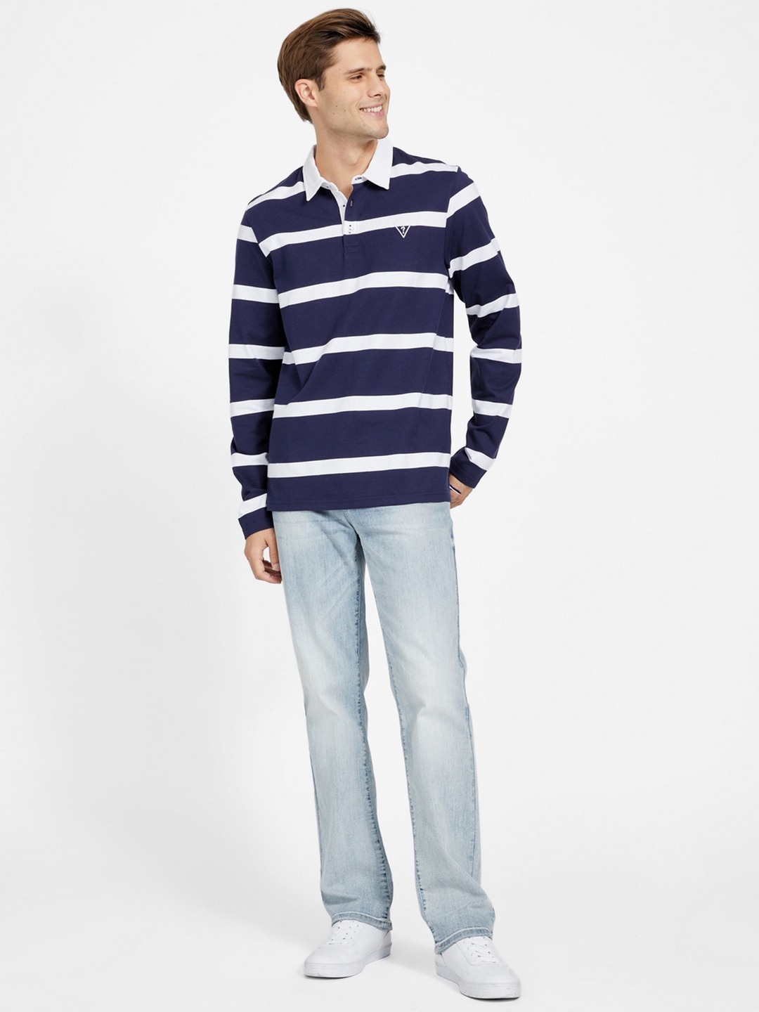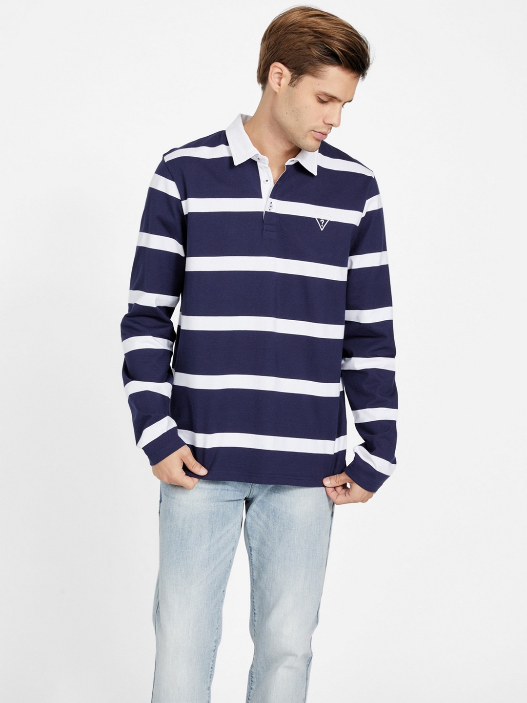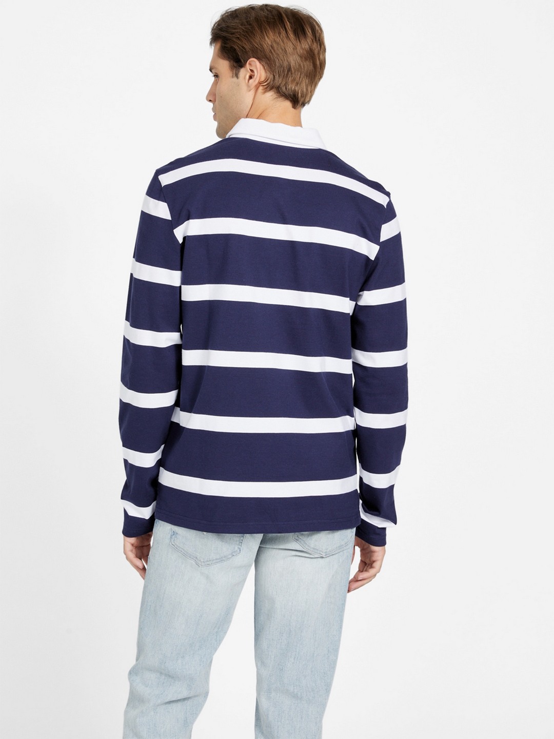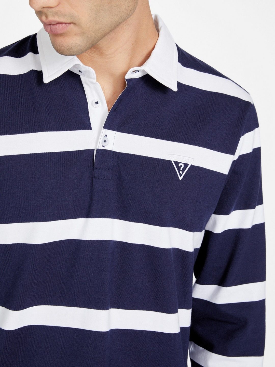 Elevate your sporty style with our Men's Navy Blue Rugby T-Shirt, featuring a classic striped pattern that exudes timeless appeal. Crafted from premium cotton fabric, this long-sleeve shirt ensures comfort and breathability, perfect for both casual outings and active days. The spread collar adds a touch of sophistication, while the button closure offers a secure fit and easy wearability. Whether you're on the field or off-duty, this rugby tee combines functionality with fashion, making it a versatile wardrobe staple.