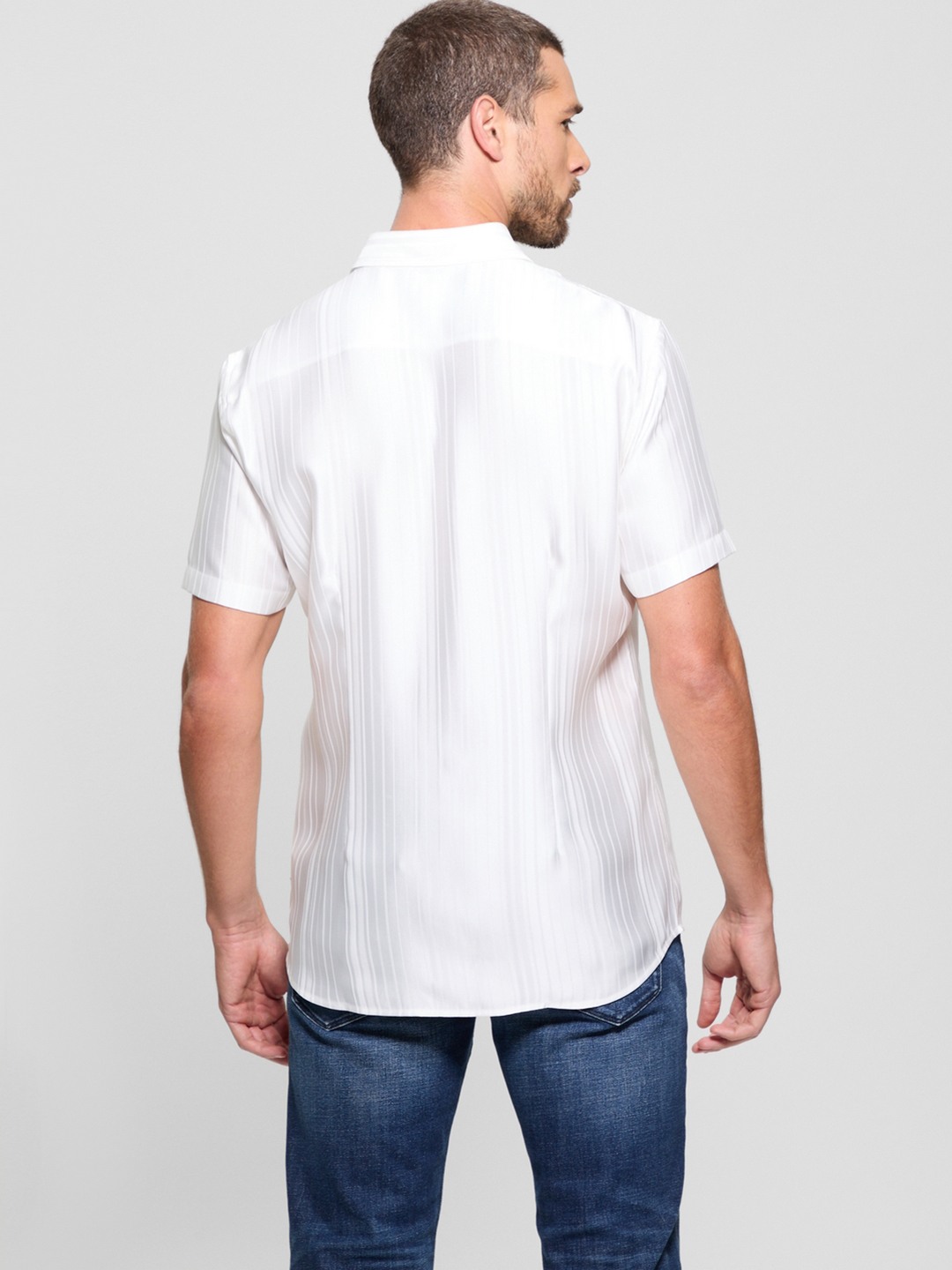 Elevate your style with our men's white shirt, featuring a classic stripe pattern. Crafted from premium polyester, it offers comfort and durability. The short sleeves and collar neck add a touch of sophistication, while the button closure ensures a perfect fit. Ideal for both casual and formal occasions.