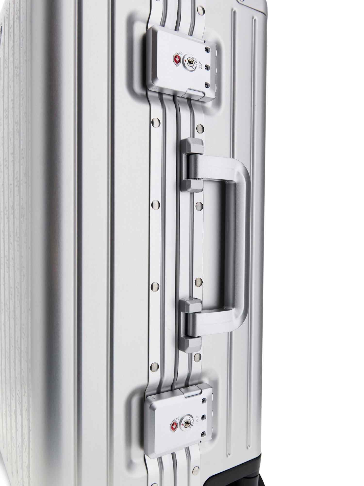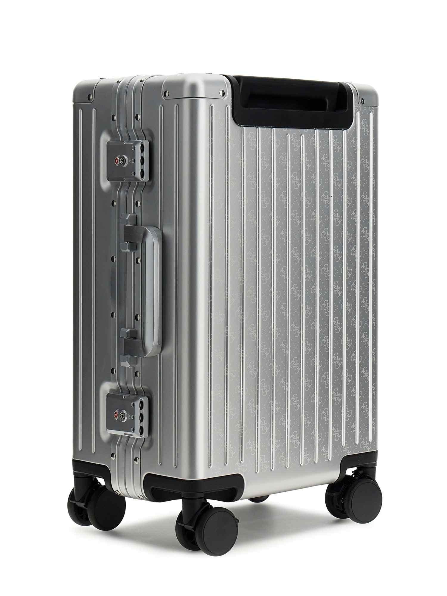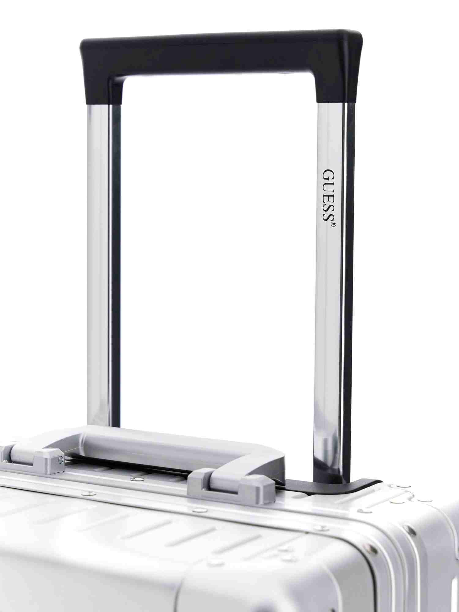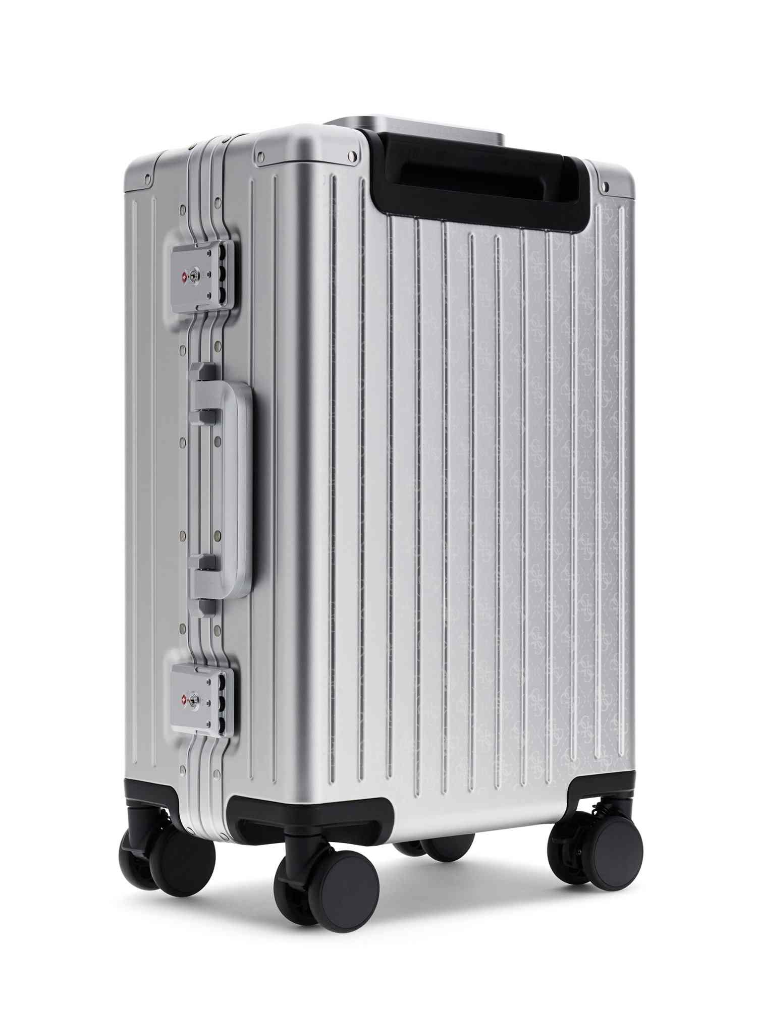 Elevate your travel style with the Guess Silver Aluminum Logo Women Trolley Bag. This sleek and stylish trolley bag not only features a stunning silver aluminum finish and iconic Guess logo, but also offers ample space for all your essentials. With smooth-rolling wheels and a retractable handle, this bag is perfect for on-the-go lifestyles. Stand out from the crowd and make a statement wherever your travels take you with this chic and functional trolley bag.