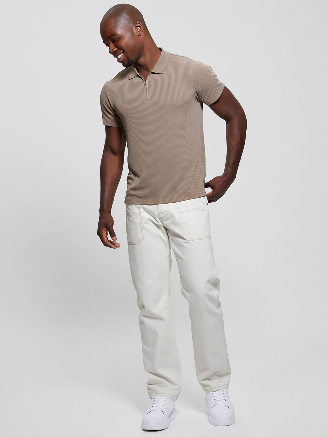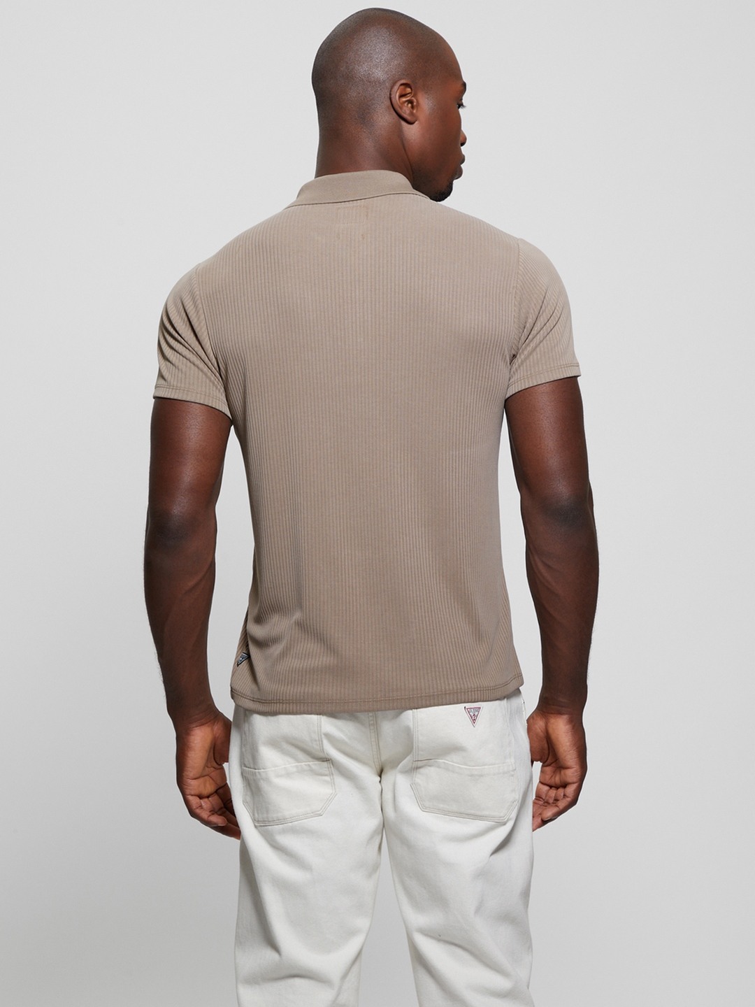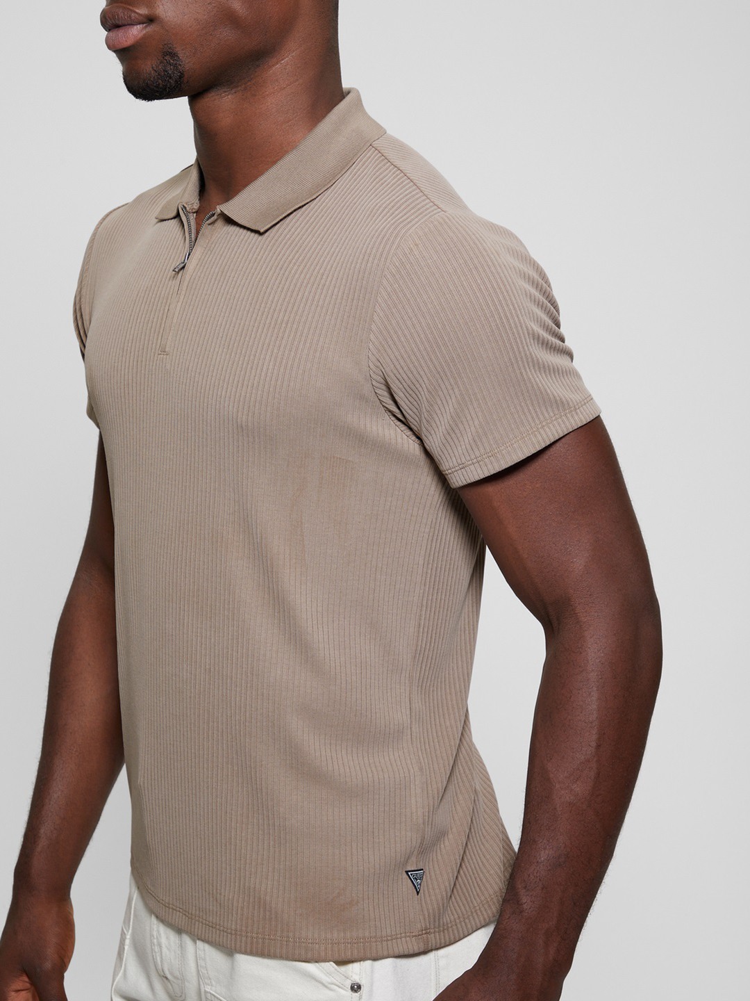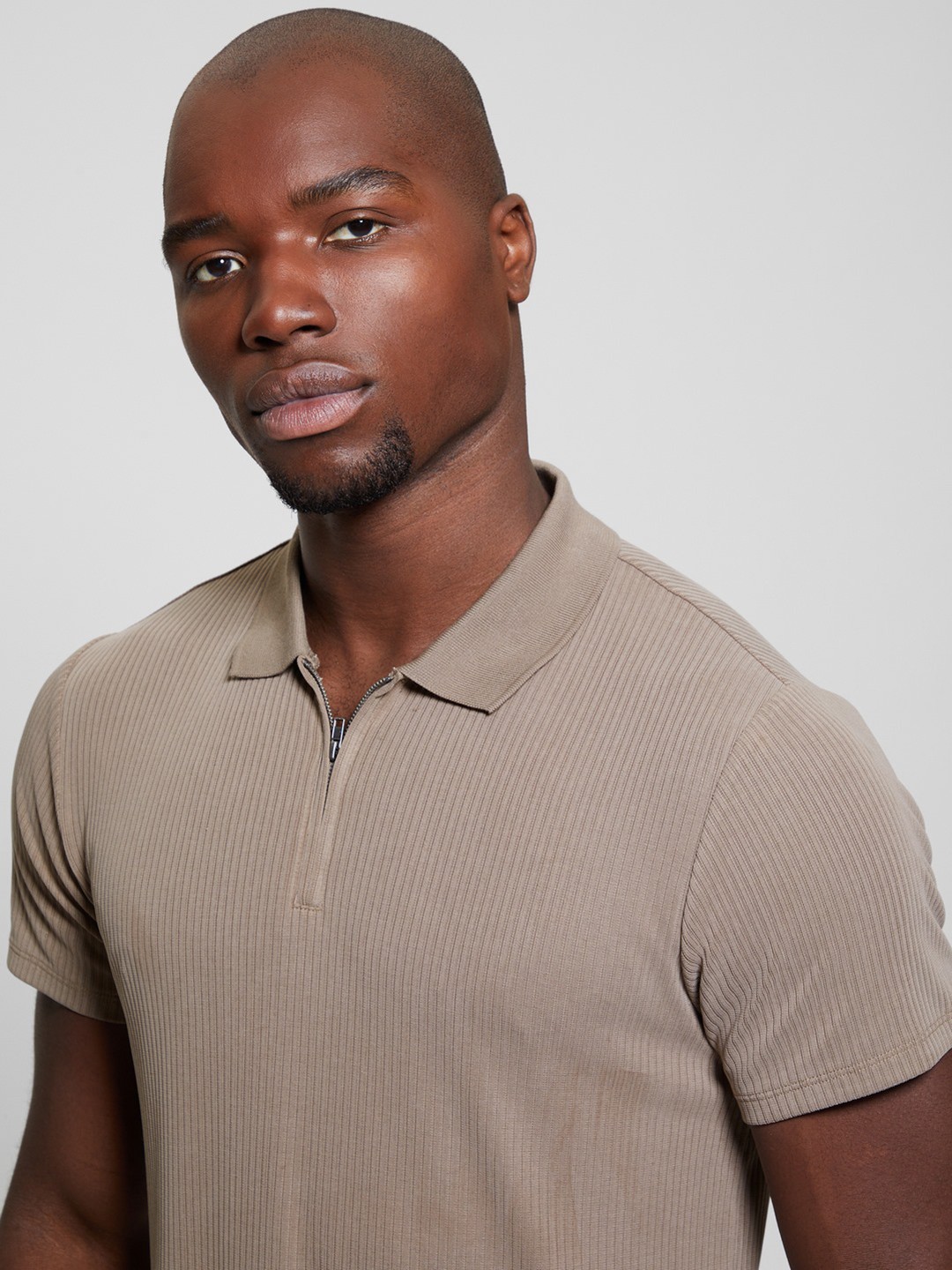Elevate your style with our beige polo t-shirt, featuring a sophisticated ribbed pattern. Crafted from a premium modal blend, it offers unmatched comfort and breathability. The short sleeves and collar neck add a classic touch, while the zipper closure provides a modern twist. Perfect for any occasion, this polo is a wardrobe essential.