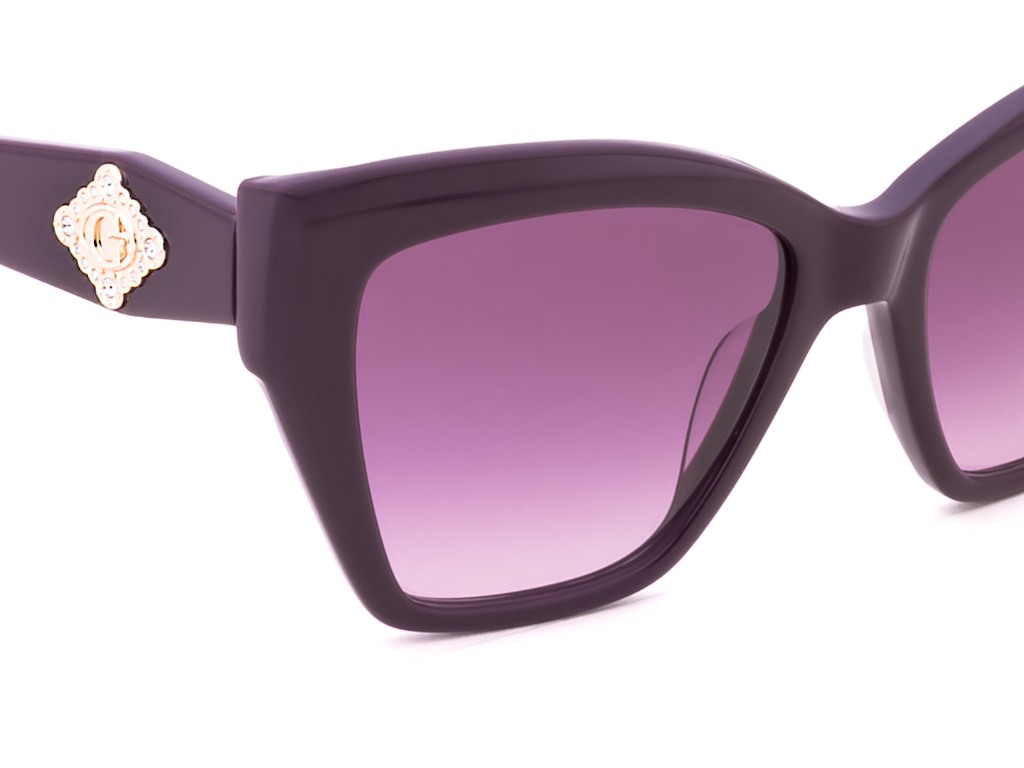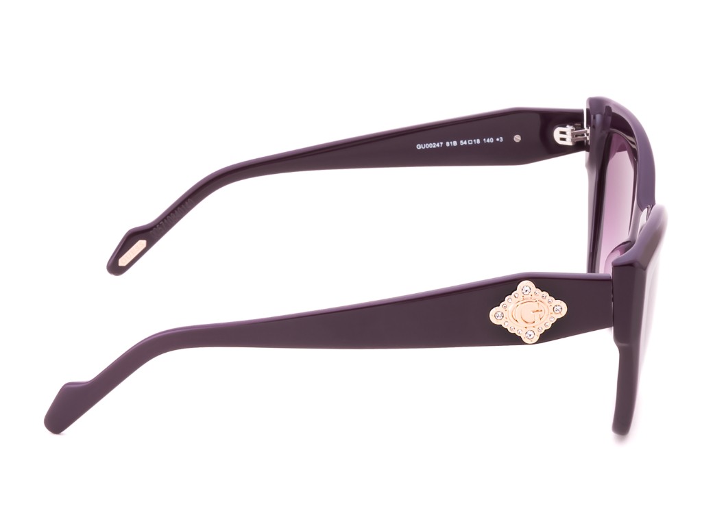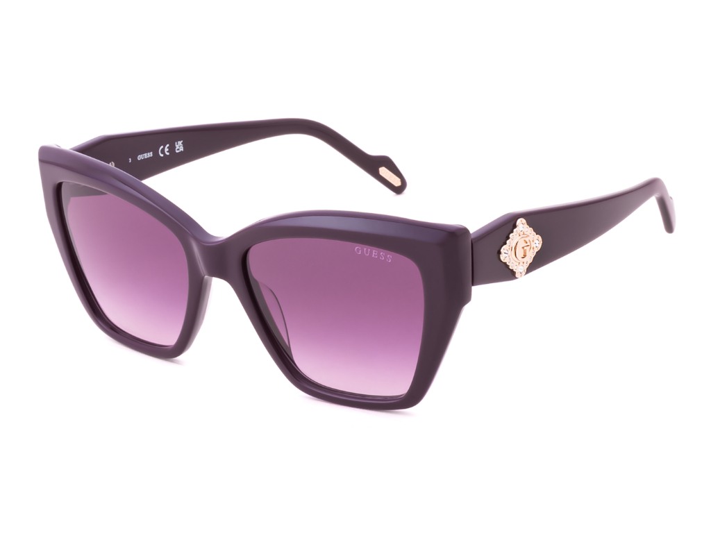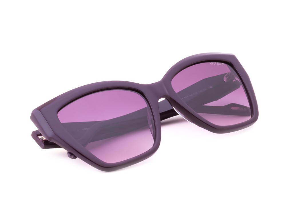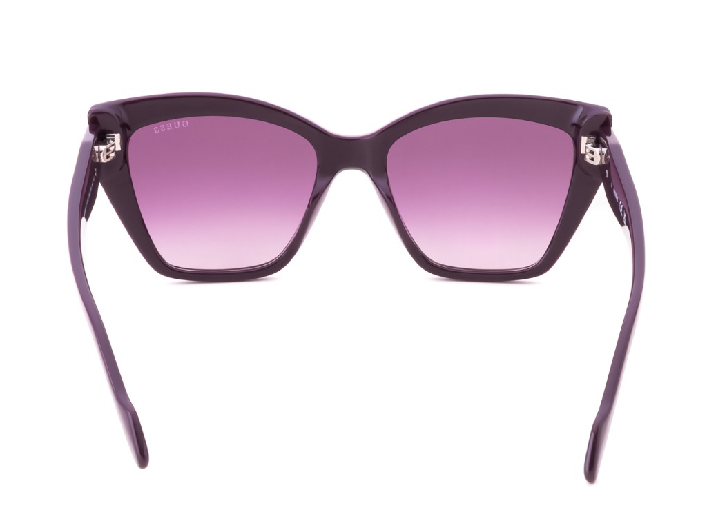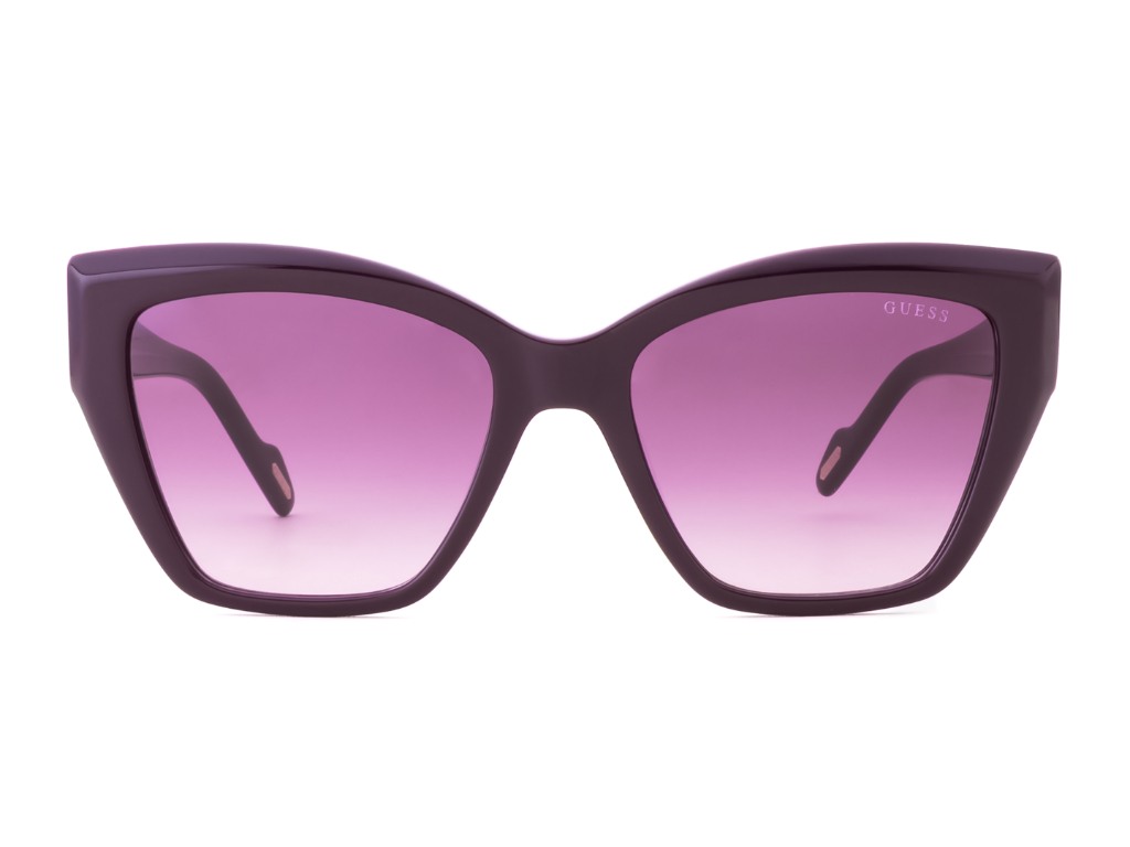 Discover the allure of Guess butterfly sunglasses, featuring a chic full rim frame in shiny violet acetate. Designed for women who embrace style, these sunglasses boast smoke to pink gradient lenses, offering a seamless blend of fashion and function. Elevate your look with this trendy violet accessory.