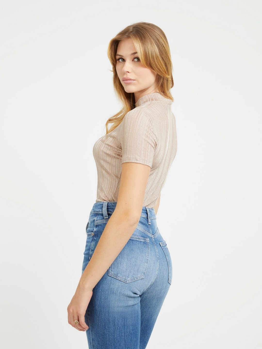 Beige Embellished High Neck Short Sleeves Top