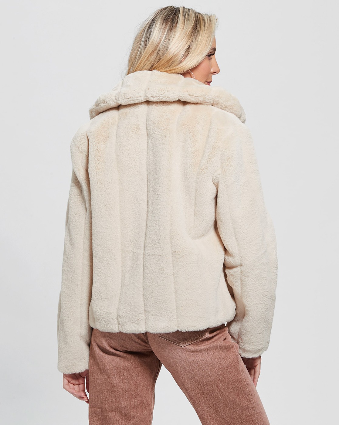 Beige Solid Collared Full Sleeves Faux Fur Jacket