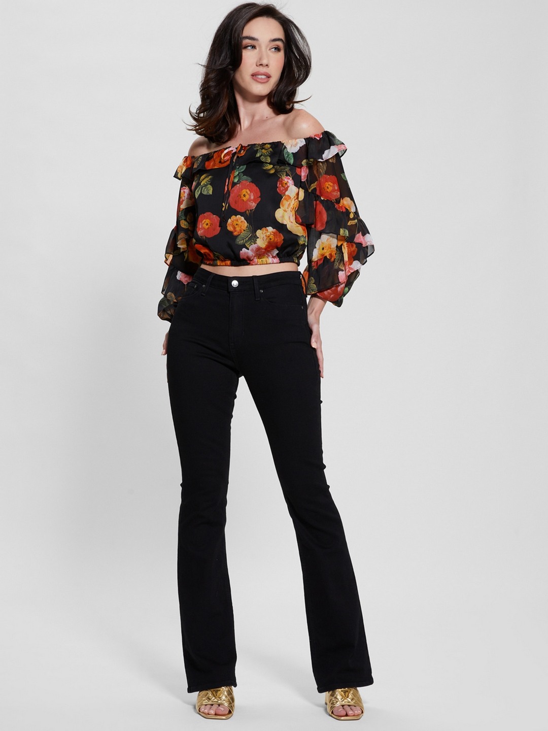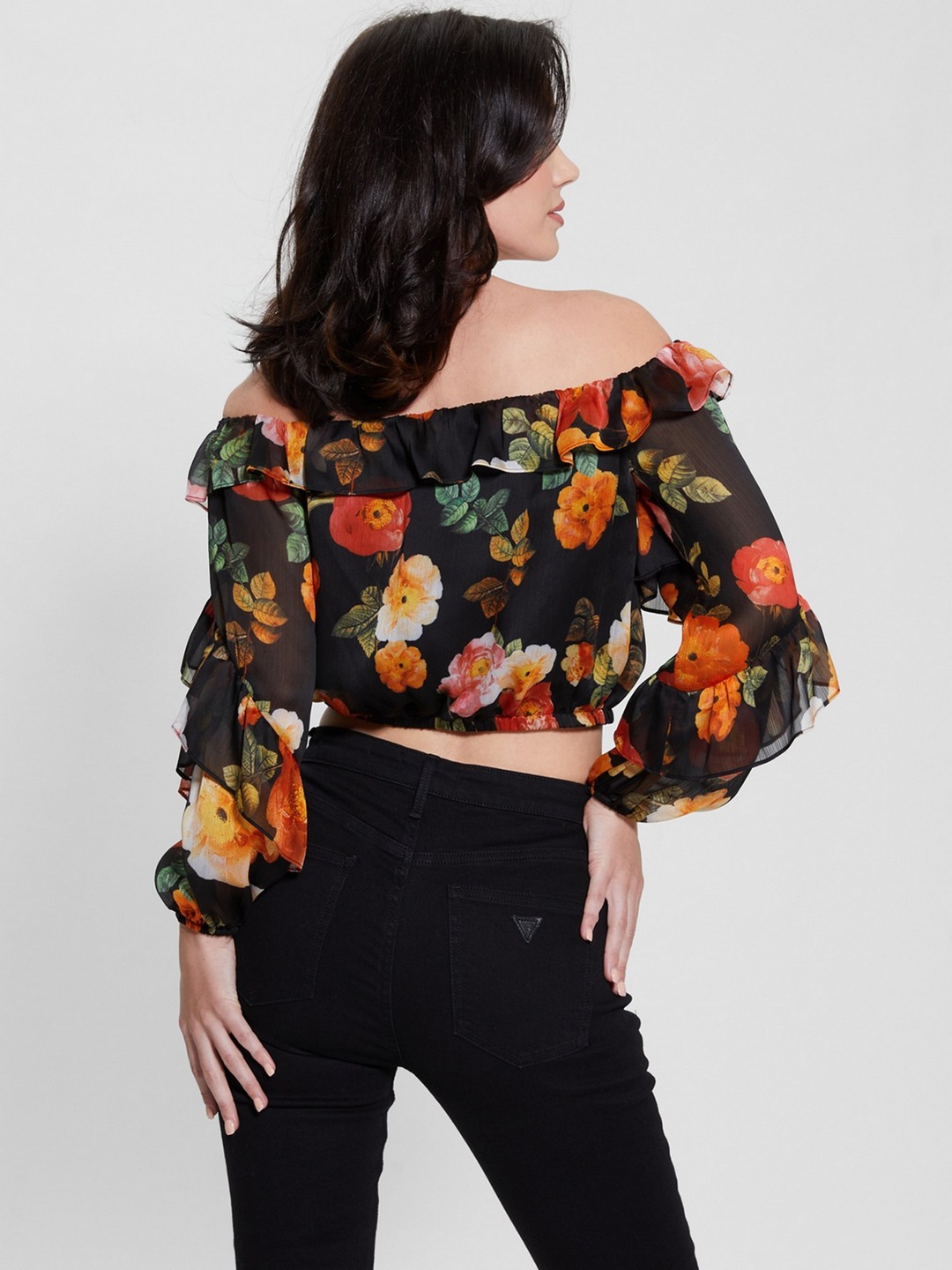 Black Printed Off Shoulder Full Sleeves Blouse Top