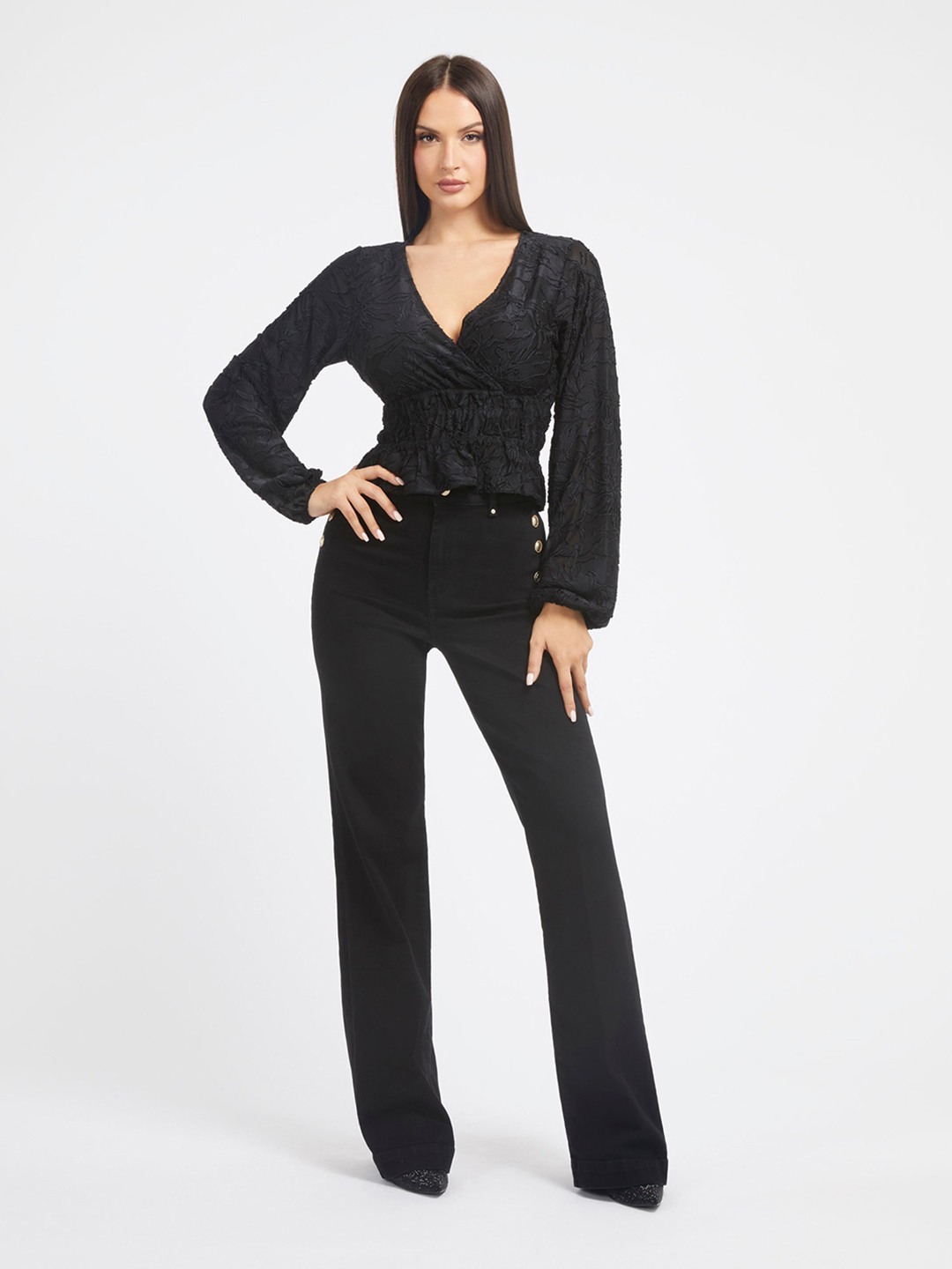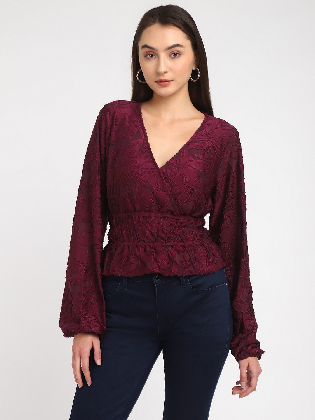 Black Self Design V-Neck Full Sleeves Wrap Top