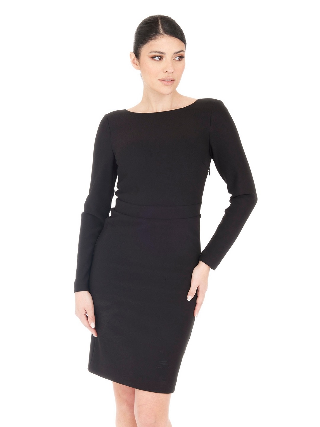 Elevate your wardrobe with our elegant black sheath dress, designed for the modern woman. This timeless piece features a flattering regular fit that gracefully contours your silhouette. Crafted from a premium polyester blend, it offers both comfort and style. The sophisticated solid pattern is complemented by long sleeves and a chic boat neck, making it perfect for any occasion. With its convenient pull-on closure, this dress ensures effortless elegance, whether you're at the office or a night out.