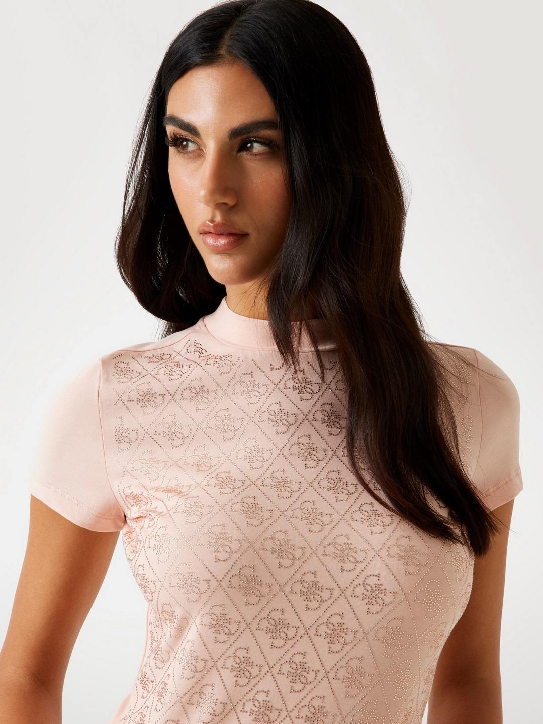 Elevate your wardrobe with our chic pink slim-fit T-shirt, designed for the modern woman. Featuring a stylish brand logo pattern, this top combines fashion and comfort effortlessly. The short sleeves and mock neck add a touch of sophistication, making it perfect for any occasion. Crafted from a premium cotton blend fabric, it offers a soft, breathable feel for all-day wear. The convenient pull-on closure ensures easy dressing. Ideal for pairing with jeans or skirts, this versatile piece is a must-have addition to your collection.