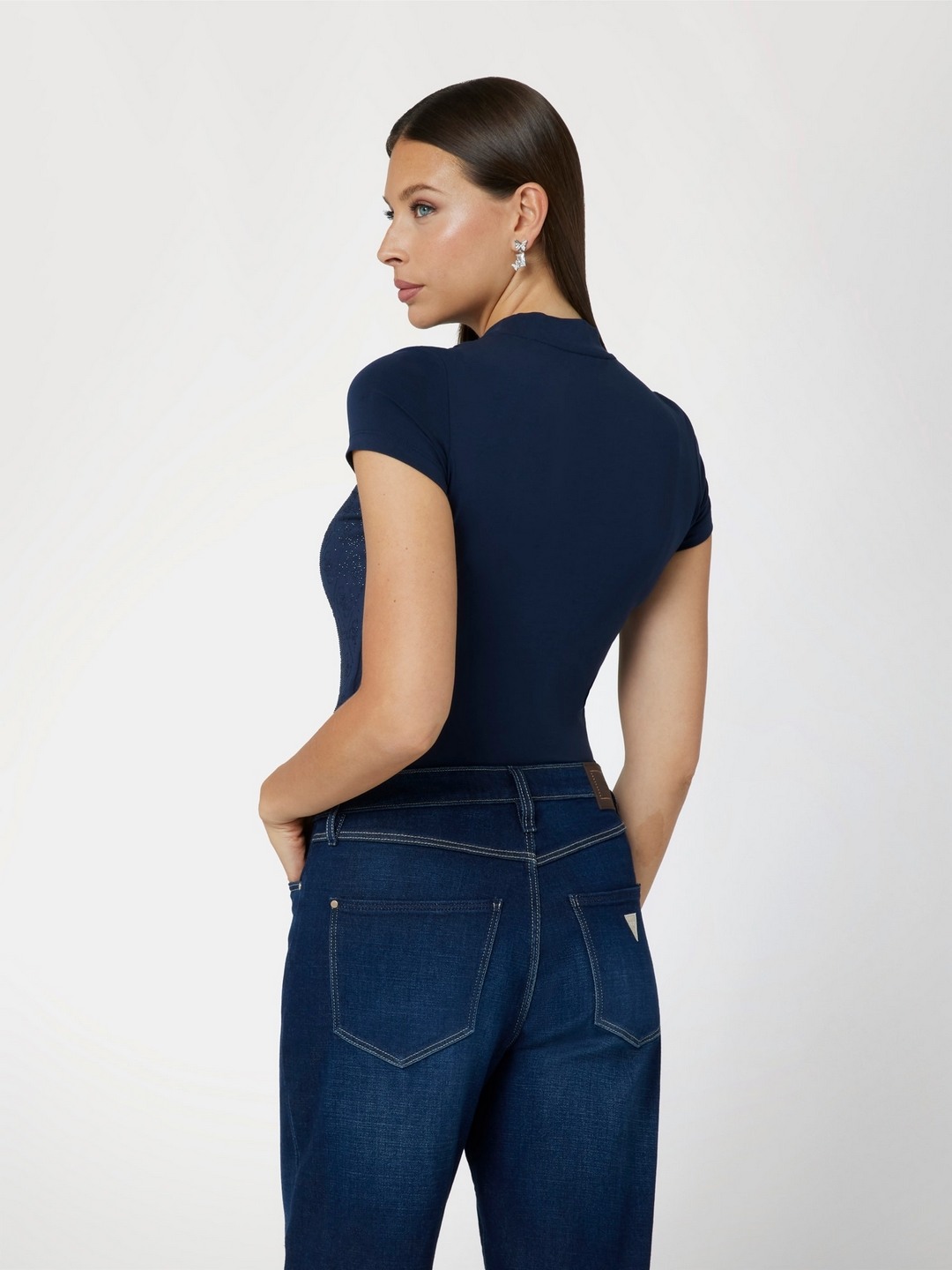 Elevate your wardrobe with our chic navy blue slim-fit T-shirt, designed for the modern woman. Featuring a stylish brand logo pattern, this top combines elegance with a contemporary edge. The short sleeves and mock neck add a touch of sophistication, making it perfect for any occasion. Crafted from a premium cotton blend fabric, it ensures comfort and breathability throughout the day. The convenient pull-on closure offers ease of wear, while the tailored fit accentuates your silhouette. Ideal for pairing with jeans or skirts, this versatile piece is a must-have addition to your collection.