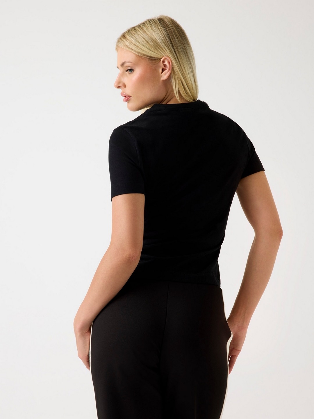 Elevate your casual wardrobe with our chic black T-shirt, designed for women who appreciate style and comfort. This regular-fit tee features a subtle yet striking brand logo pattern, adding a touch of sophistication to your everyday look. Crafted from premium cotton fabric, it ensures breathability and softness, making it perfect for all-day wear. The classic round neck and short sleeves offer a timeless silhouette, while the convenient pull-on closure provides ease of wear. Ideal for pairing with jeans or skirts, this versatile T-shirt is a must-have staple for any fashion-forward wardrobe.