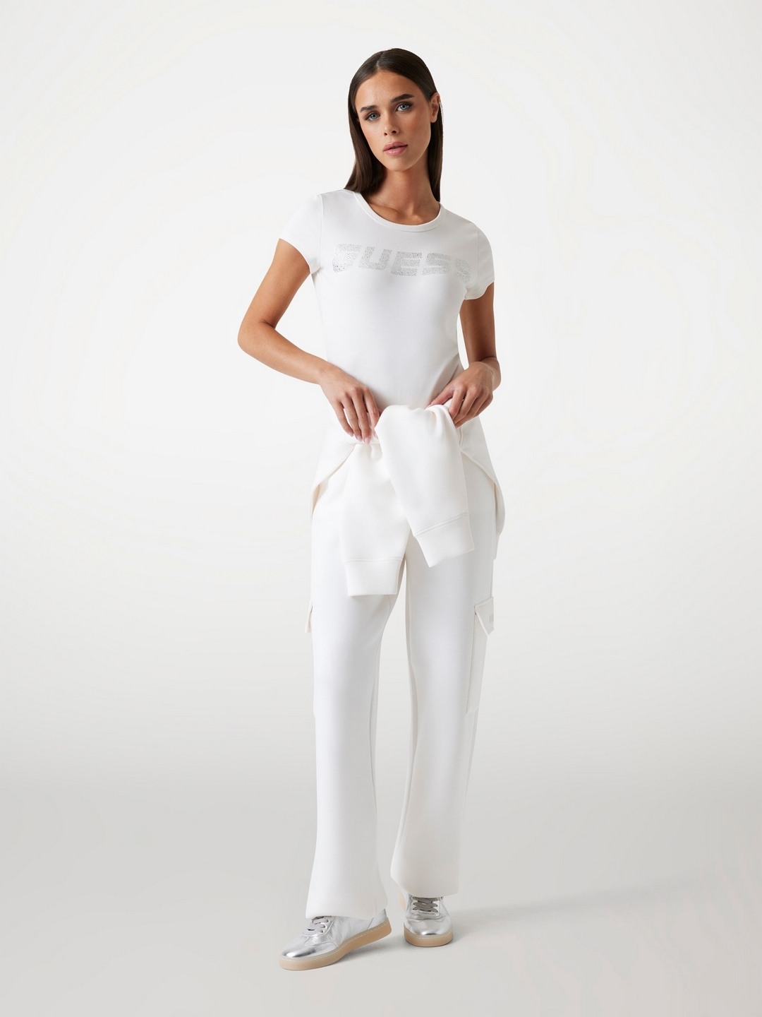 Elevate your casual wardrobe with our chic white T-shirt, designed for women who appreciate style and comfort. Featuring a regular fit, this tee showcases a trendy brand logo pattern that adds a touch of sophistication to any outfit. Crafted from a premium cotton blend fabric, it ensures breathability and softness for all-day wear. The short sleeves and classic round neck offer a timeless silhouette, while the convenient pull-on closure makes dressing effortless. Perfect for pairing with jeans or skirts, this versatile T-shirt is a must-have staple for every fashion-forward woman.