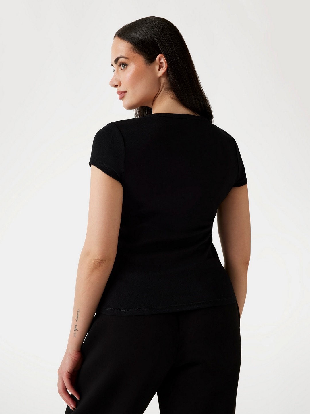 • Elevate your casual wardrobe with our chic black T-shirt, designed for the modern woman who values both style and comfort. This regular-fit tee features a subtle yet striking brand logo pattern, adding a touch of sophistication to your everyday look. Crafted from a premium cotton blend fabric, it ensures breathability and softness, perfect for all-day wear. The short sleeves and classic round neck offer timeless appeal, while the convenient pull-on closure makes dressing effortless. Ideal for pairing with jeans or skirts, this versatile piece is a must-have staple.